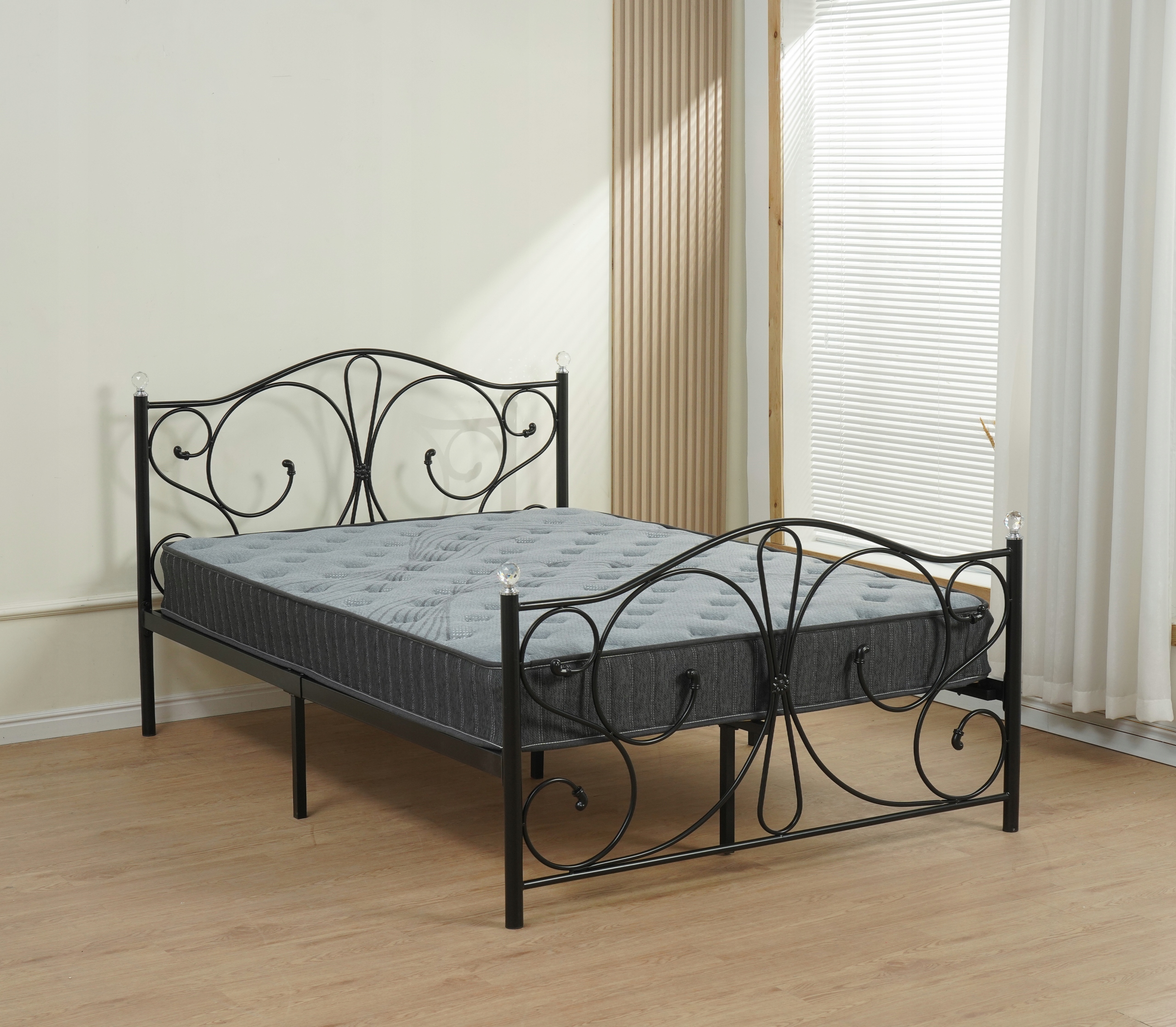 Чорне металеве ліжко, прикрашене красивими візерунками.