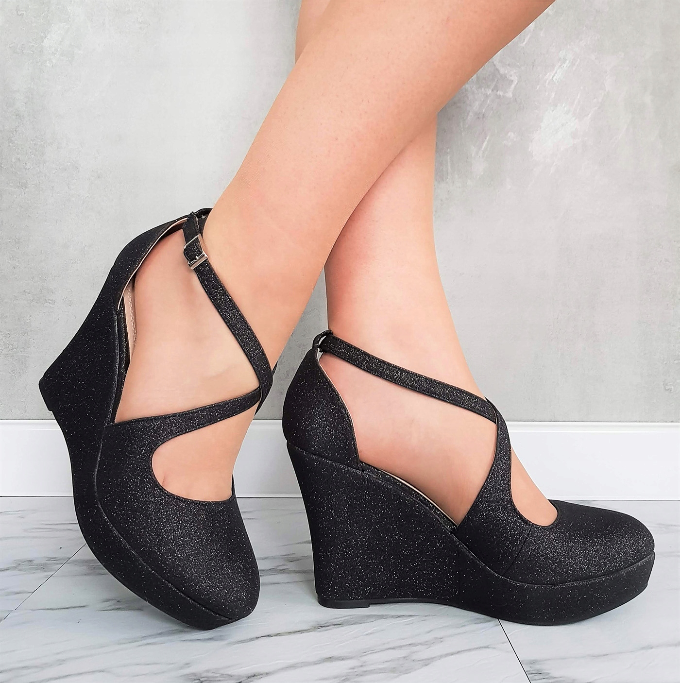 ***** ФАНТАСТИЧНЕ ВЗУТТЯ *****Чудові чорні туфлі на зручній танкетці та платформі з елегантної парчової екошкіри. Вони чудово виглядають на ногах.