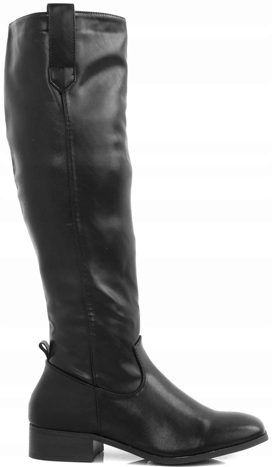 чоботи з низьким підбором. З верхнім кінцем на коліні, квадратним носком і зшиванням і клаптями у верхньому краю. Закріплений блискавкою. Ізольований ковдрою взуття зсередини. Зроблено з еко -ланцюга.