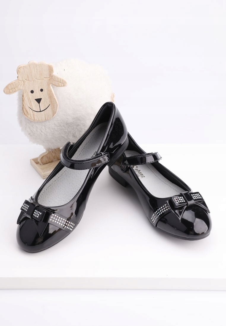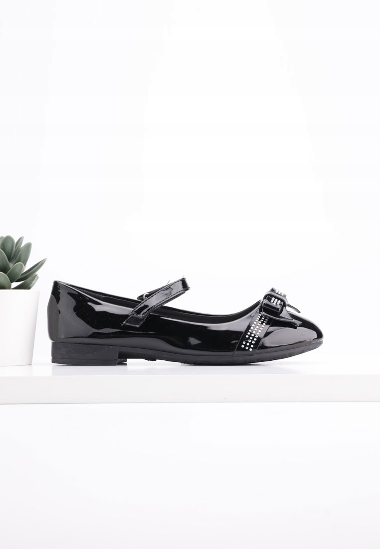 Дівчачі балетки з круглим носком. Верх лакований, устілка з екошкіри. Носок взуття прикрашений бантом і смужкою циркону. Застібається на вузьку липучку. Вони ідеально виглядатимуть для особливих випадків.