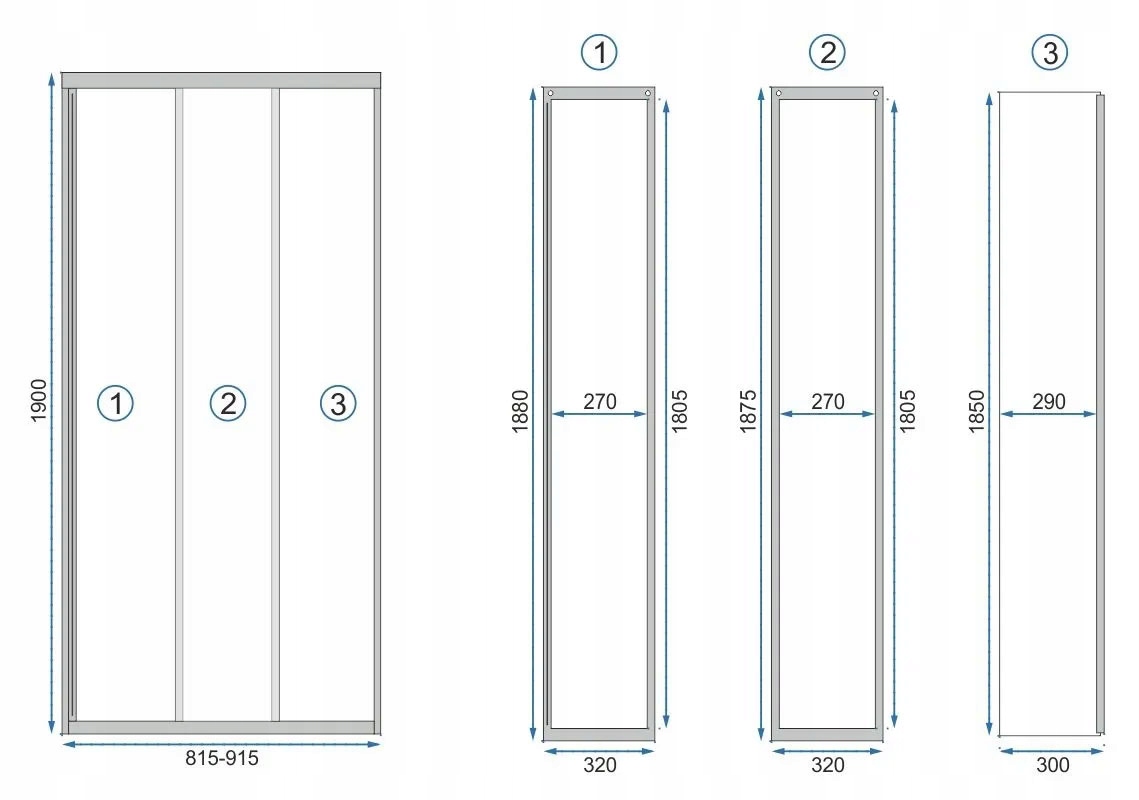 - Дверцята: рама , 3-елементний, один фіксований елемент, два розсувні елементи /верхні ролики, нижні повзунки/