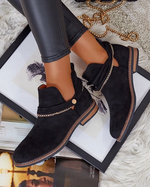 Стильні жіночі ботильйони з еко-замші з устілкою з натуральної шкіри - ідеальне рішення для холодних днів. Модель сліпони з декоративними ланцюжками зверху. Взуття на плоскому каблуці і круглому носку. Чудове доповнення до вашого повсякденного одягу!