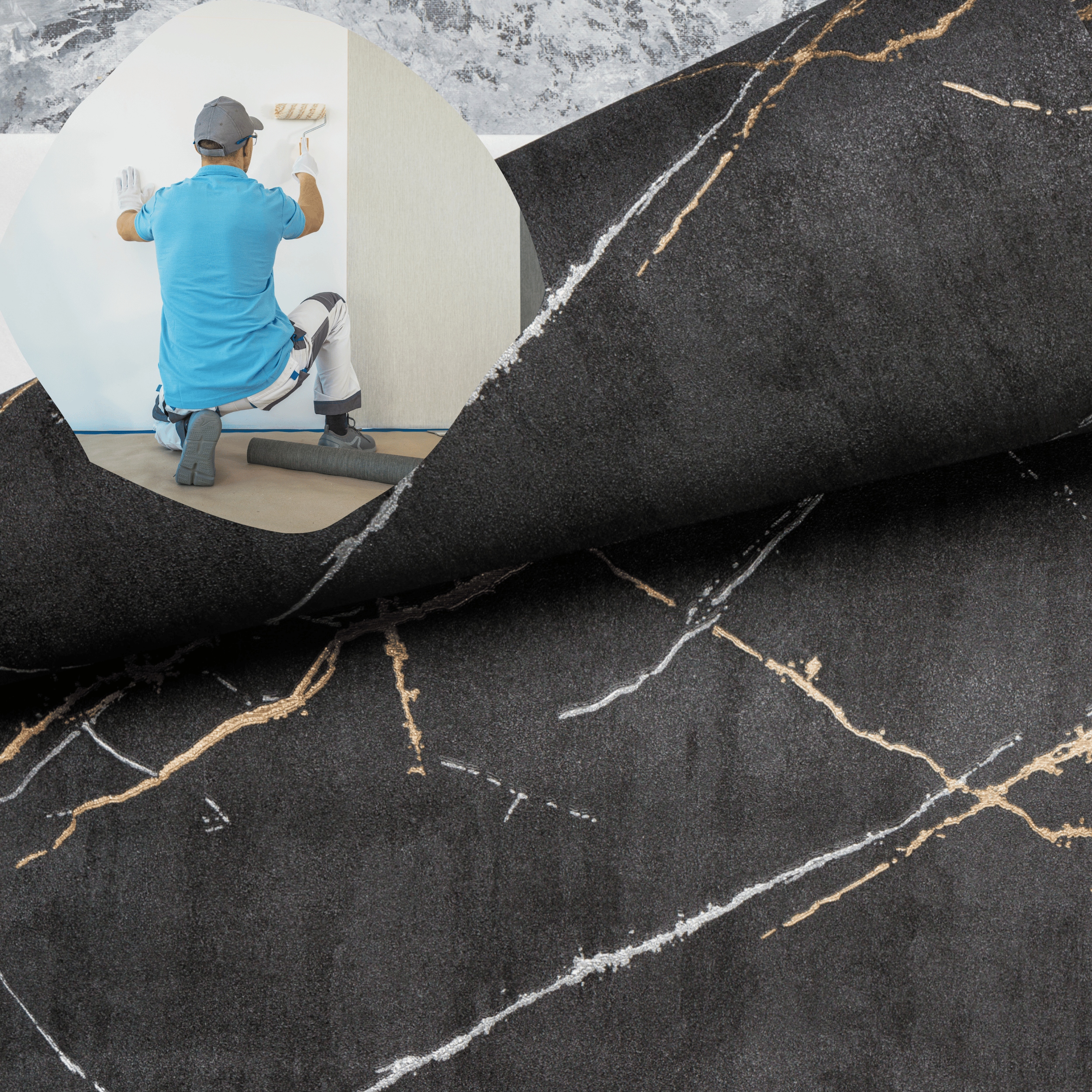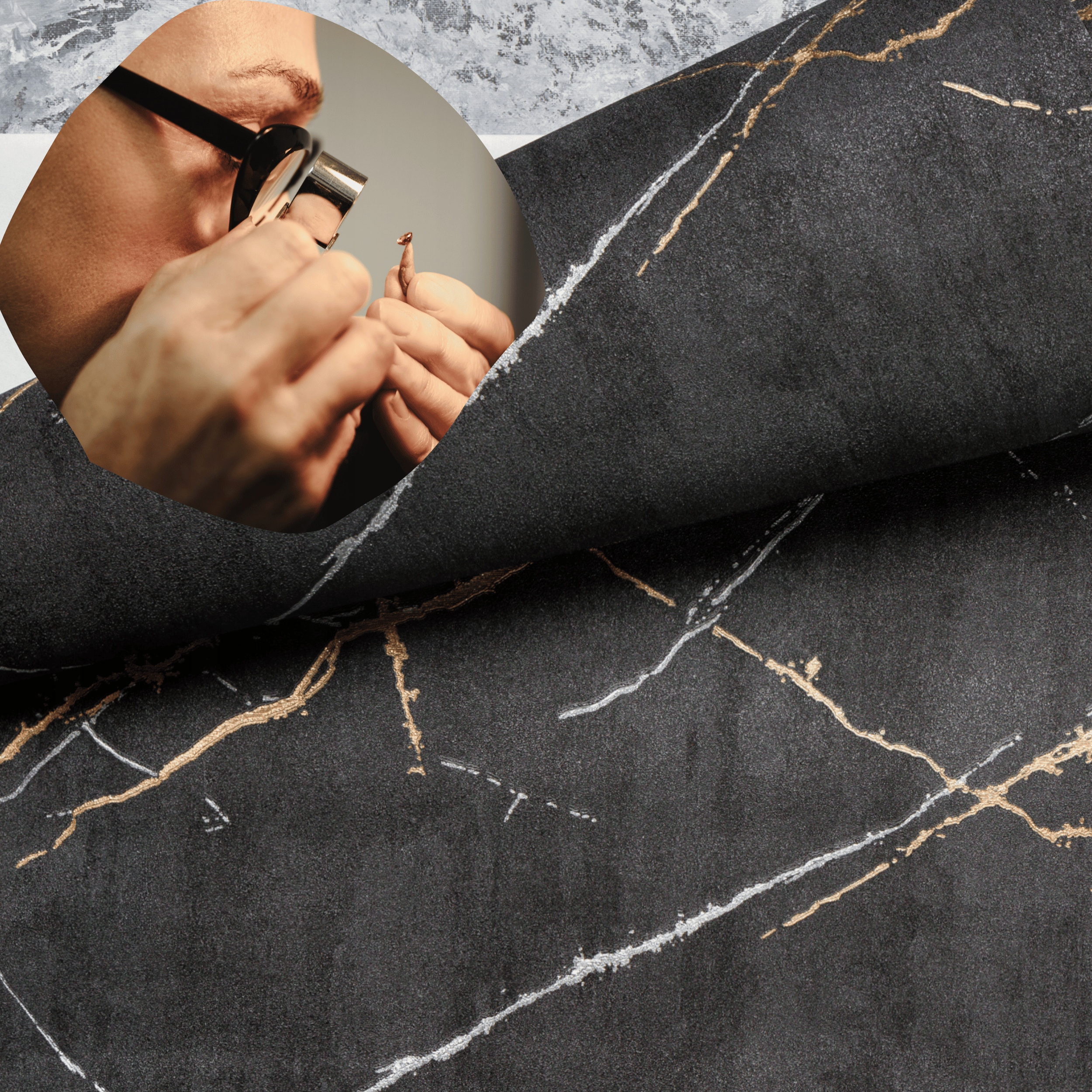 шпалери відрізняються унікальним малюнком, який поєднує імітації стіни, мармуру та бетону. Її чорна основа з тонкими потертоми в відтінках срібного золота створює глибину та тривимірну ефект. Завдяки цьому, навіть найпростіший інтер’єр набере вираз, а стильні деталі змусять кожен елемент домовленості взяти на себе нове значення.