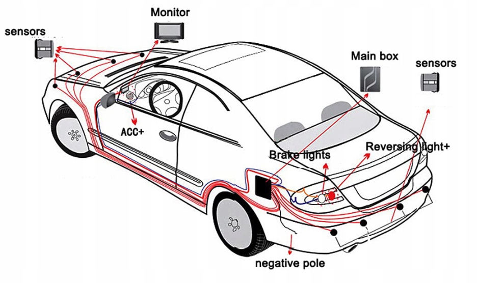 - 8 x чорні датчики паркування (довжина кабелю переднього датчика 6,3 м, заднього датчика довжина кабелю 2,3 м)
