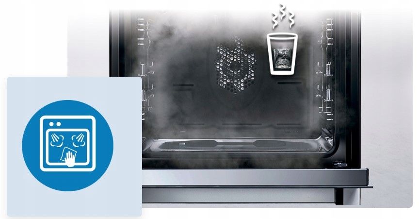 Ви можете легко очистити цю духовку завдяки тихій потужності пари. Просто налийте трохи води в камеру духовки та ввімкніть відповідну програму, щоб пара осідала на стінки, полегшуючи їх очищення.