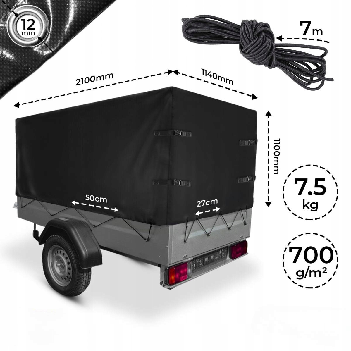 Захистіть навантаження під час транспортування за допомогою брезенту для причепа. Це аксесуар, який повинен кожен власник причепа, щоб захистити навантаження від будь -яких погодних умов під час транспорту та можливих збоїв. Кожна сторінка була зміцнена круглими очима з алюмінію діаметром 12 мм, щоб ви могли за допомогою гнучкого кабелю для прикріплення брезенту до причепа. Задня частина брезенту має чотири кріпильні ремені, які захищають товари та дозволяють легко отримати доступ під час завантаження та вивантаження. 750, An750