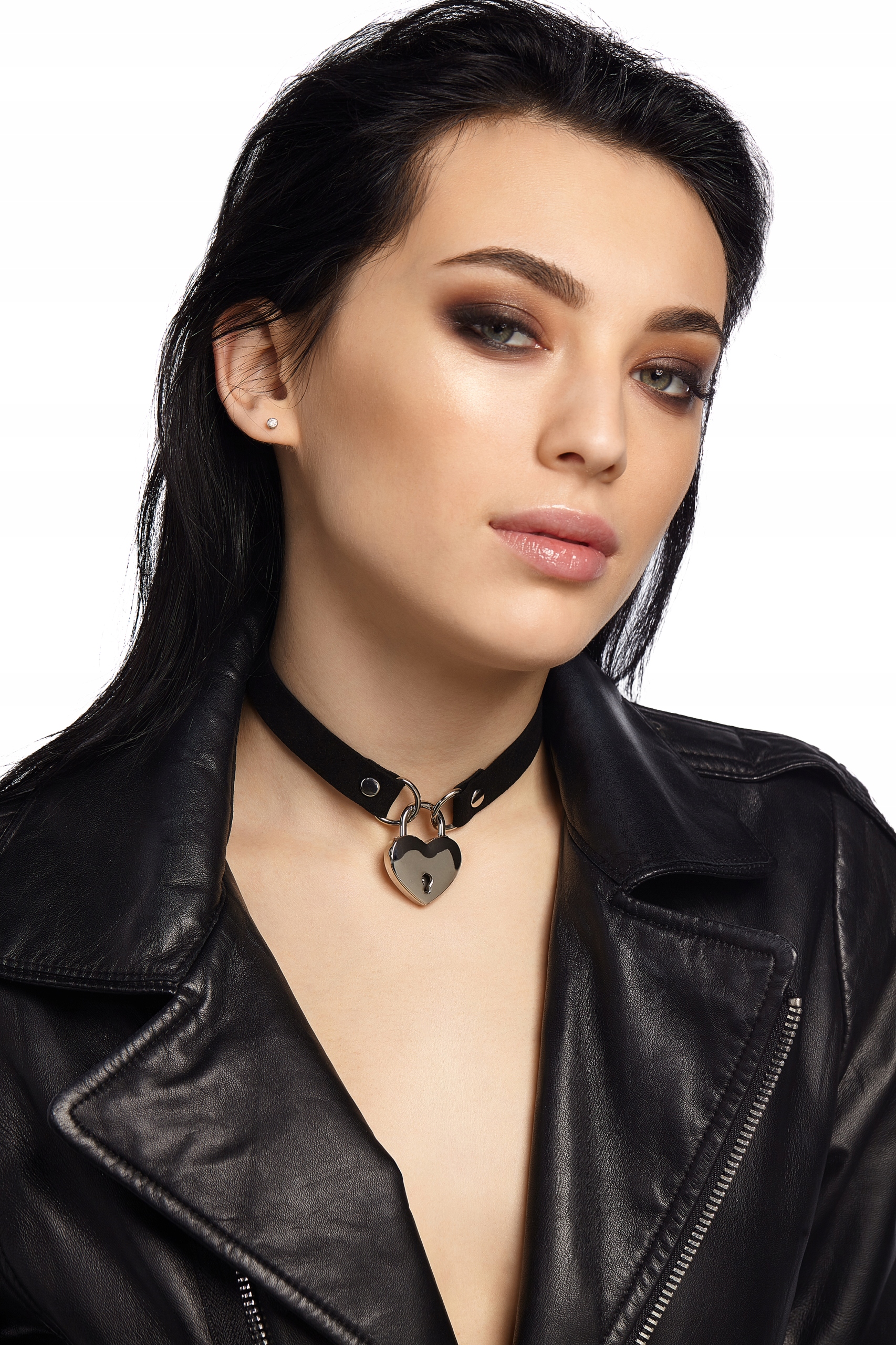 ➤ чокер, виготовлений з м'якої замші. Застібка -це замок, укладений серцем, який також служить кулоном. Набір включає 2 мініатюрні клавіші. Вага чокера - 30 грам. Особливості