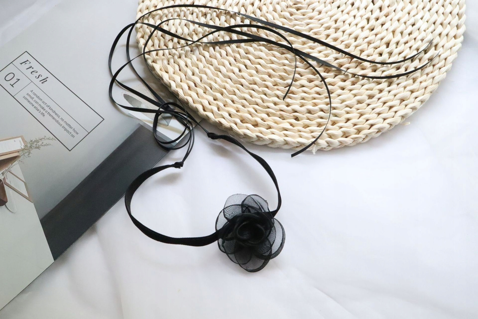 Тема пропозиції - це чорношкірий чокер/ намисто, прикрашений квіткою.