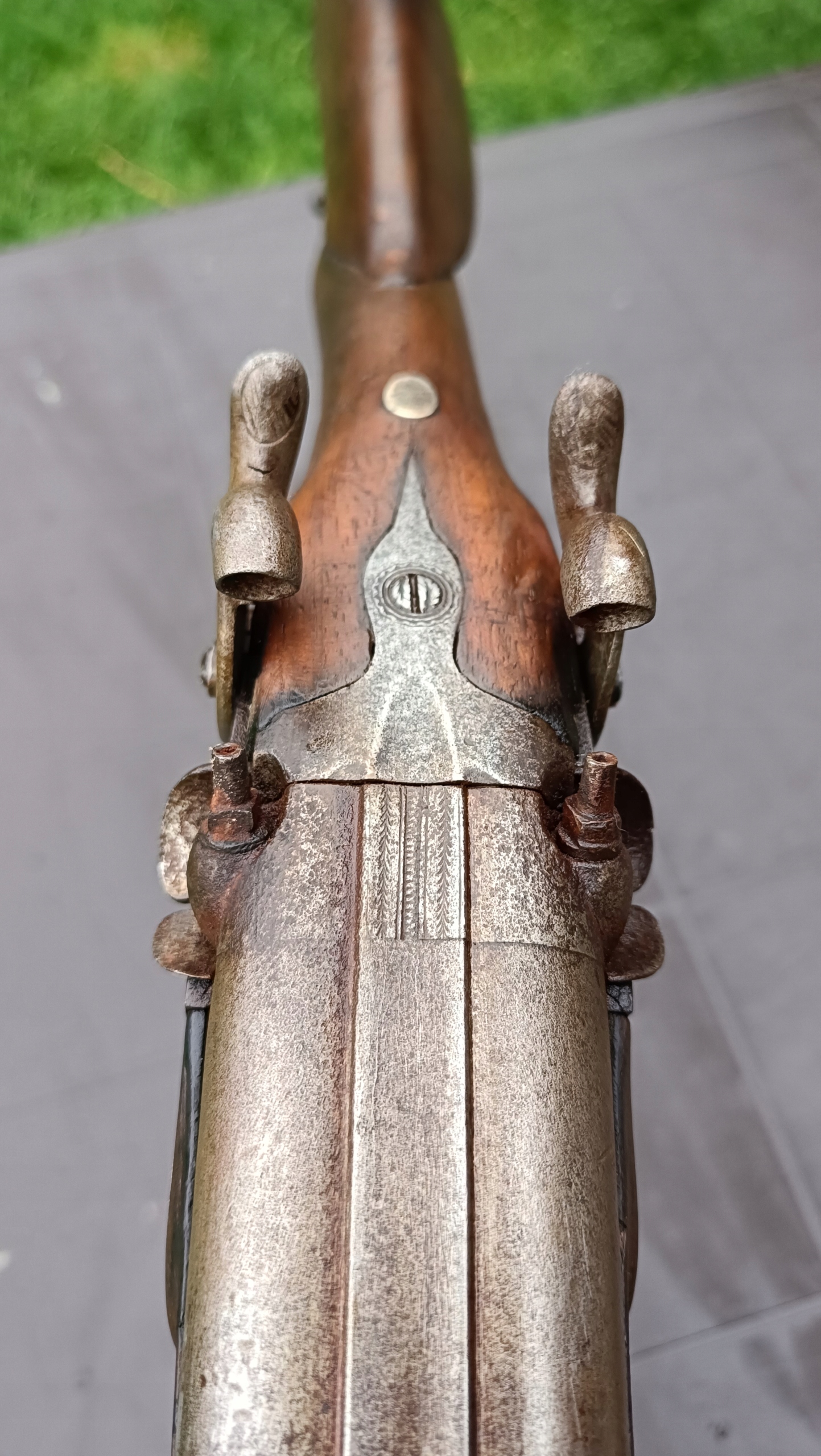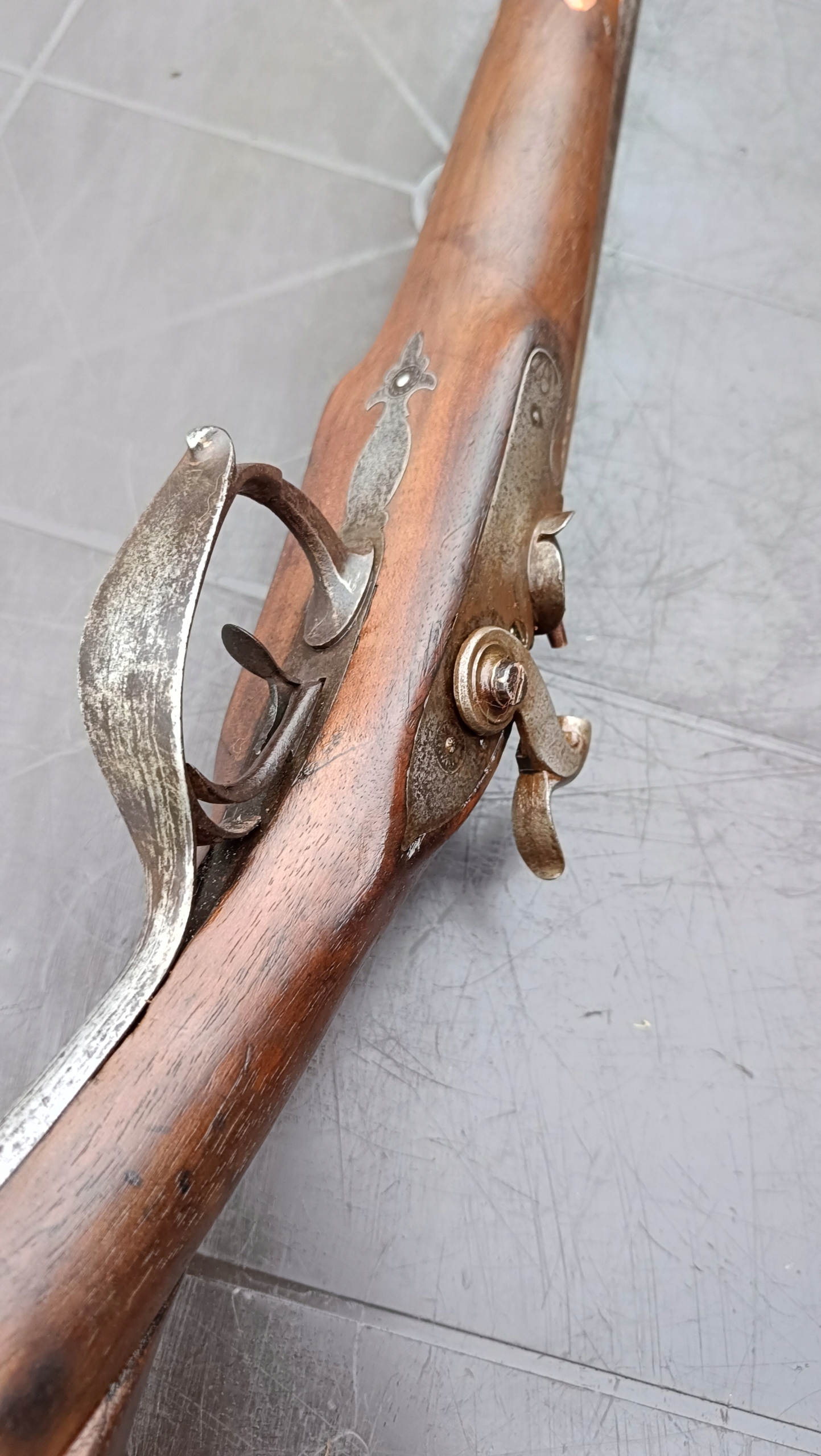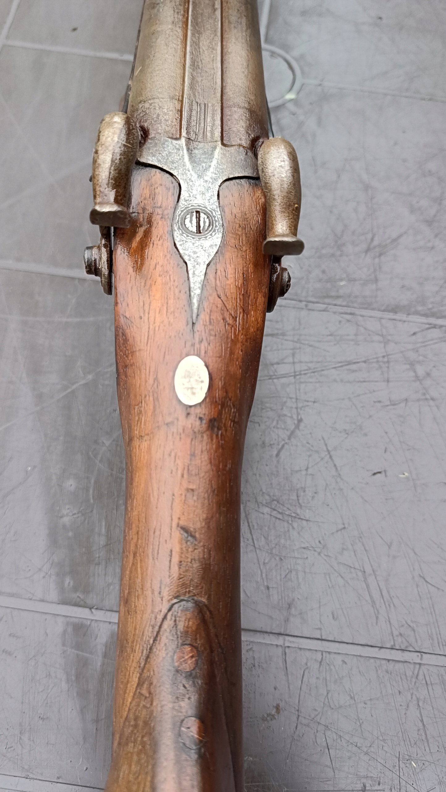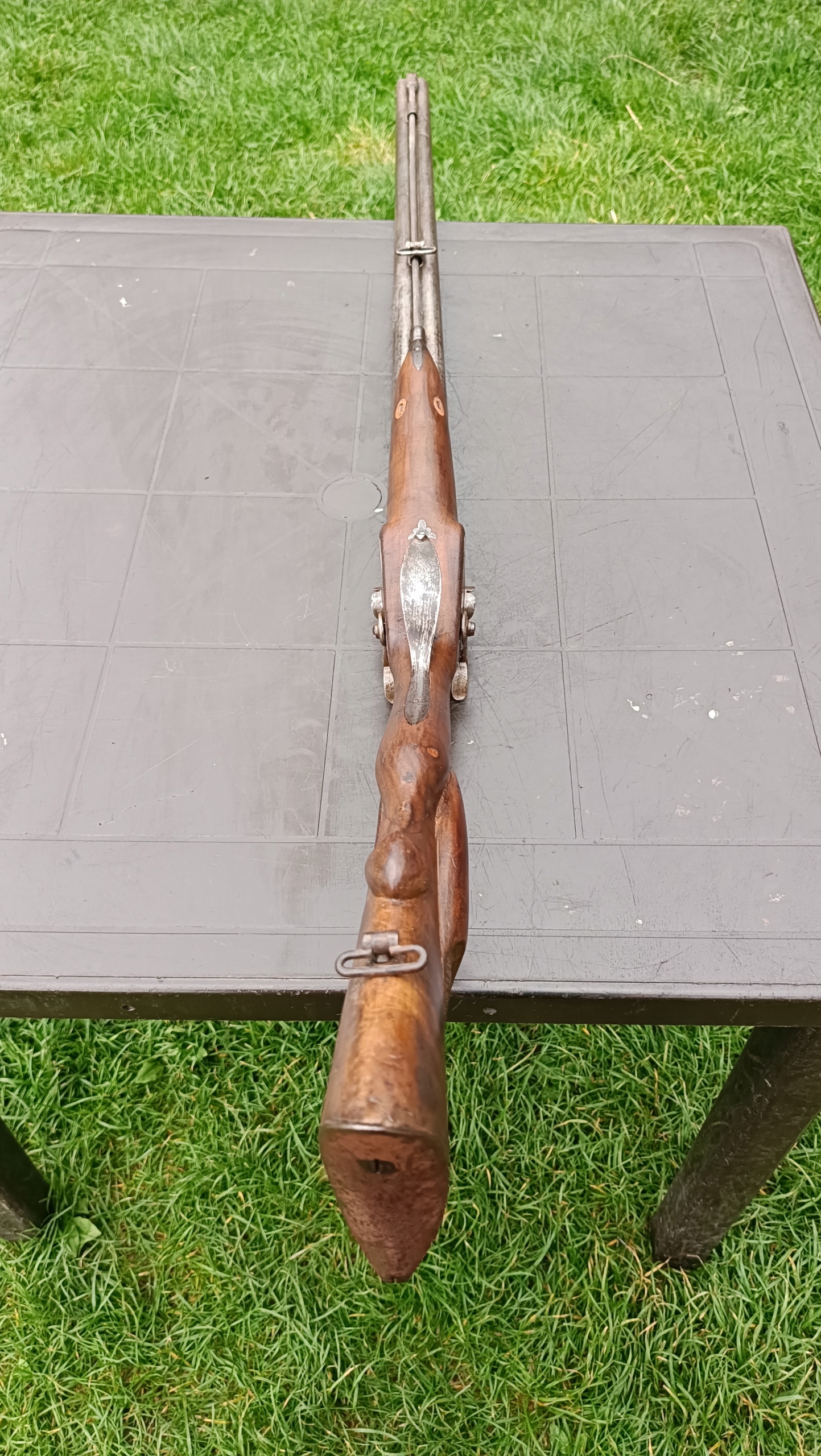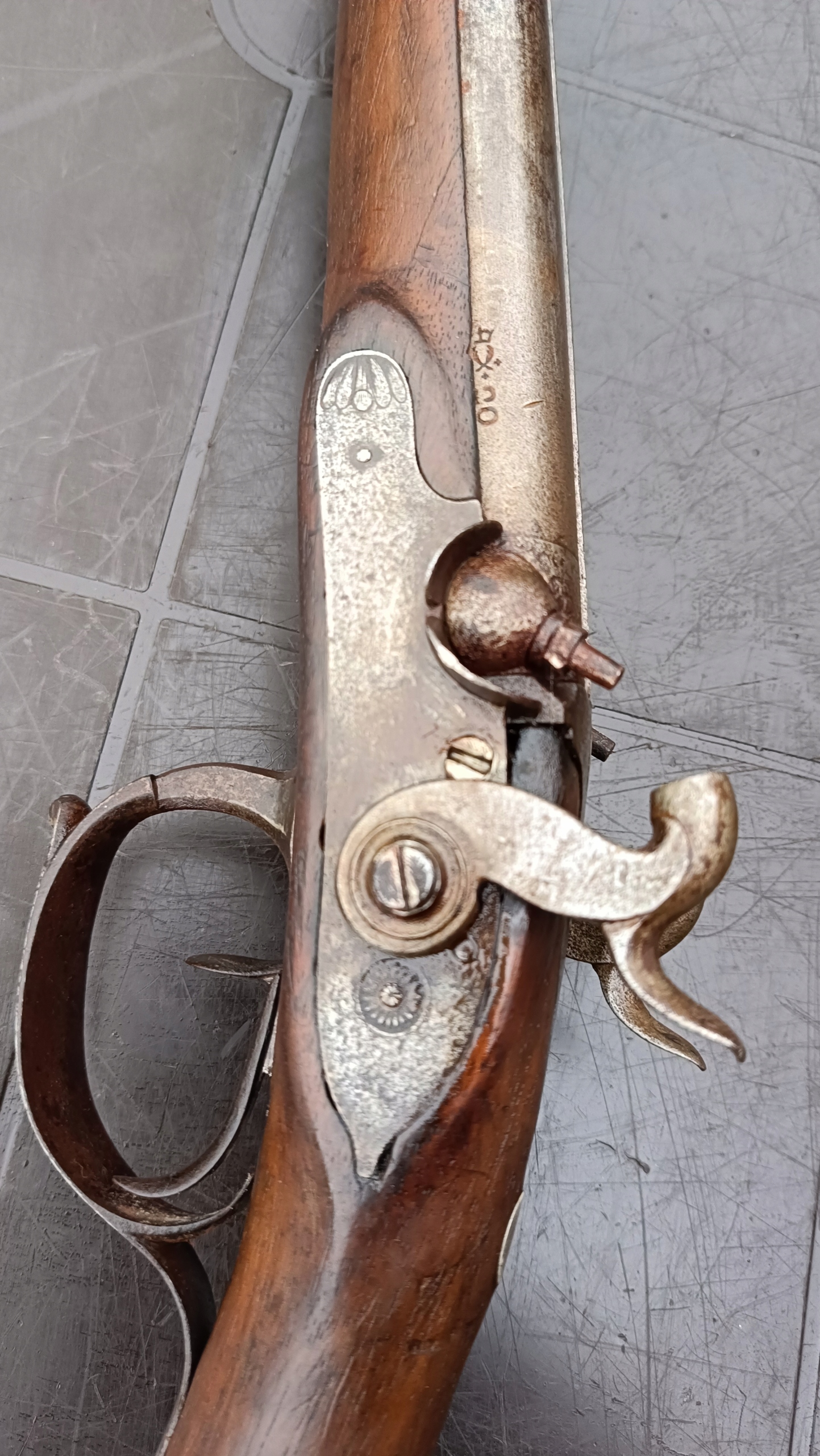 завантажений з фронту. Можна вистрілити сухий постріл, подвійне напруження. Купики працюють добре - на знімках видно невелика тріщина. Пряма бочка в хорошому стані. Дерево було зламано- сліди професійного ремонту. Каміни добре.