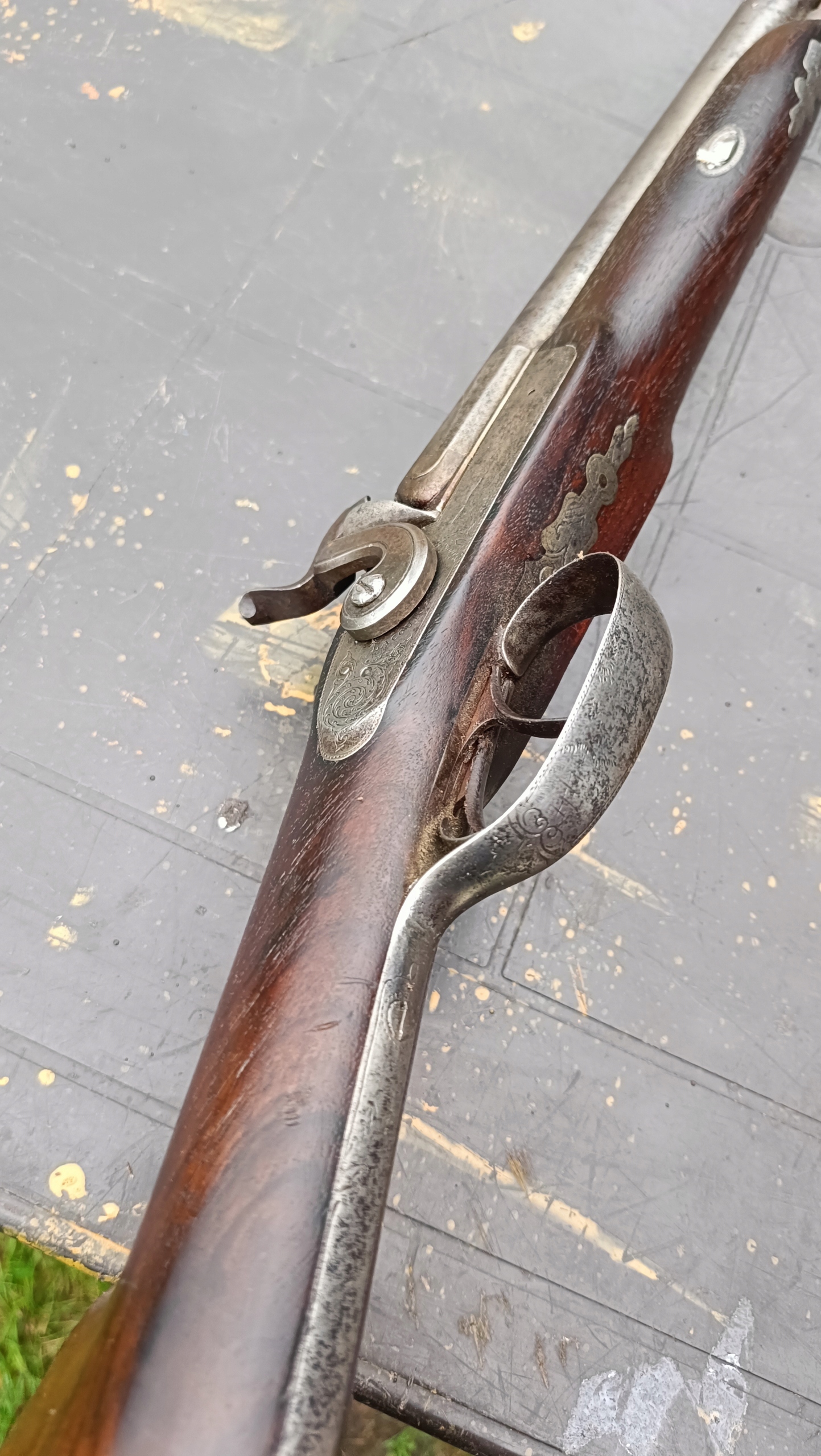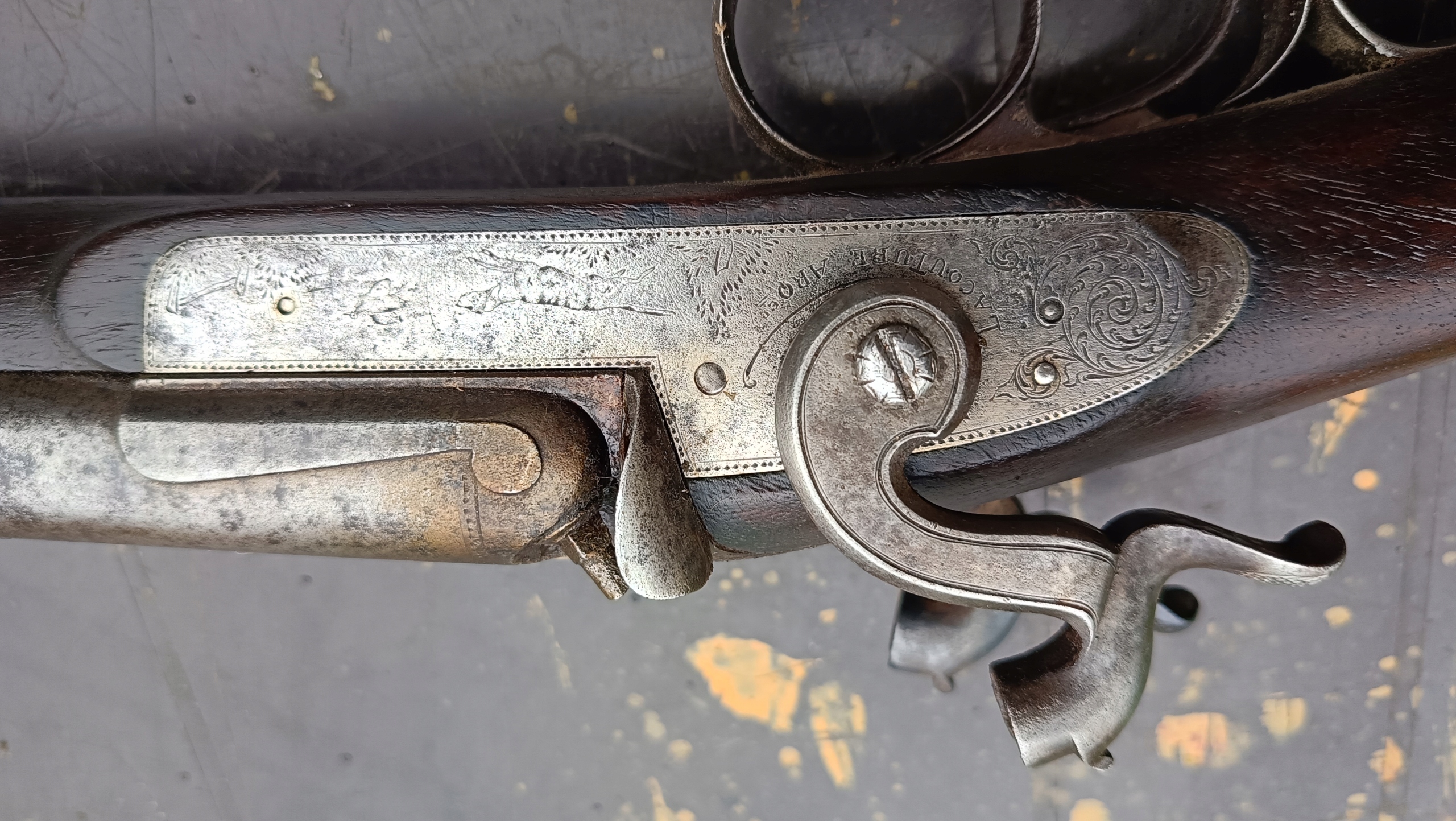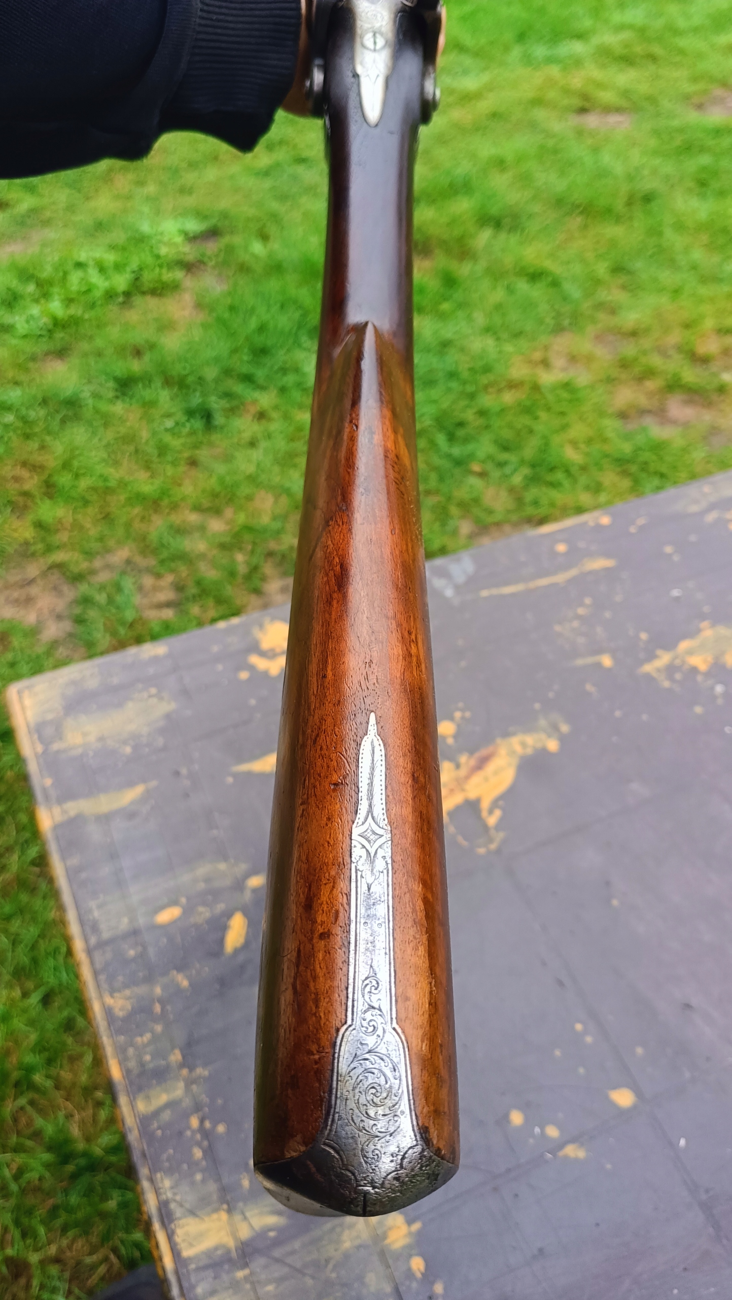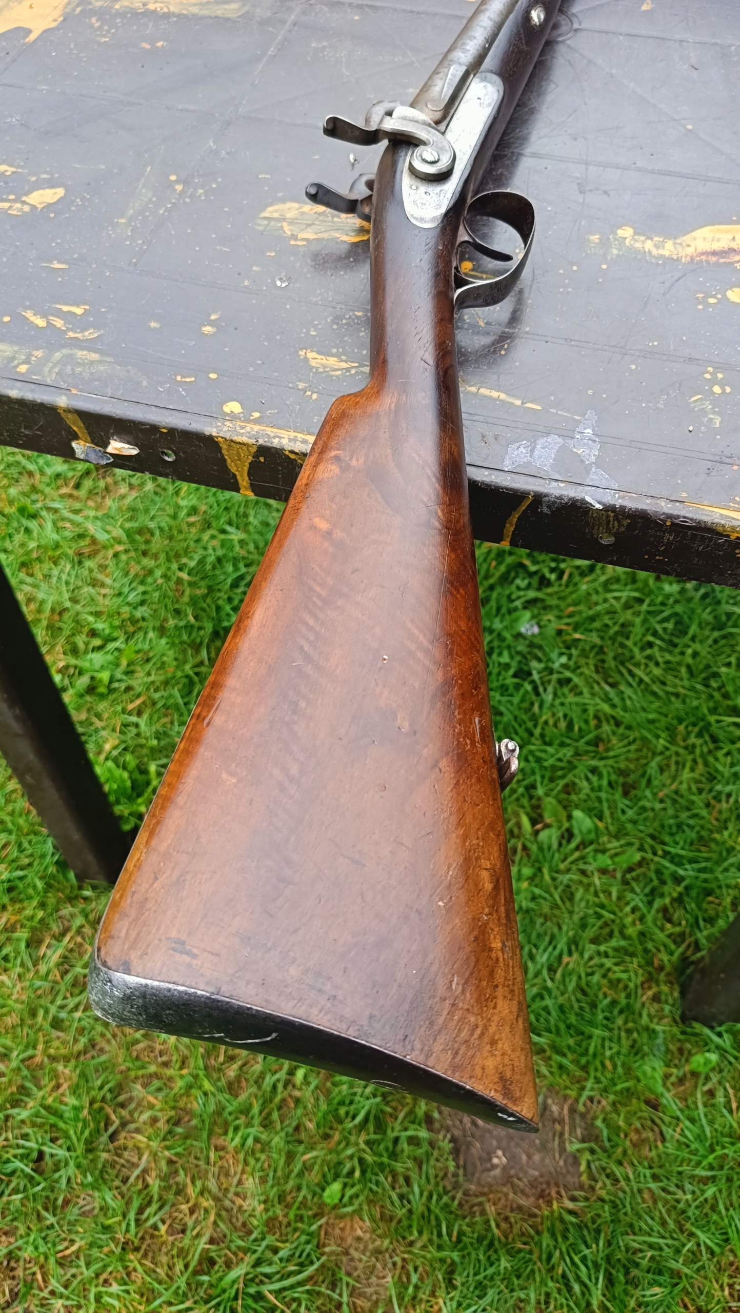 завантажено з фронту. Можна вистрілити сухий постріл, подвійне напруження. Замки тригера затягуються двома брусками. Проста бочка, невелика вм'ятина, видно на фотографії. Дерево в хорошому стані.