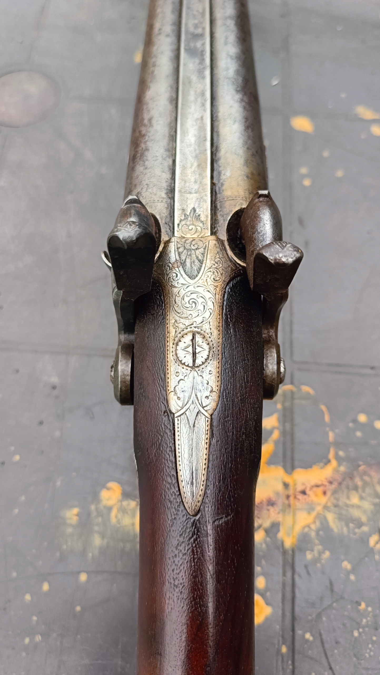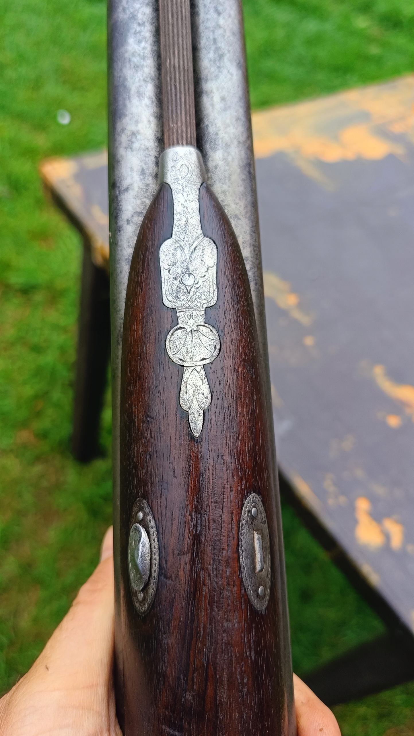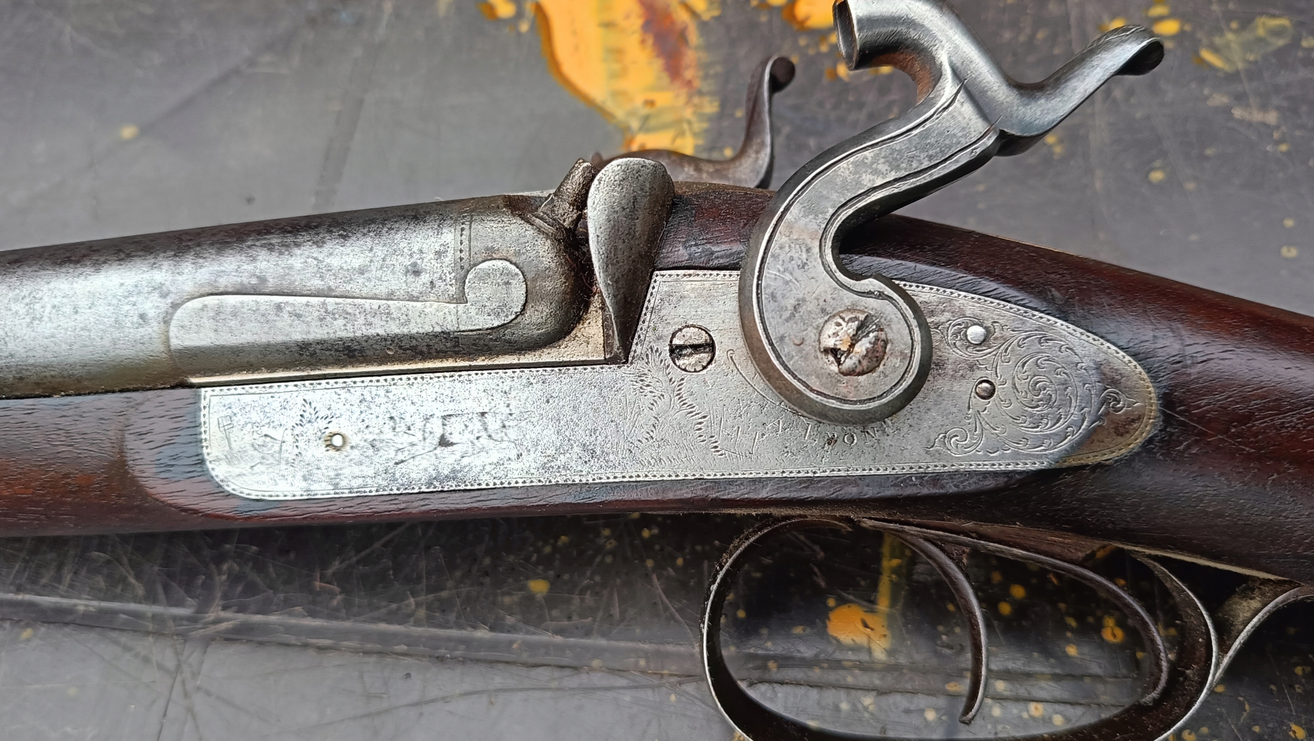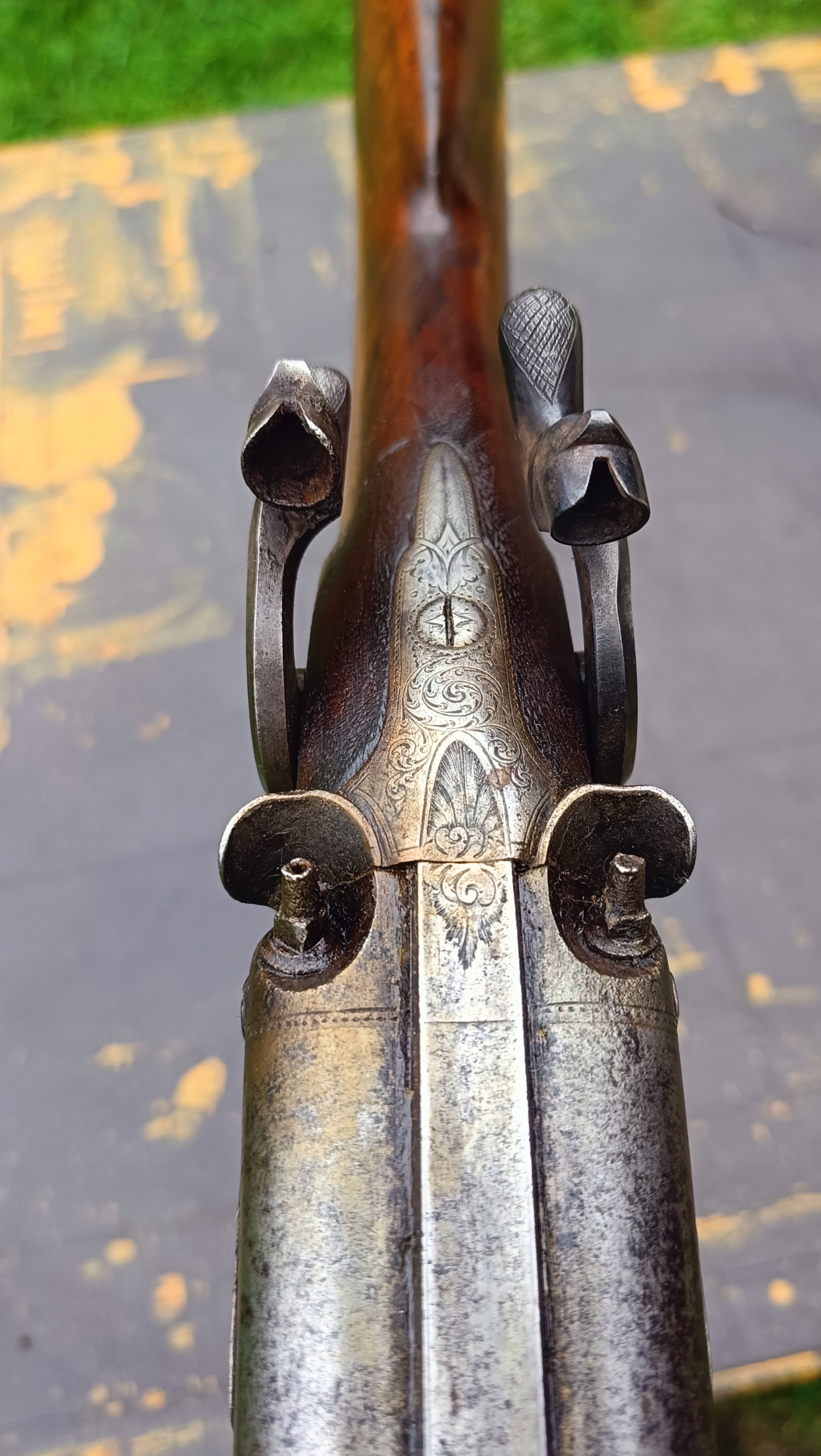 завантажено з фронту. Можна вистрілити сухий постріл, подвійне напруження. Замки тригера затягуються двома брусками. Проста бочка, невелика вм'ятина, видно на фотографії. Дерево в хорошому стані.
