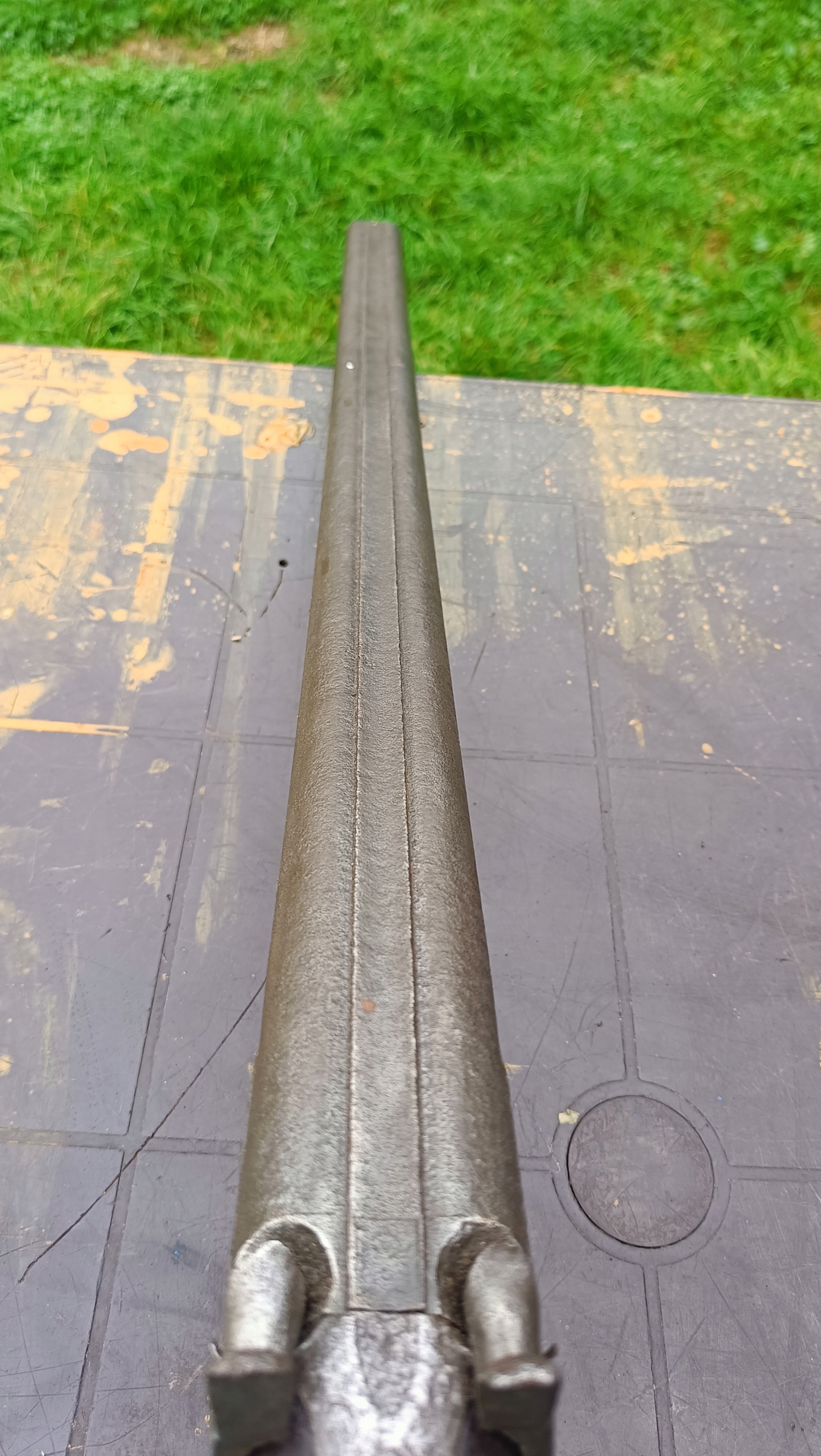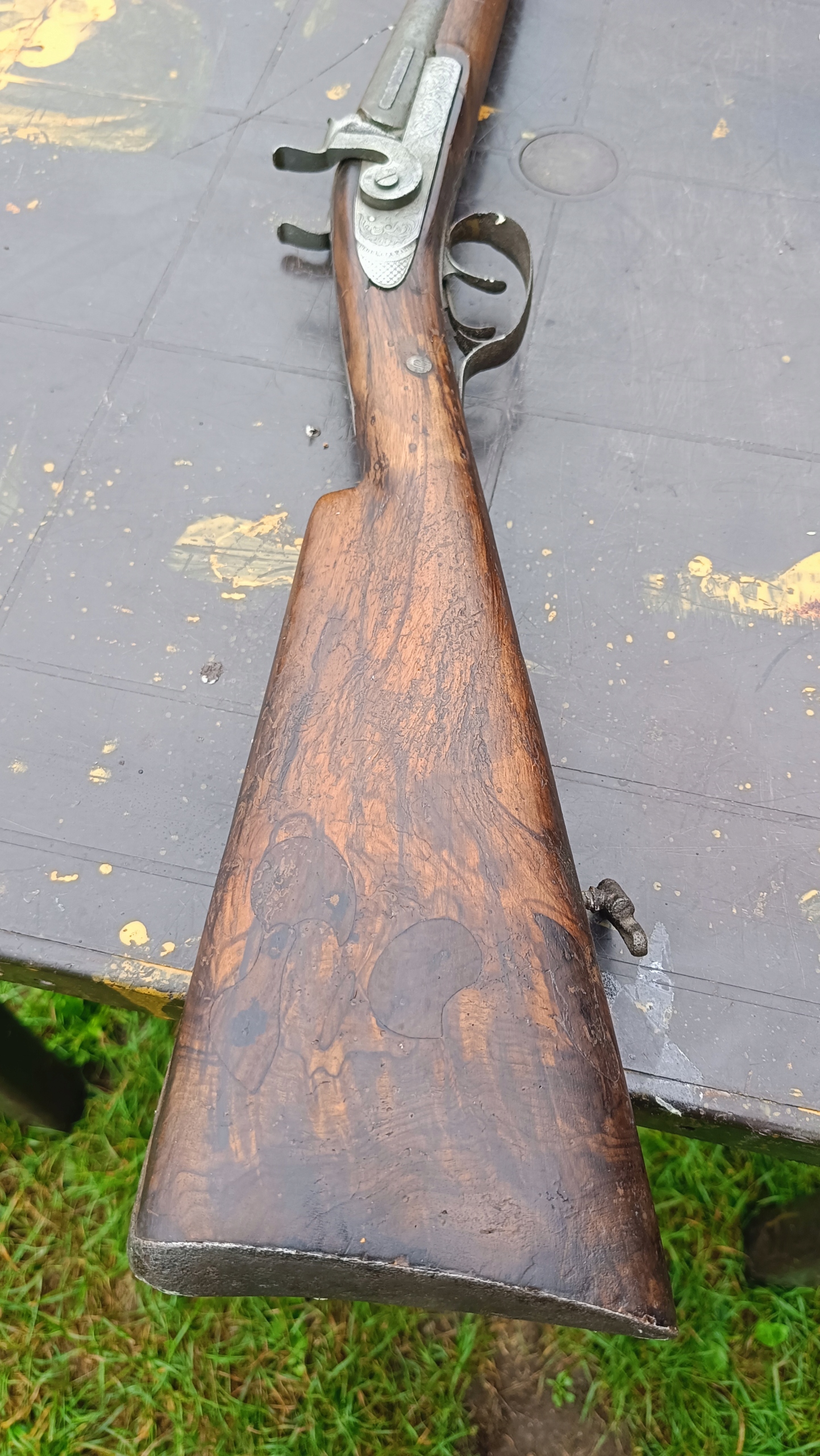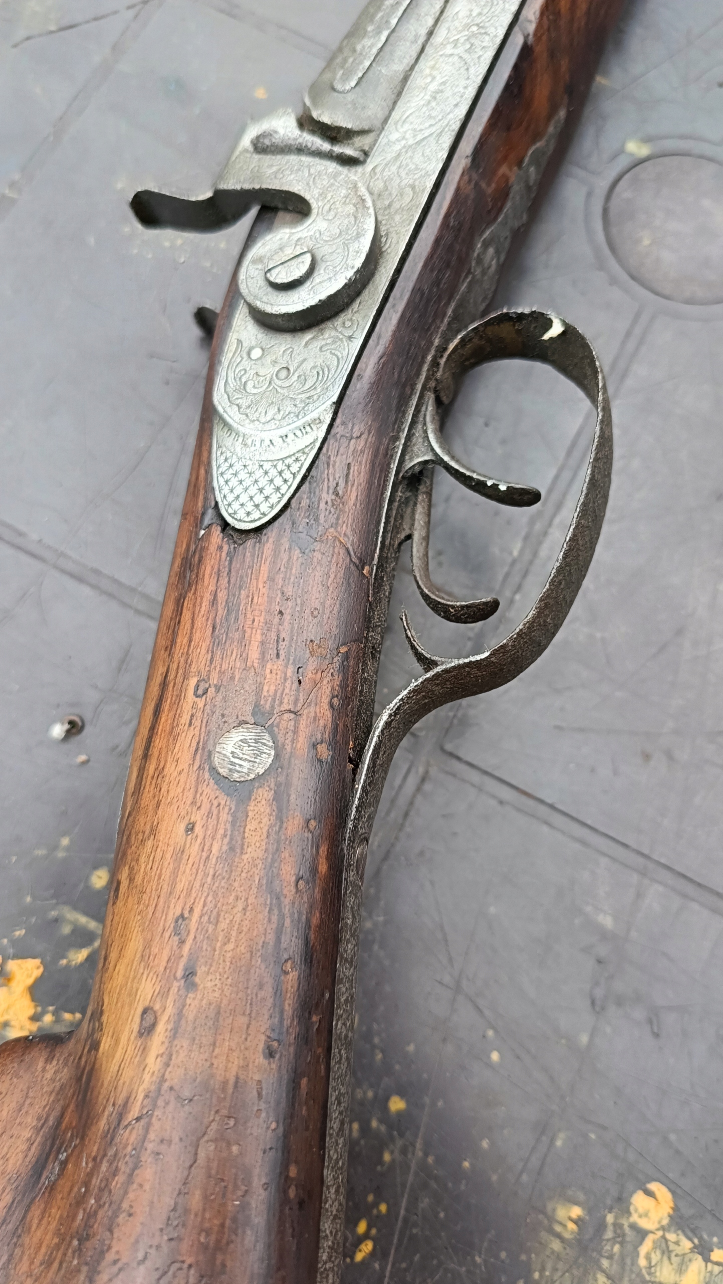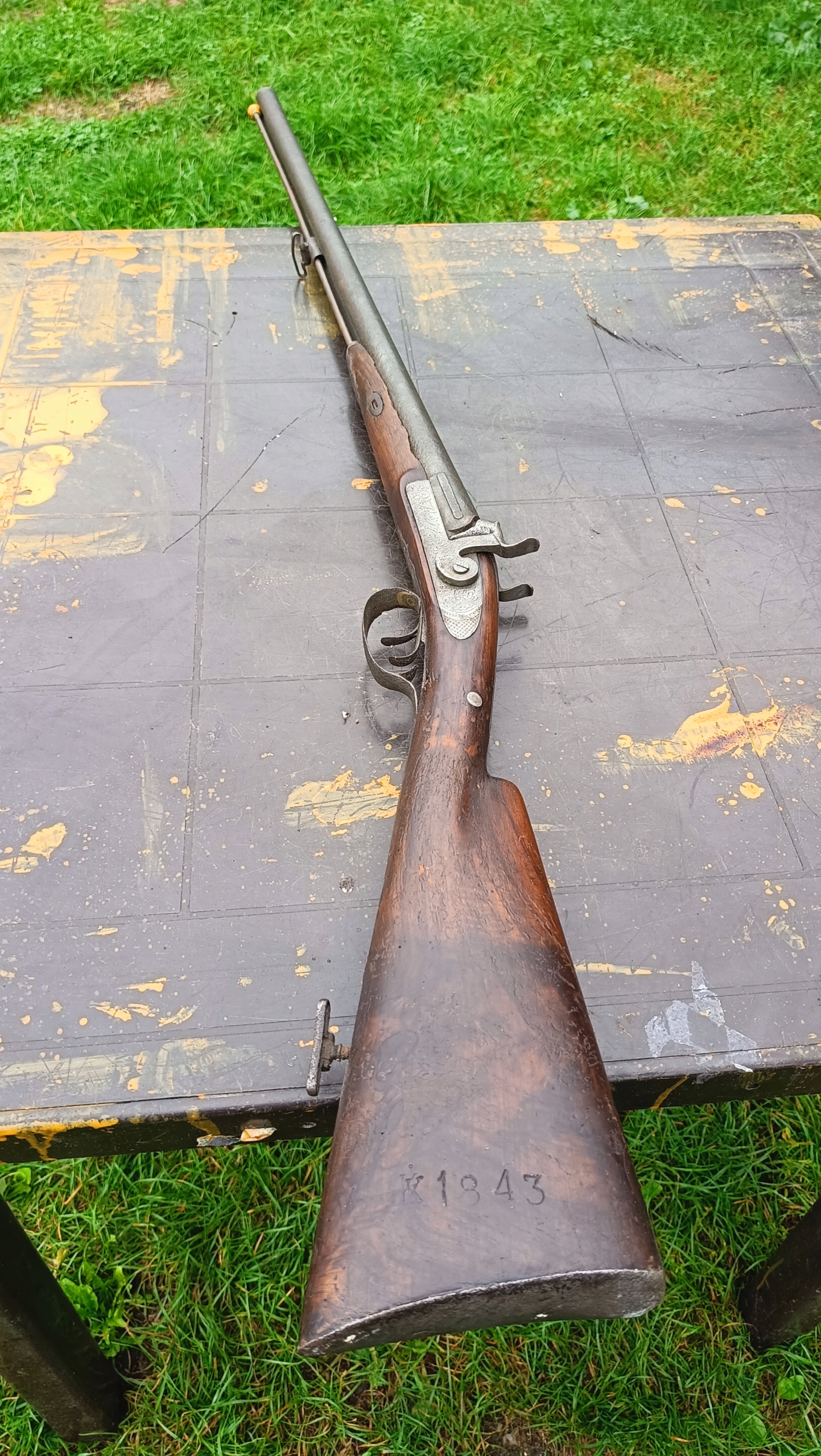 завантажено з фронту. Можна вистрілити сухий постріл. Замки тригера затягуються двома брусками. Весь бочка має піттерів, які запобігають використанню цієї зброї. Дерево, як ви бачите на знімках, було відремонтовано.