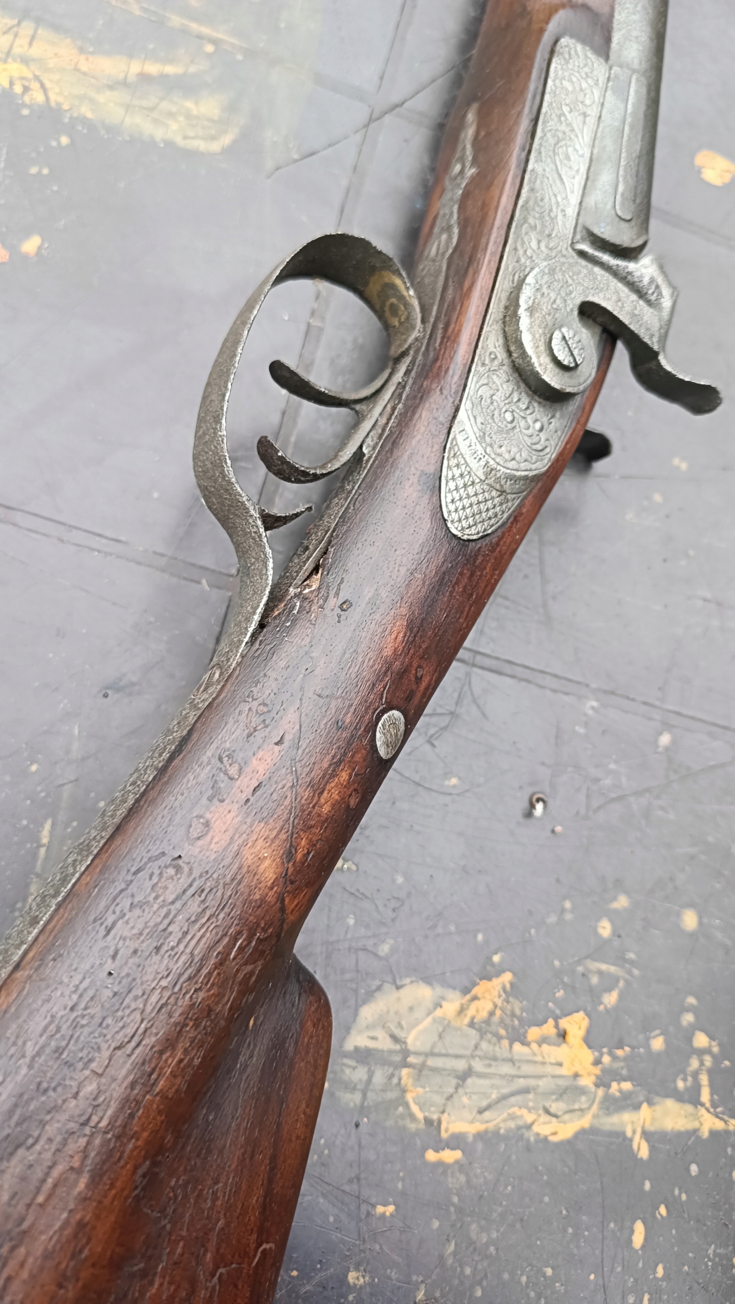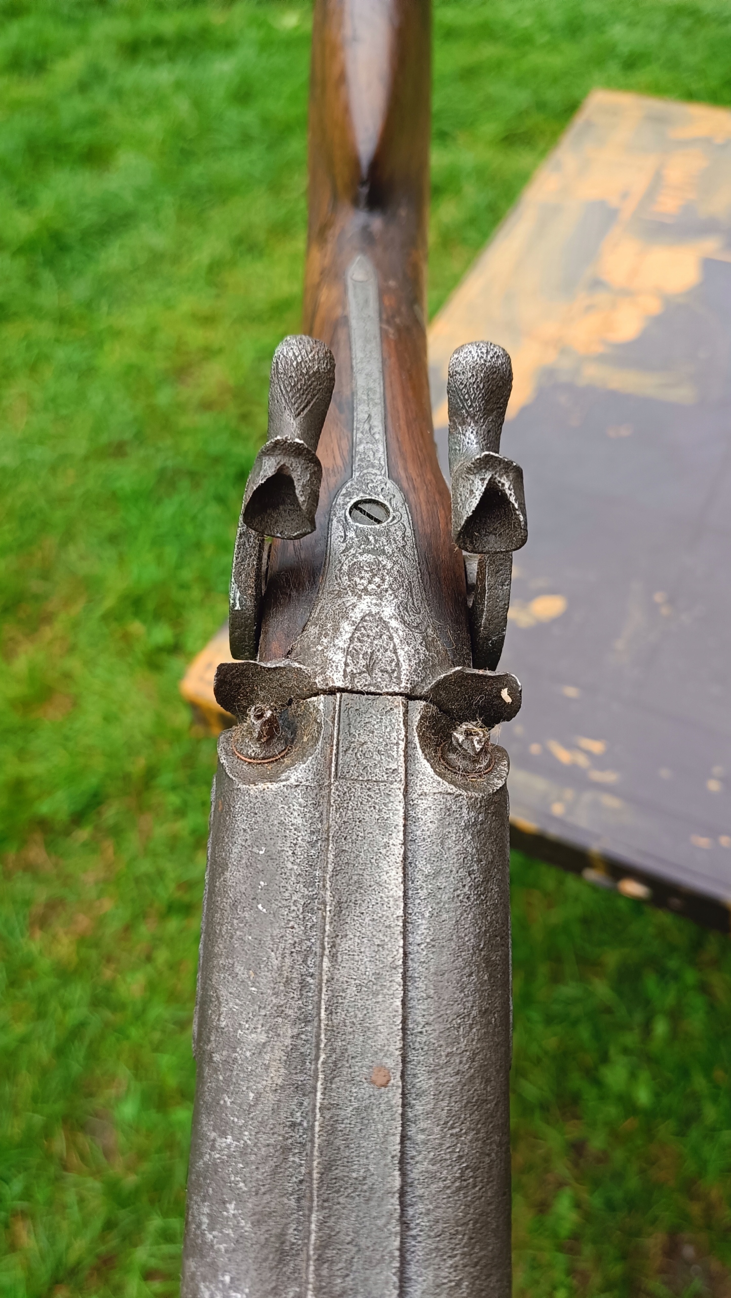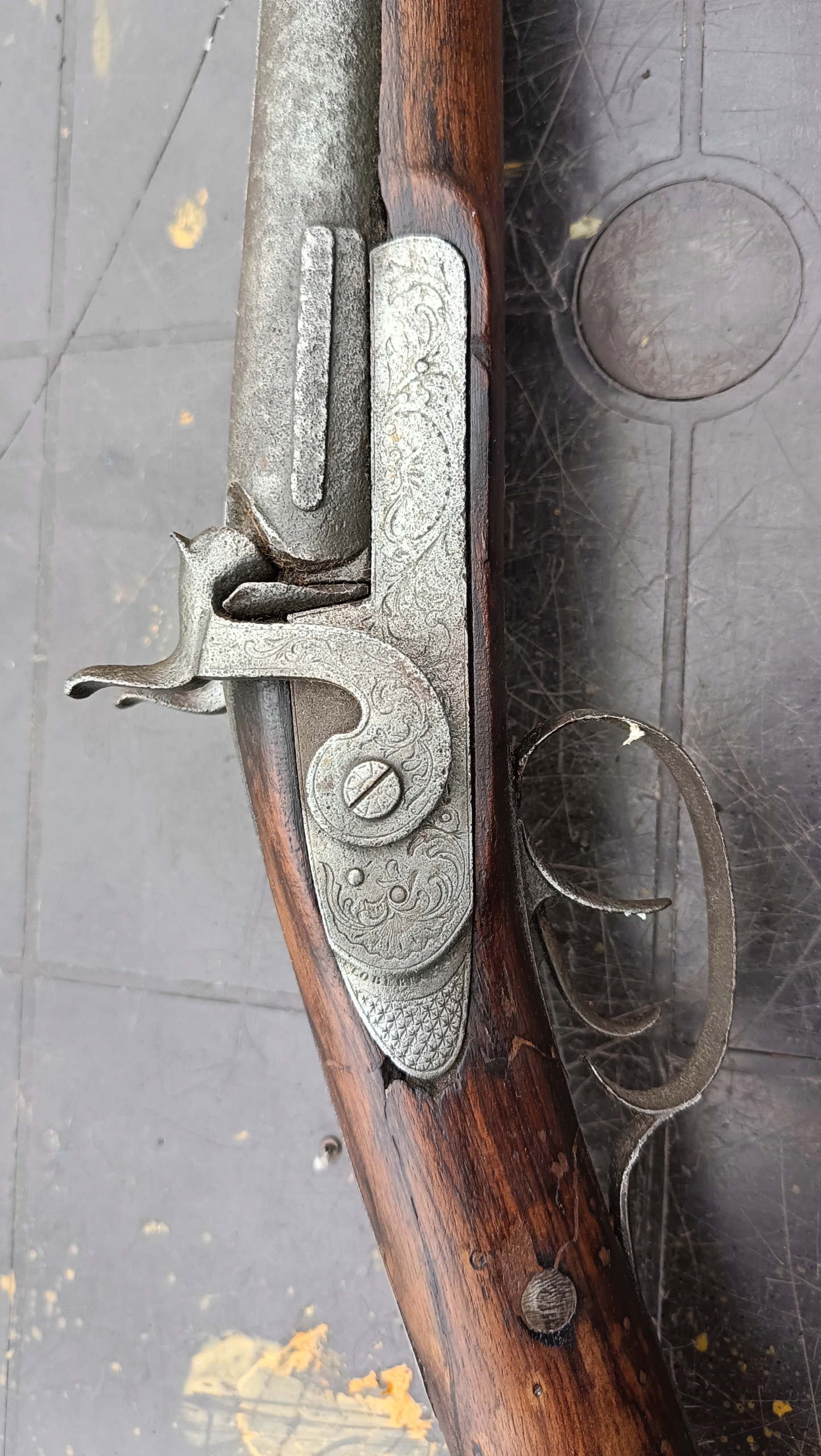 завантажено з фронту. Можна вистрілити сухий постріл. Замки тригера затягуються двома брусками. Весь бочка має піттерів, які запобігають використанню цієї зброї. Дерево, як ви бачите на знімках, було відремонтовано.