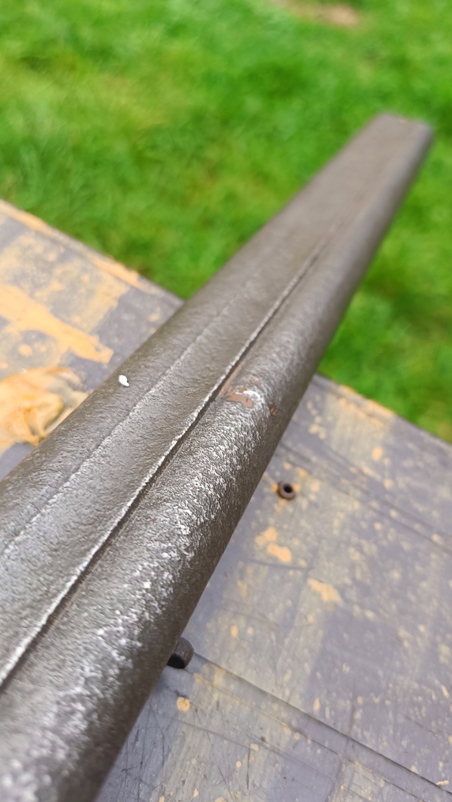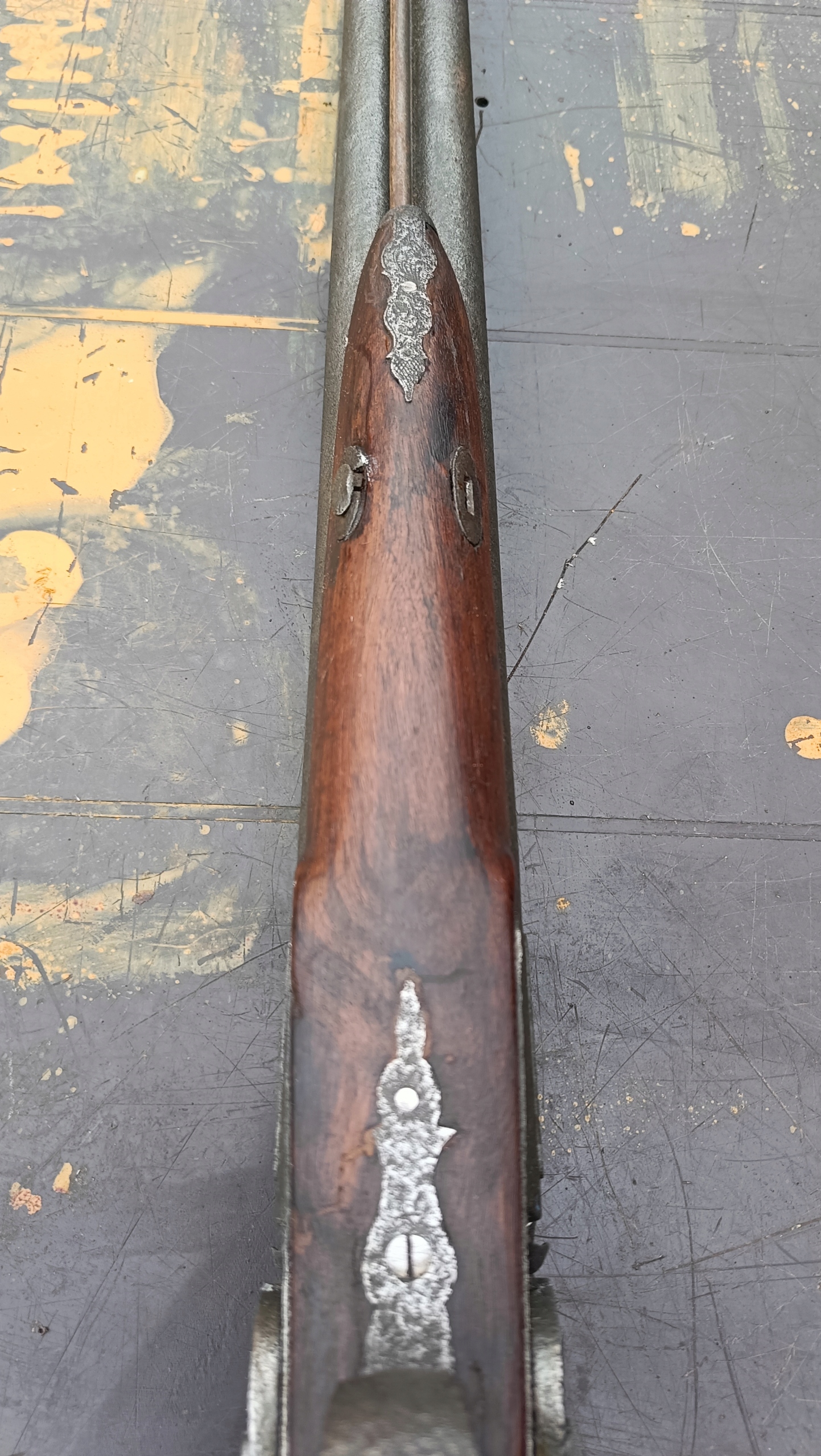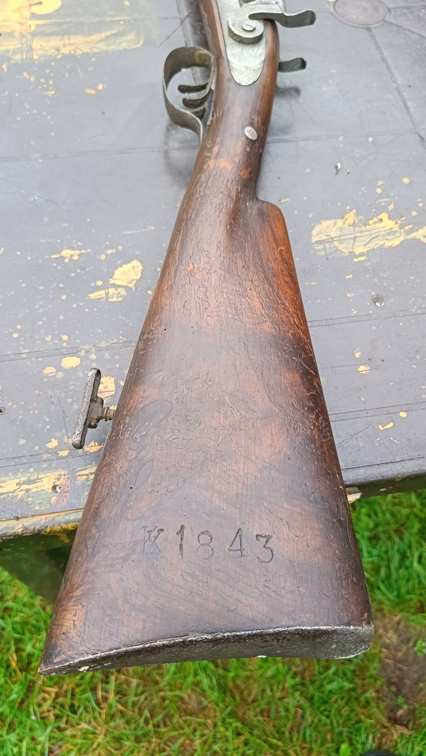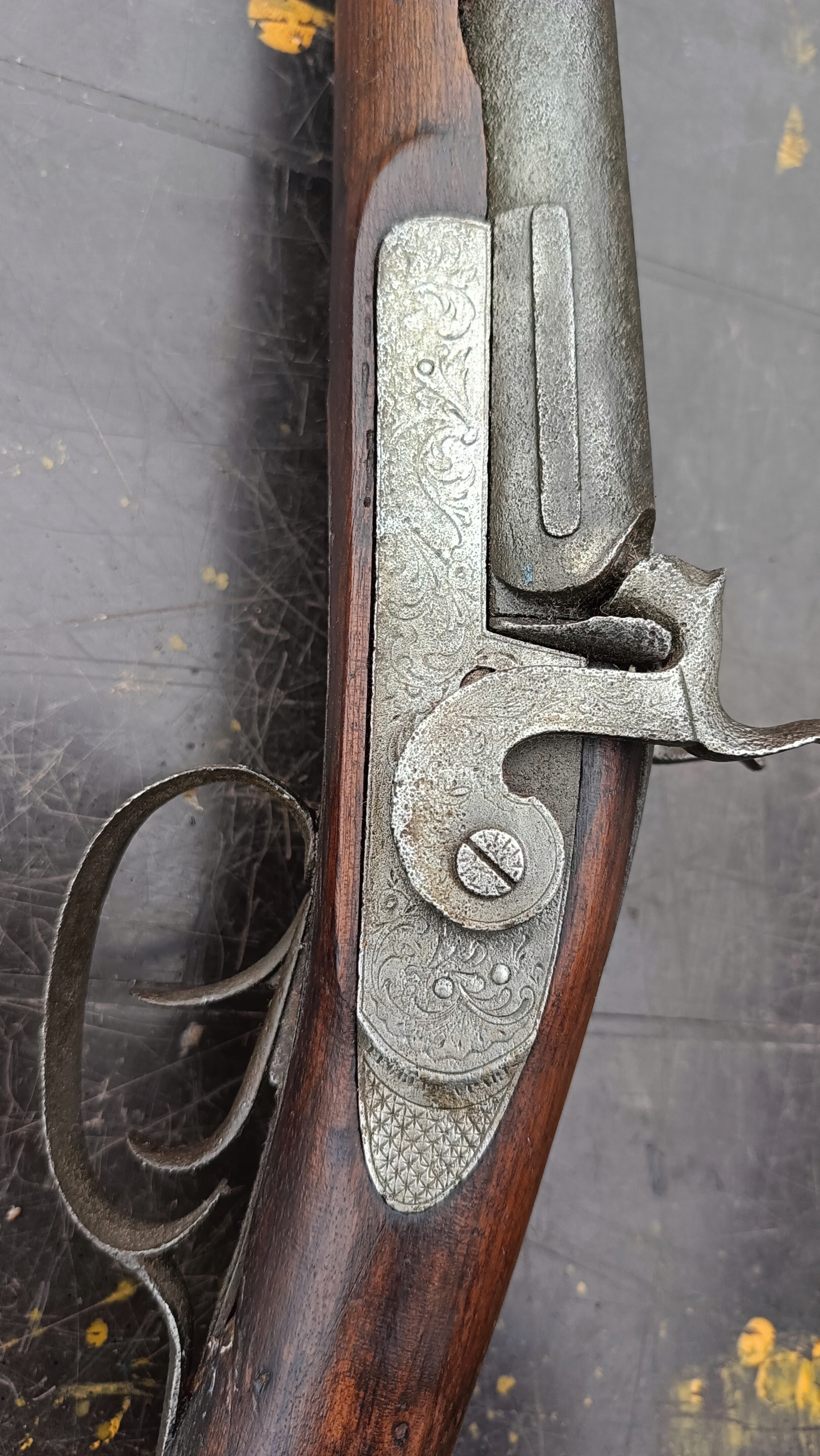 завантажено з фронту. Можна вистрілити сухий постріл. Замки тригера затягуються двома брусками. Весь бочка має піттерів, які запобігають використанню цієї зброї. Дерево, як ви бачите на знімках, було відремонтовано.