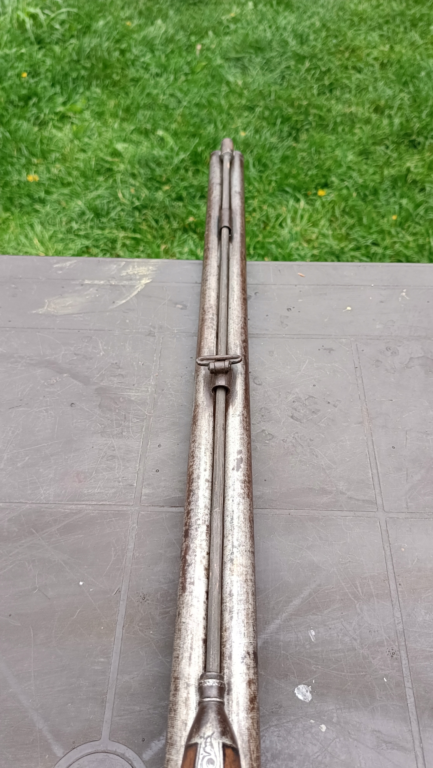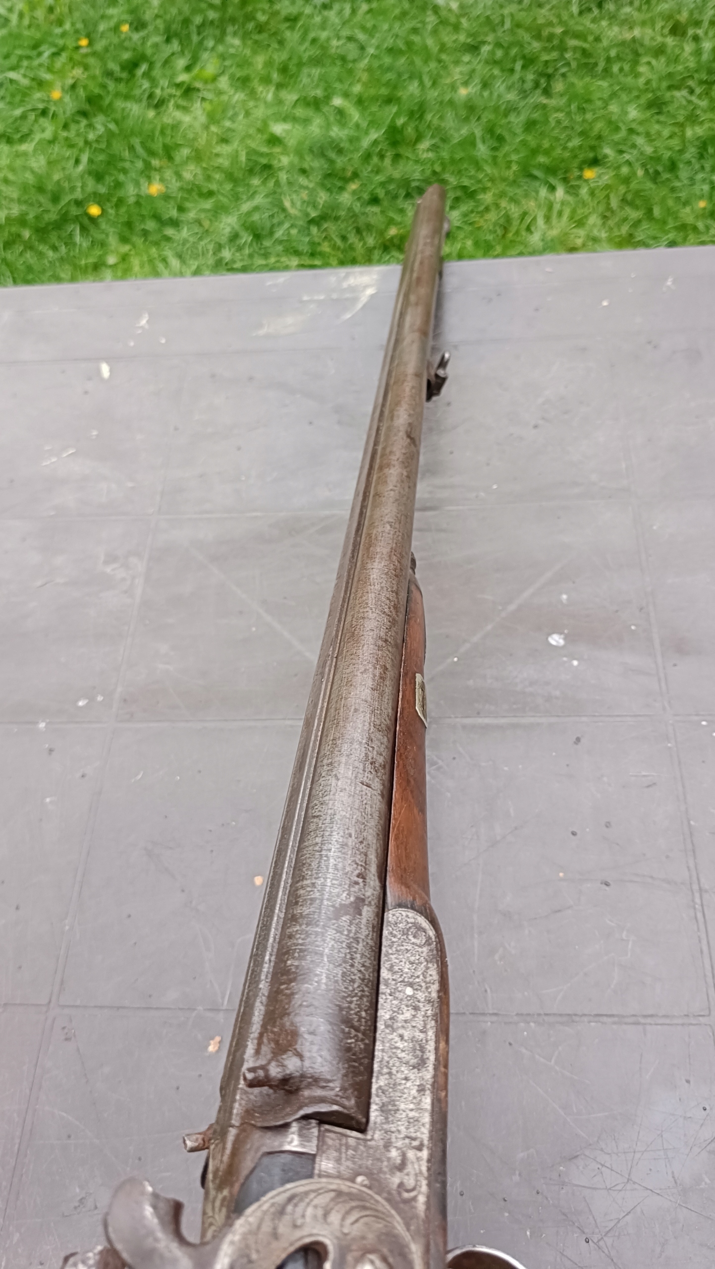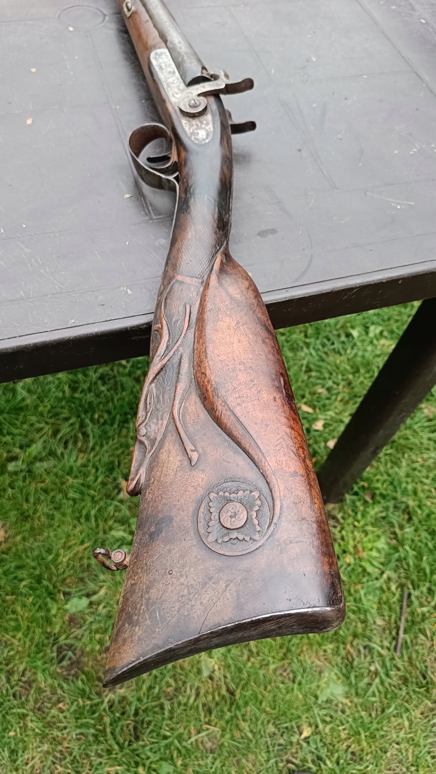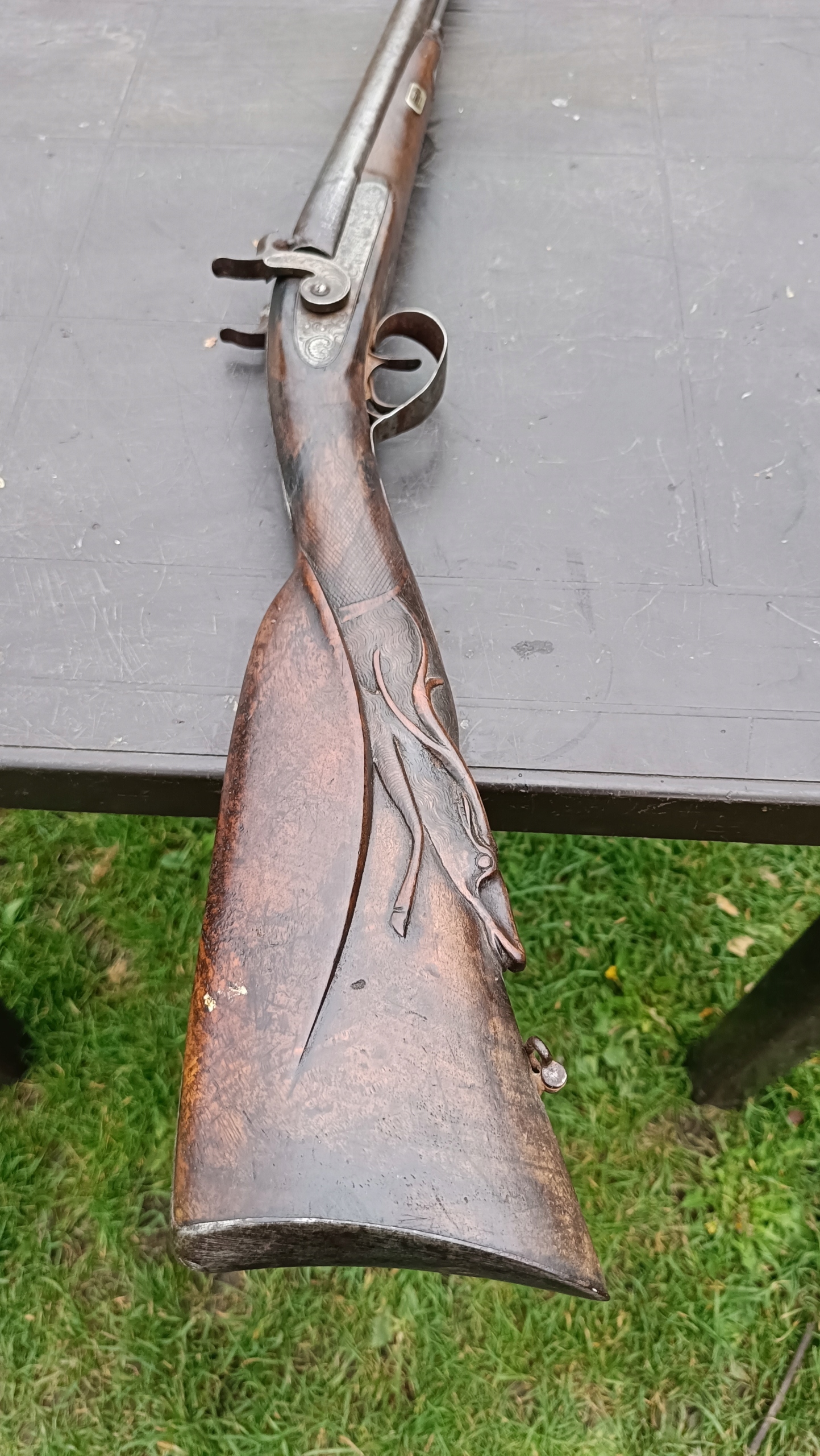 завантажений з фронту. Можна вистрілити сухий постріл, подвійне напруження. Замки тригера працюють добре. Пряма бочка в хорошому стані. Як бачите, дерево має сліди тріщин. Погані каміни.