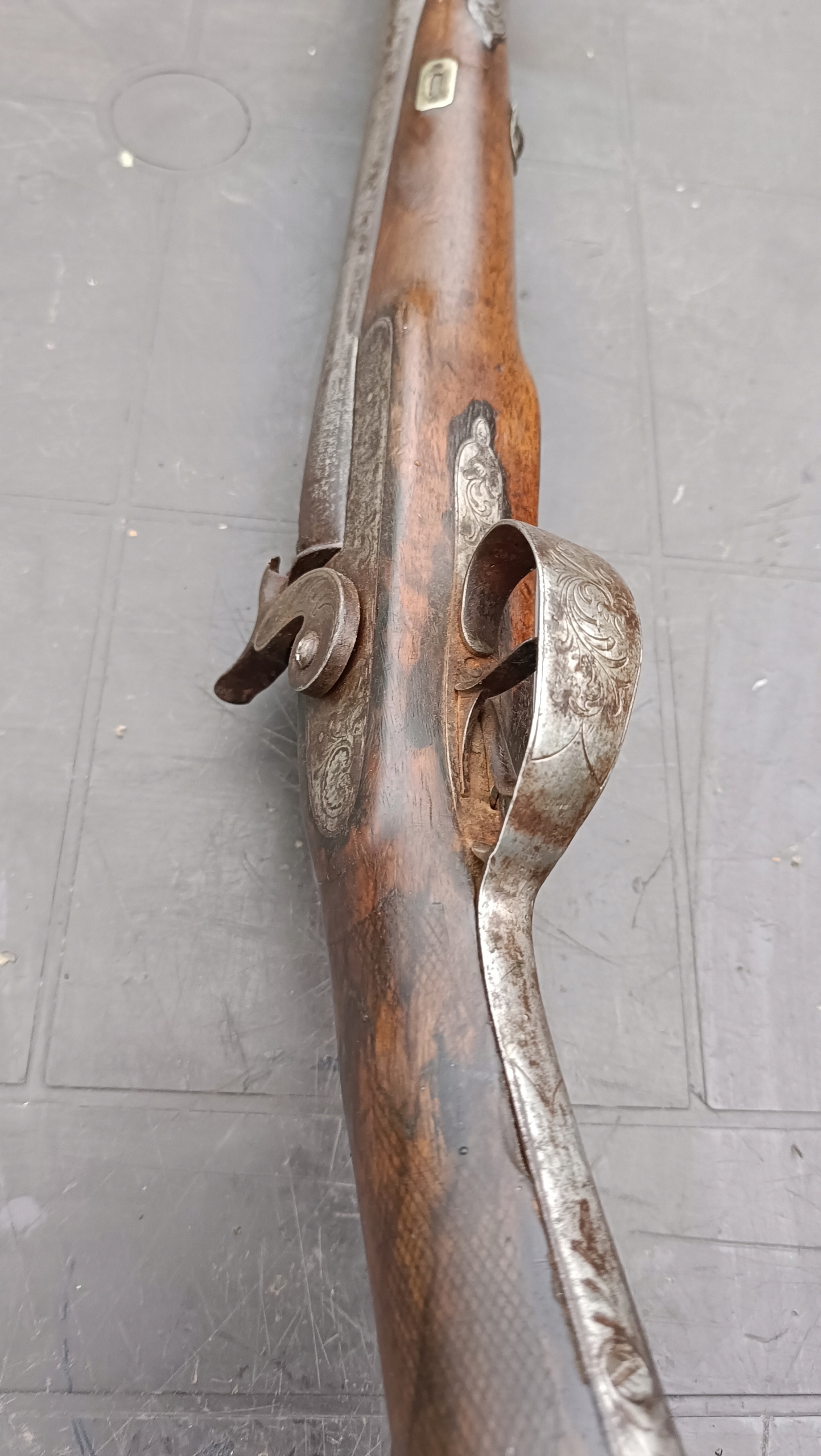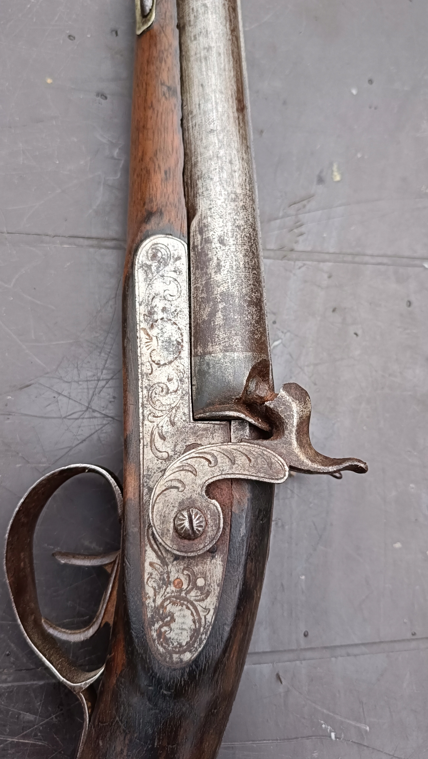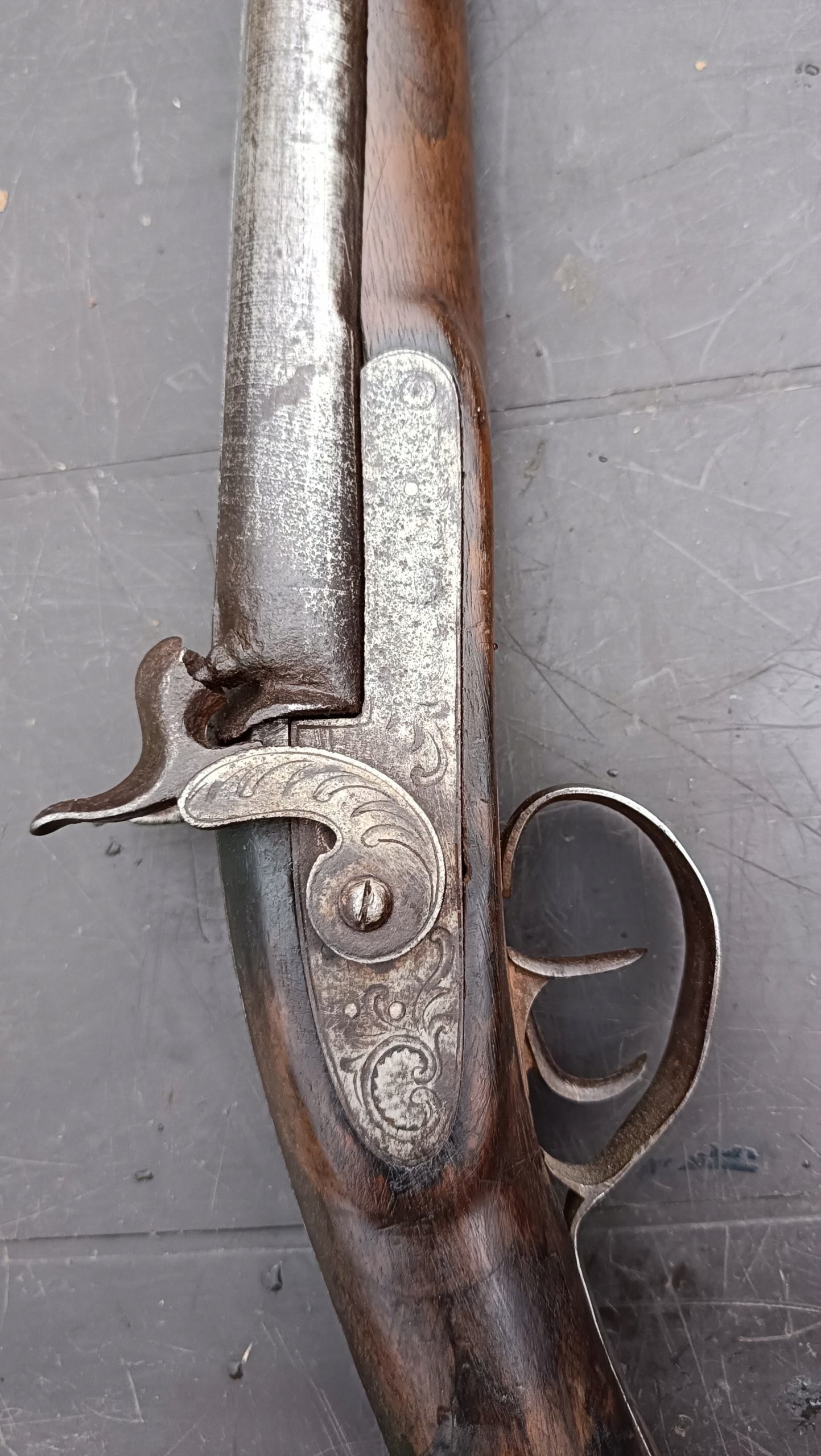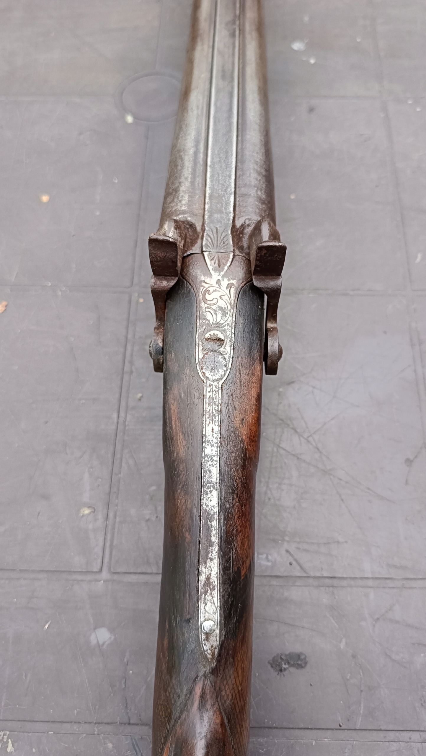 завантажений з фронту. Можна вистрілити сухий постріл, подвійне напруження. Замки тригера працюють добре. Пряма бочка в хорошому стані. Як бачите, дерево має сліди тріщин. Погані каміни.