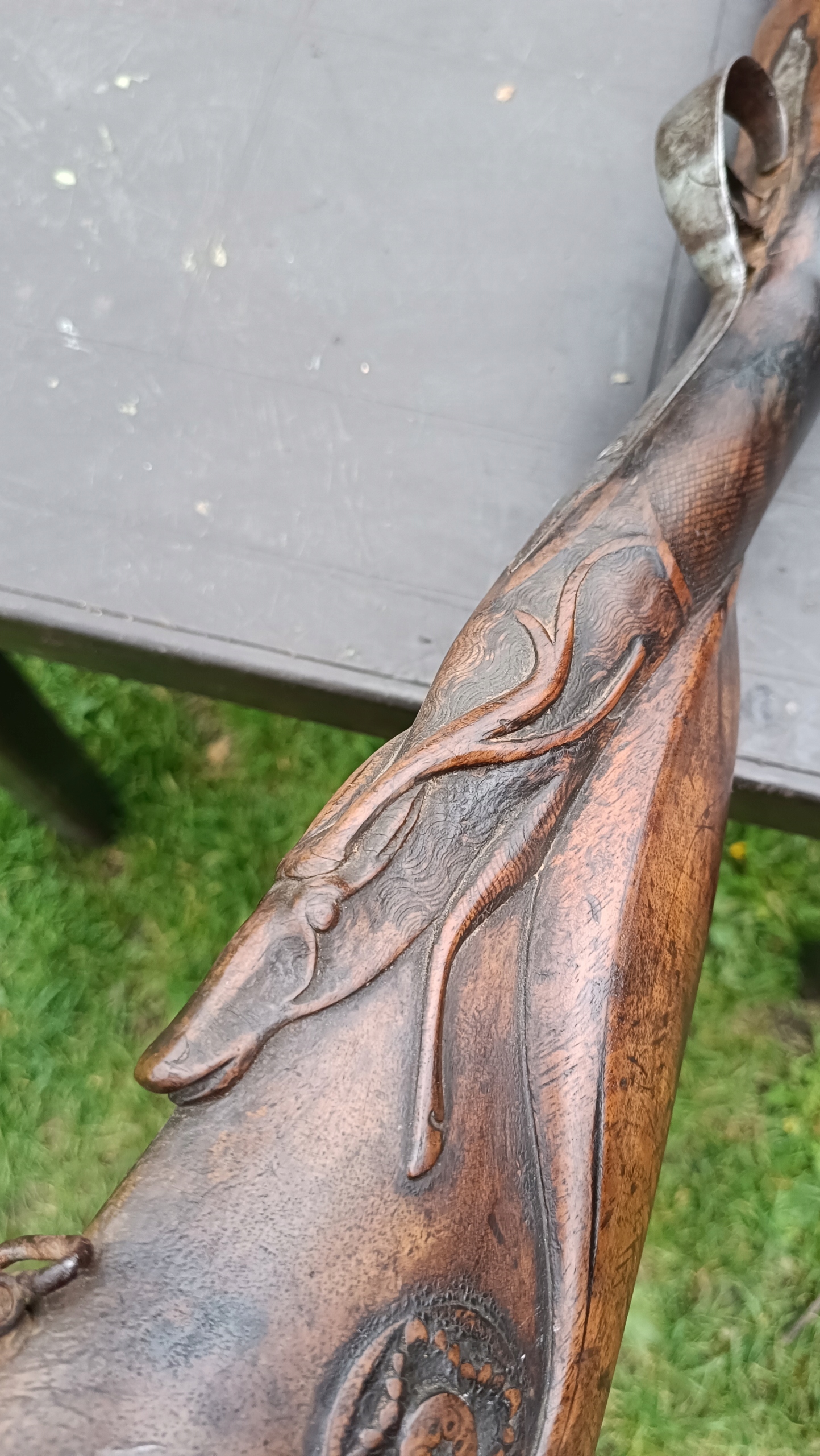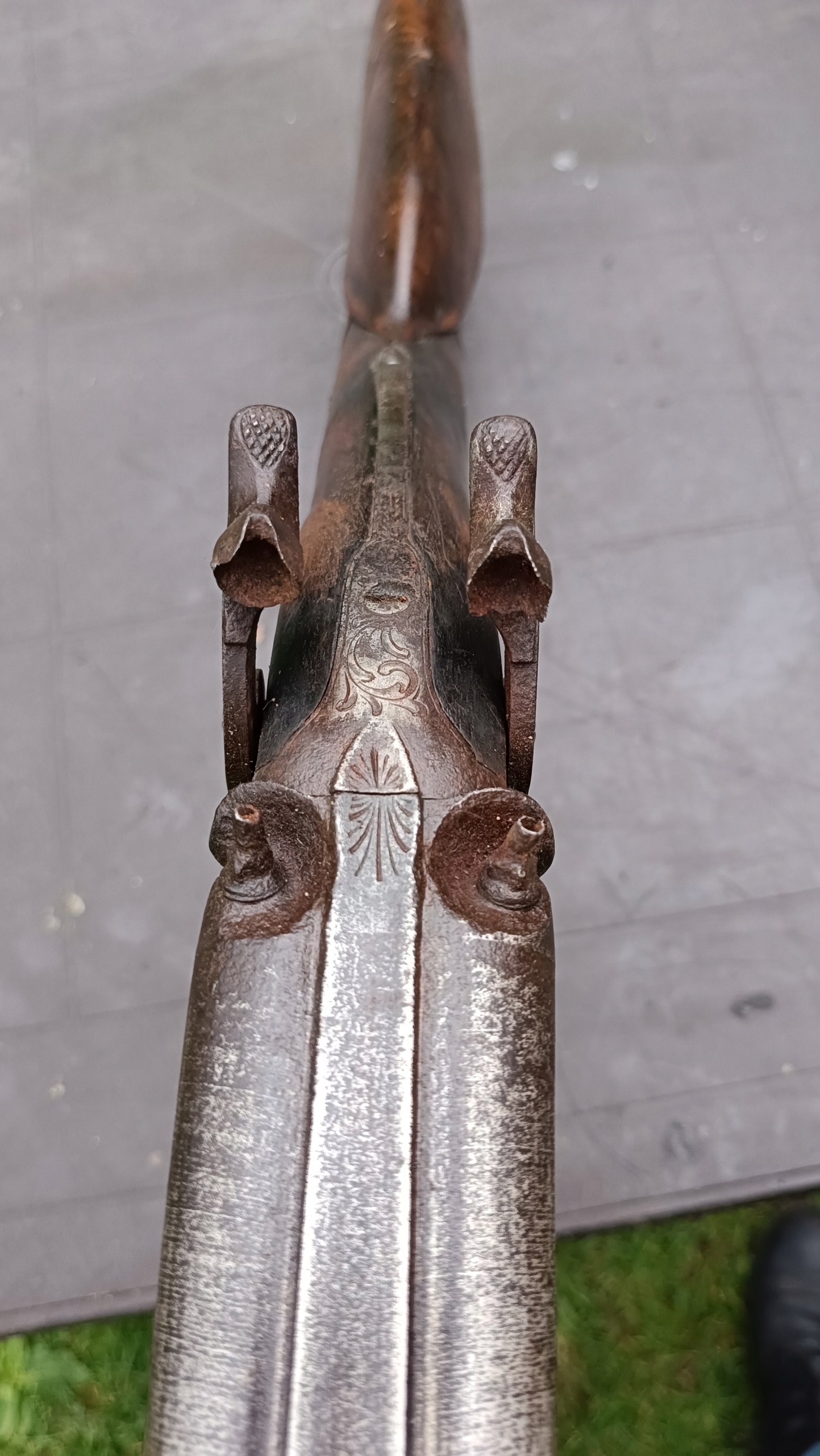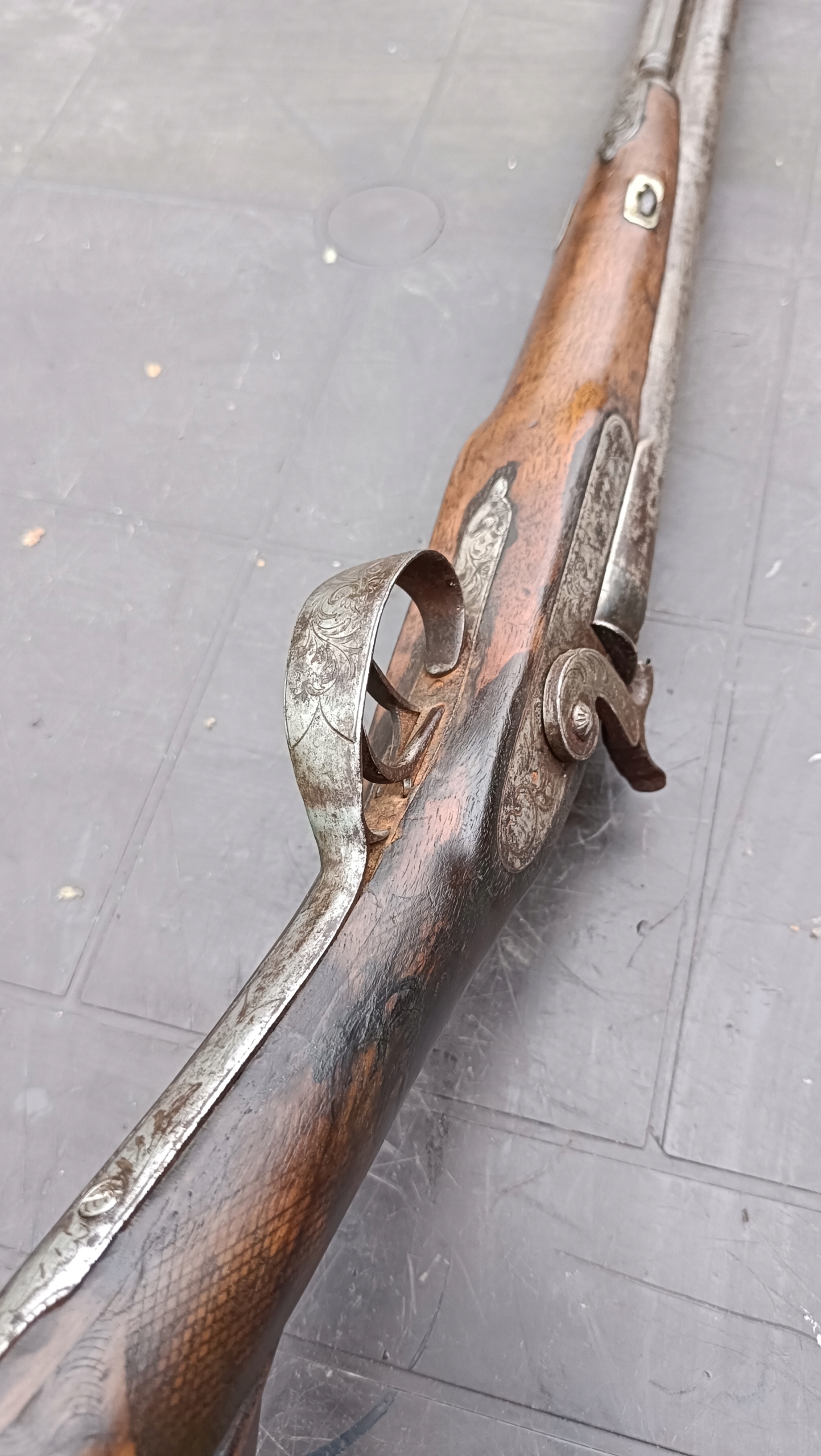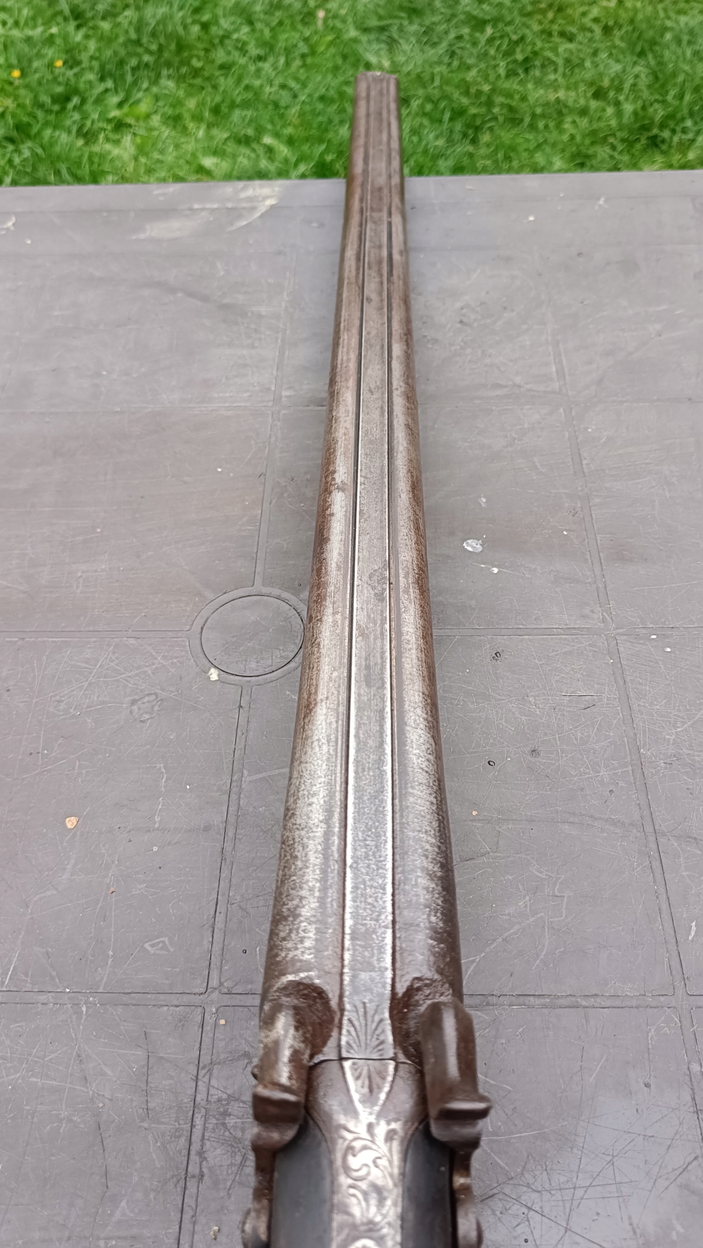 завантажений з фронту. Можна вистрілити сухий постріл, подвійне напруження. Замки тригера працюють добре. Пряма бочка в хорошому стані. Як бачите, дерево має сліди тріщин. Погані каміни.