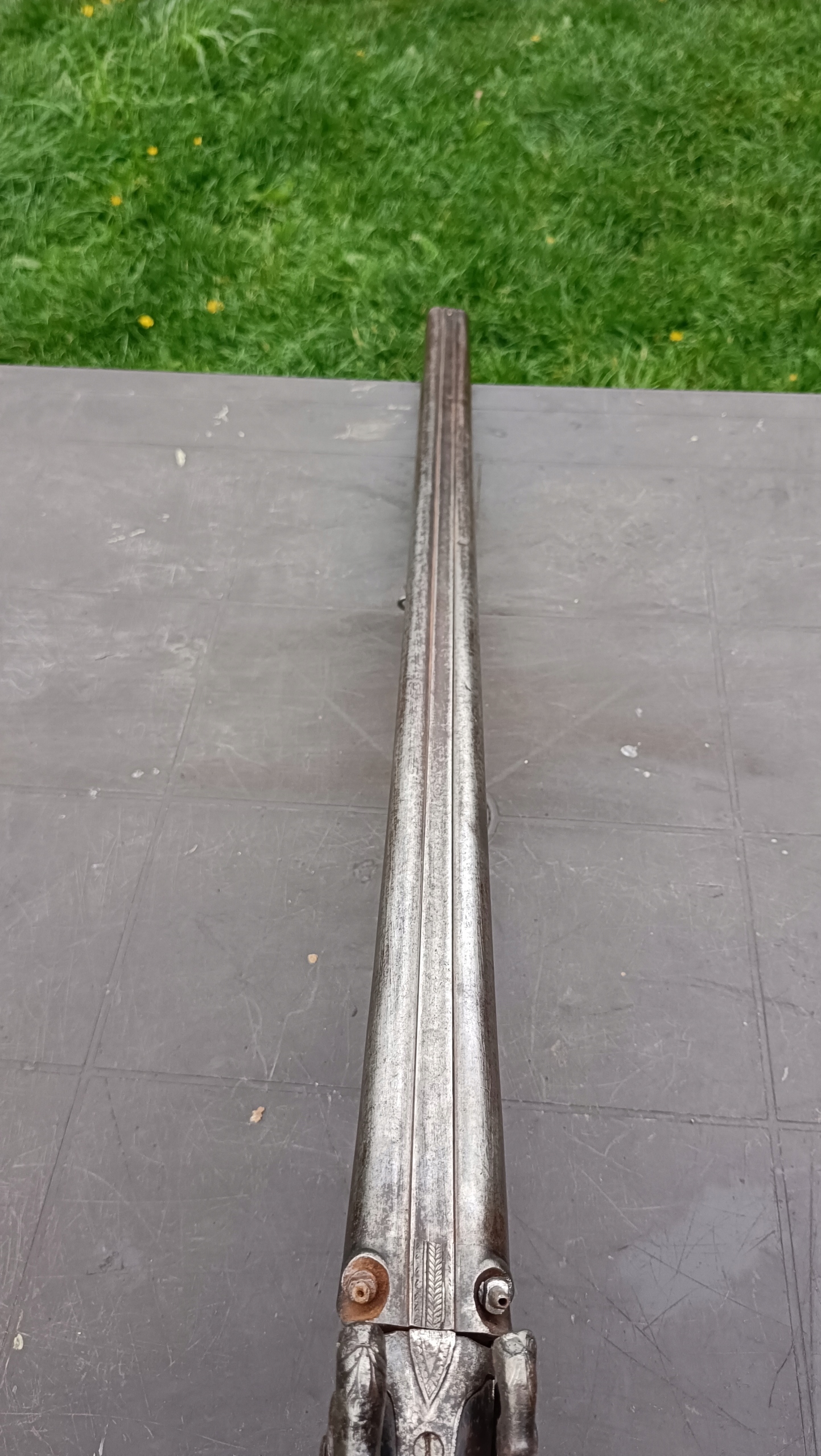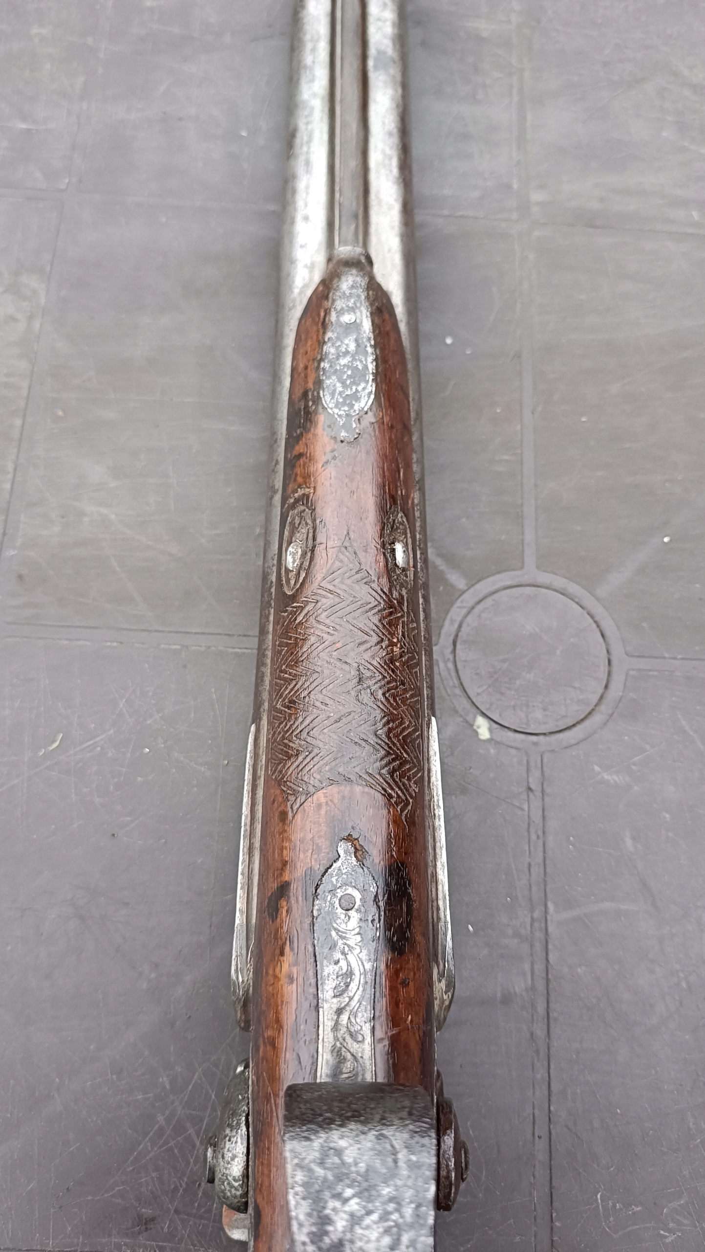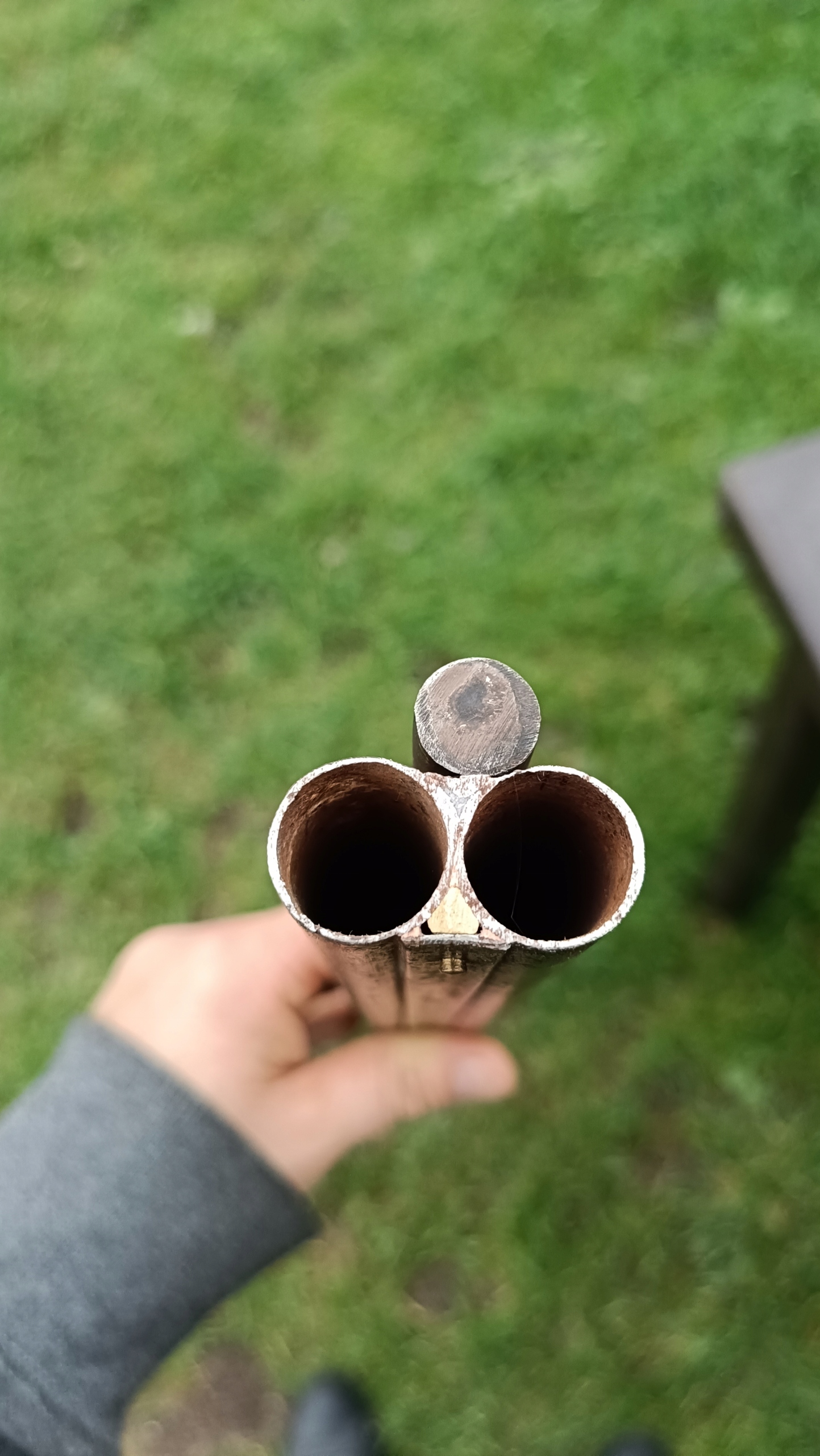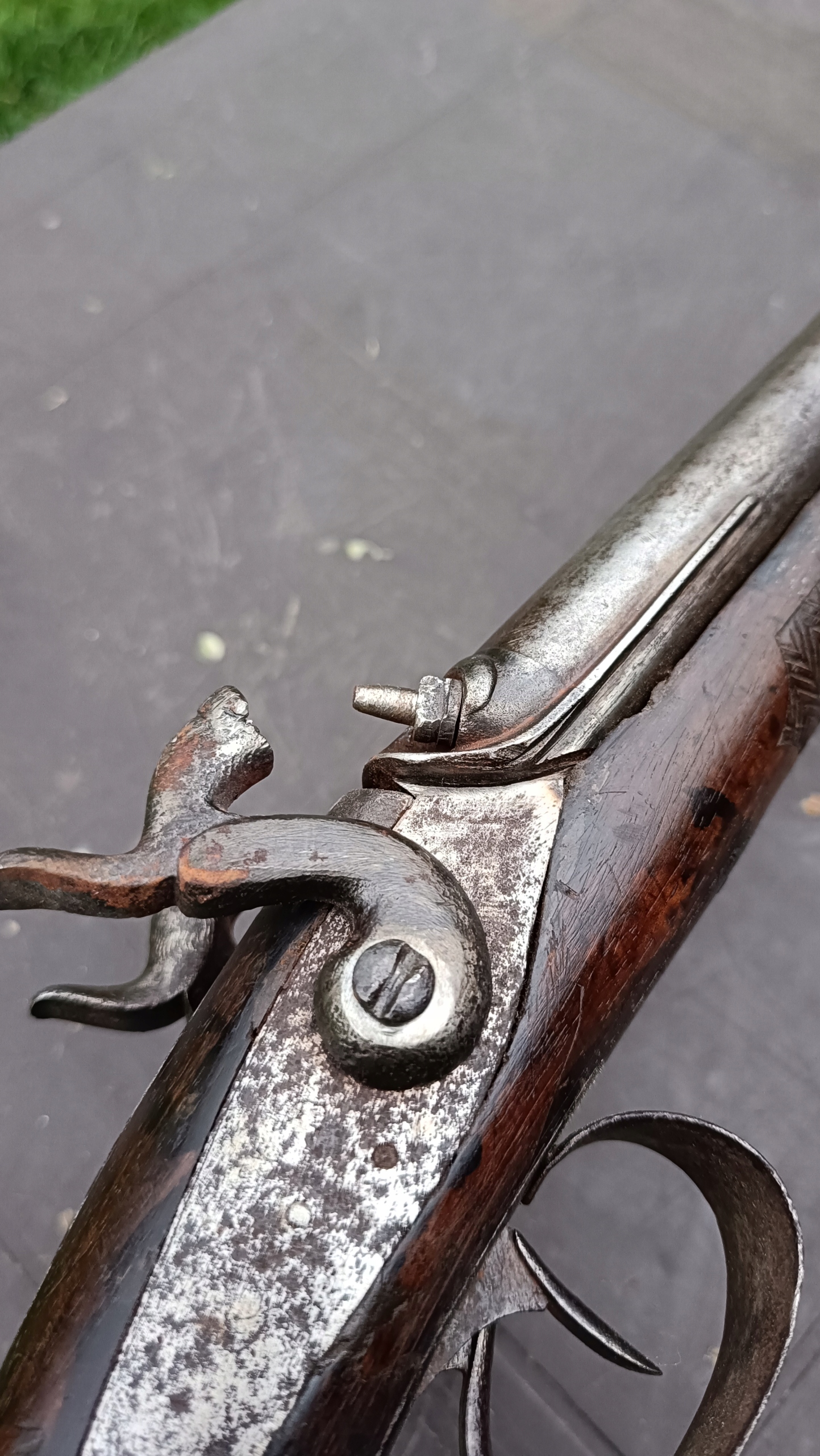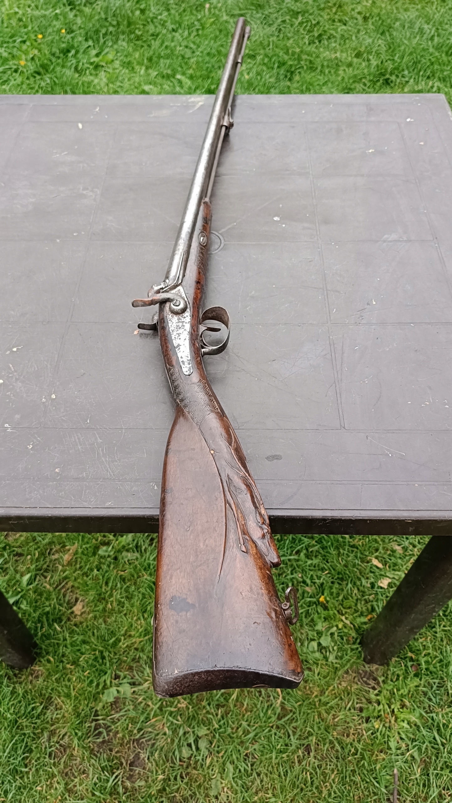завантажений з фронту. Можна вистрілити сухий постріл, подвійне напруження. Замки тригера працюють добре. Проста бочка має одну серйозну вм'ятину (видно на фотографії). Ціле дерево. Каміни - один приємний, інший вже компактний. Бочка не з цієї колби.