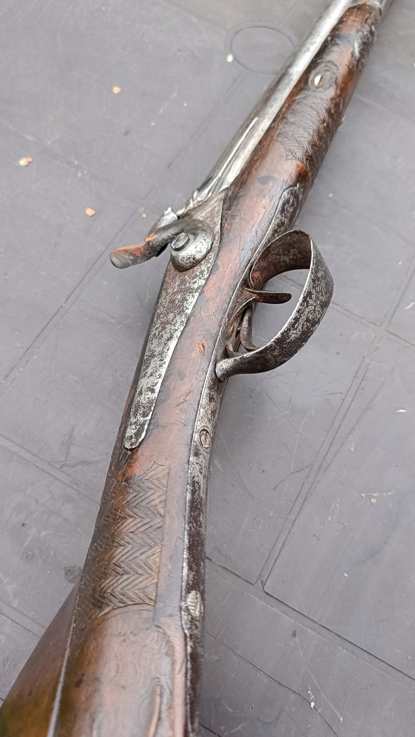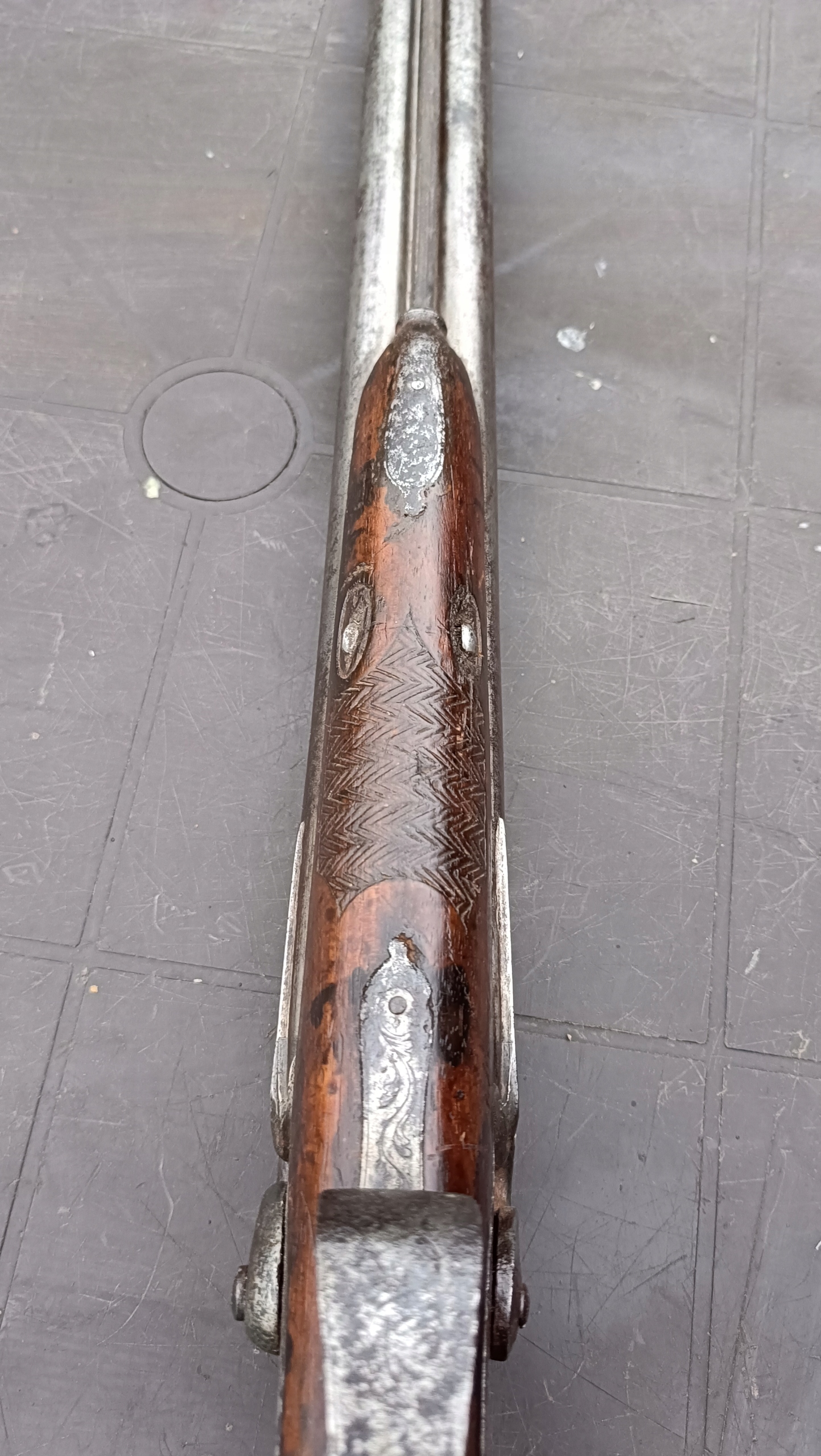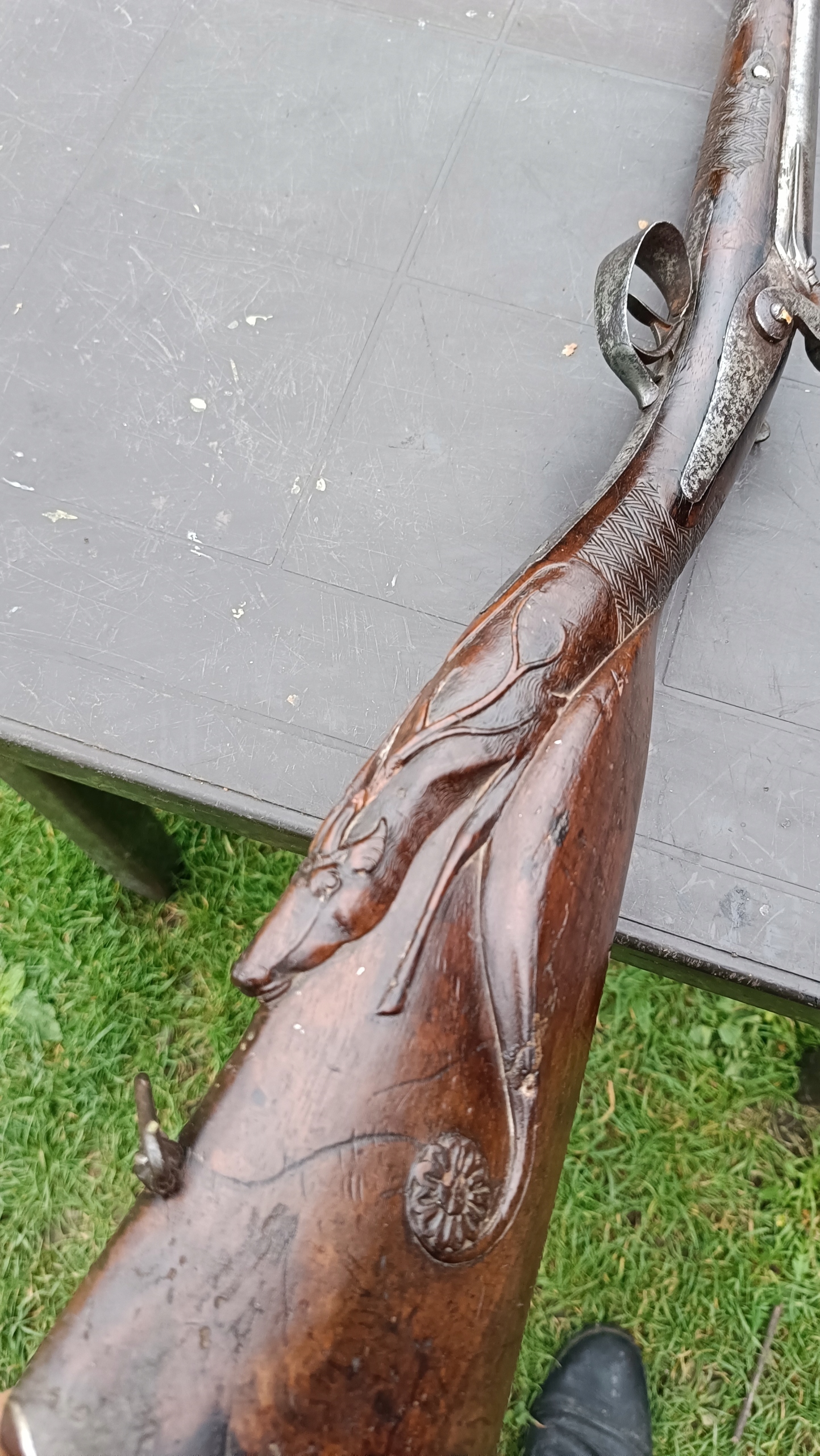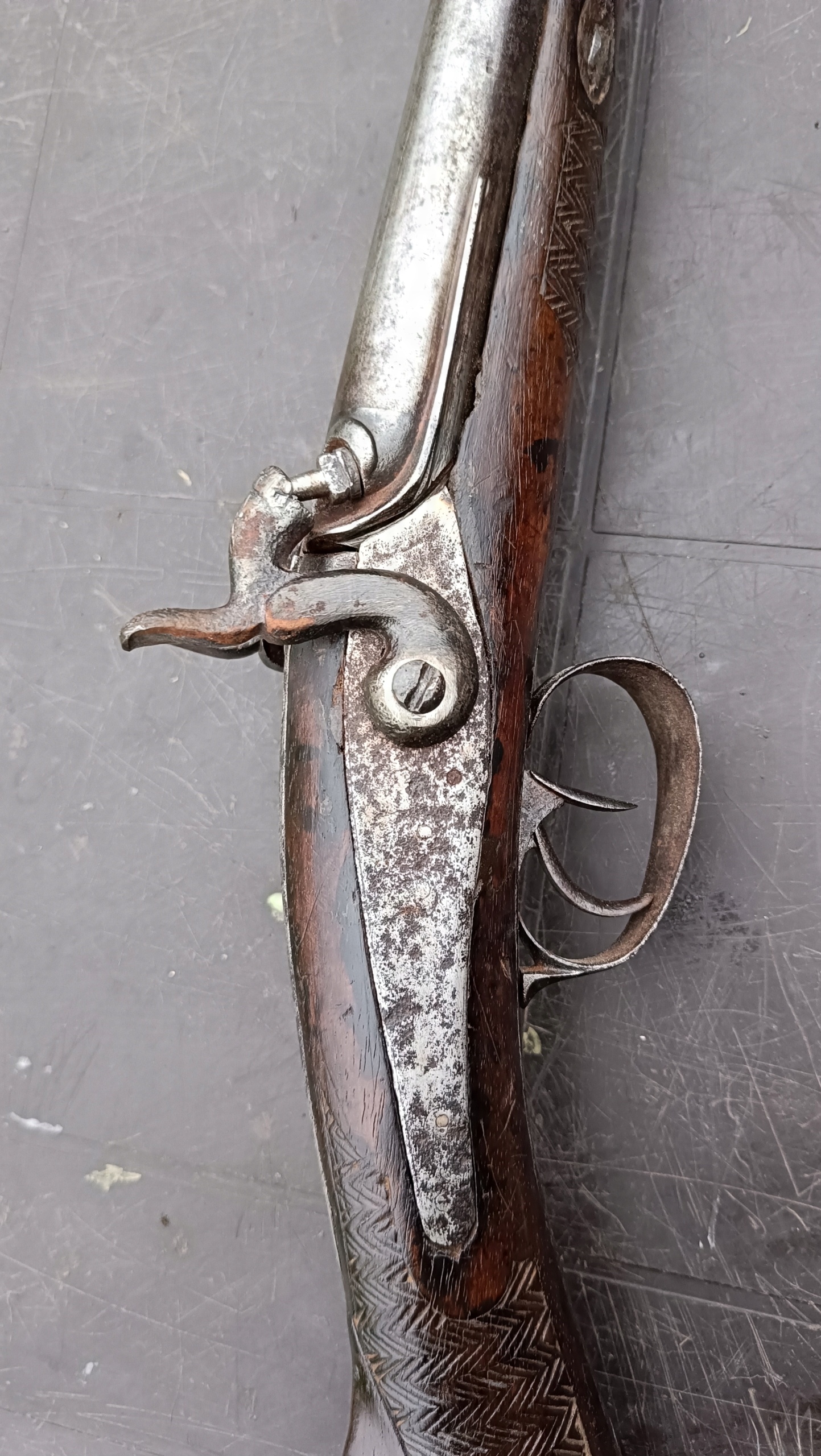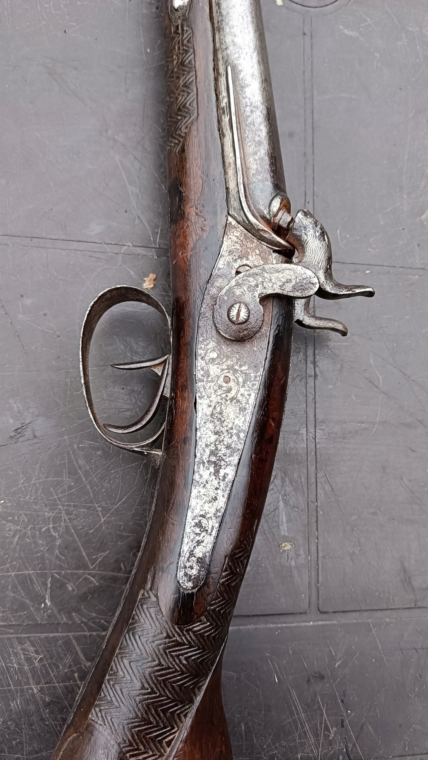 завантажений з фронту. Можна вистрілити сухий постріл, подвійне напруження. Замки тригера працюють добре. Проста бочка має одну серйозну вм'ятину (видно на фотографії). Ціле дерево. Каміни - один приємний, інший вже компактний. Бочка не з цієї колби.
