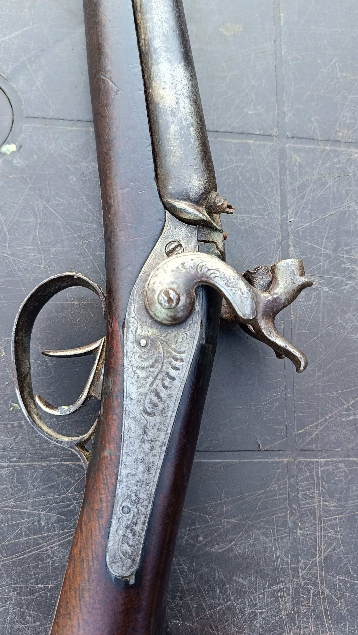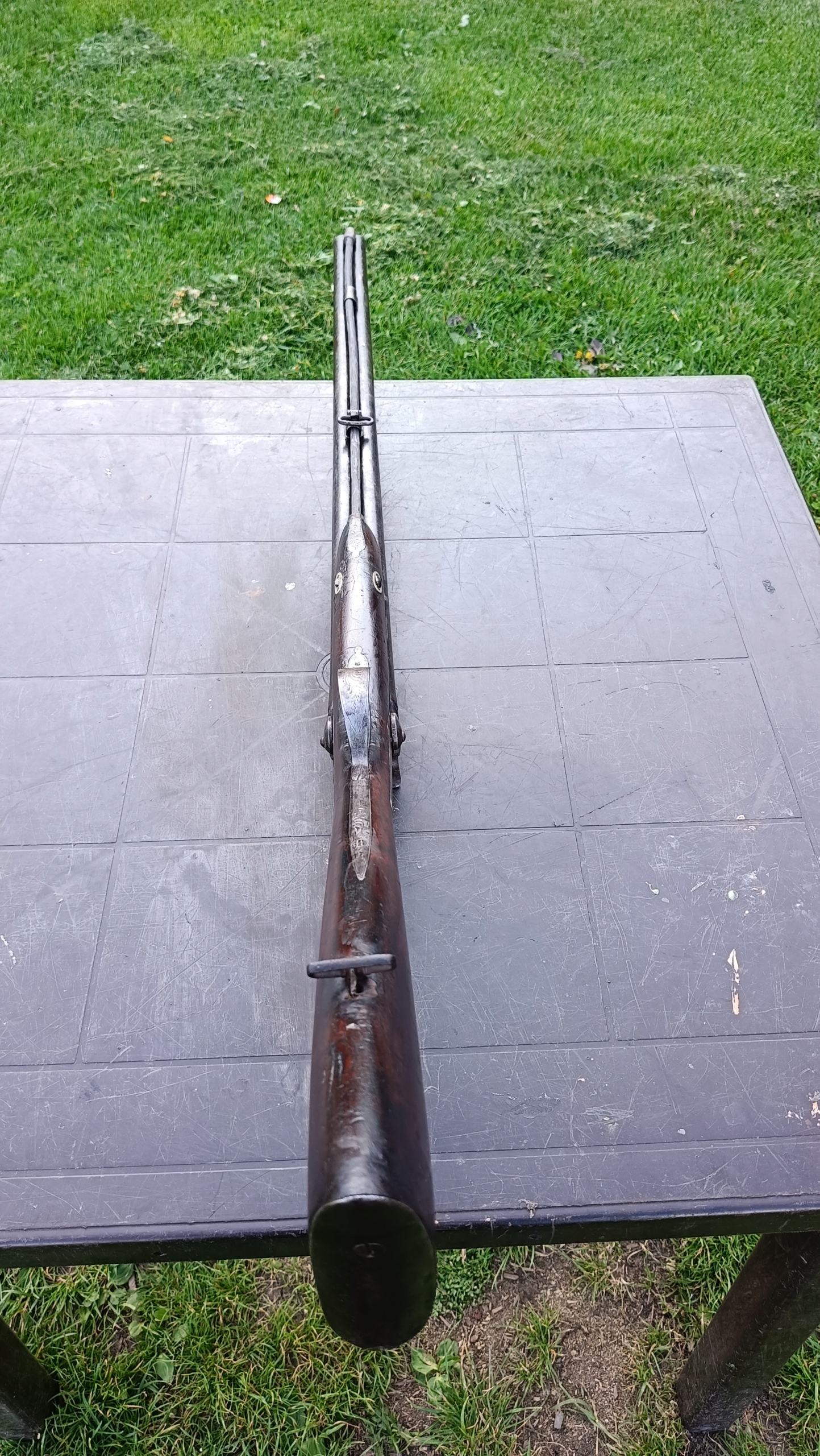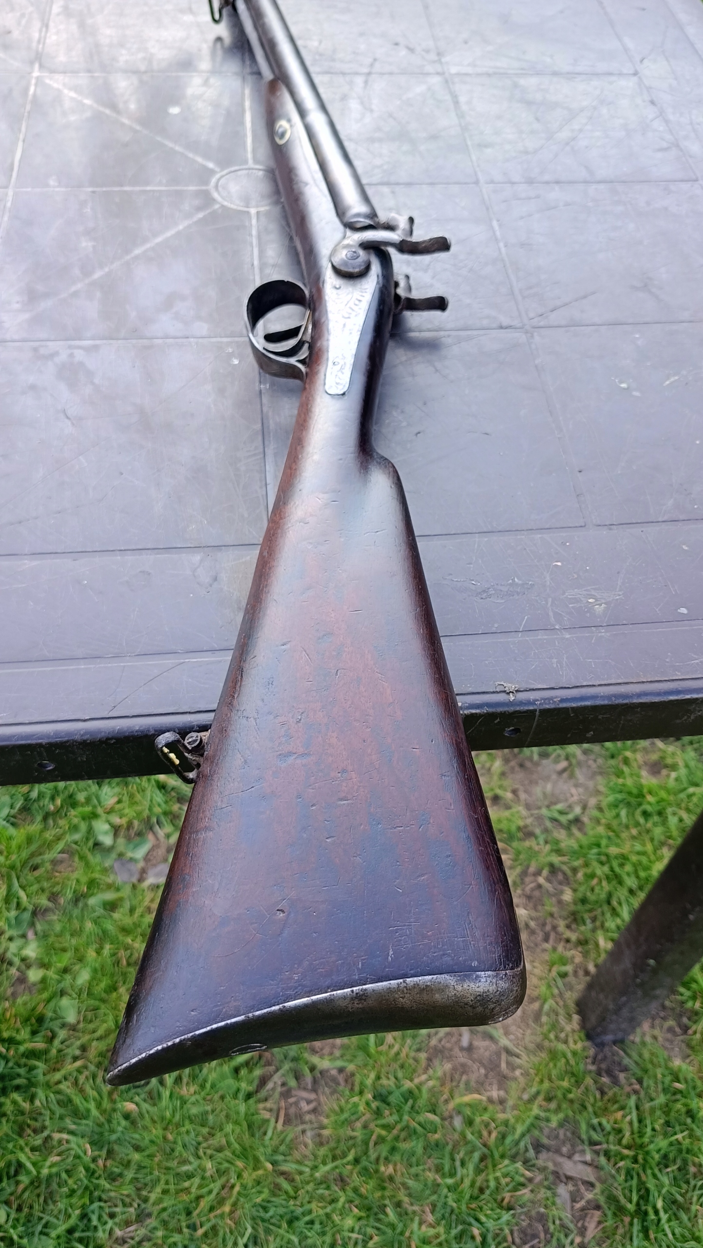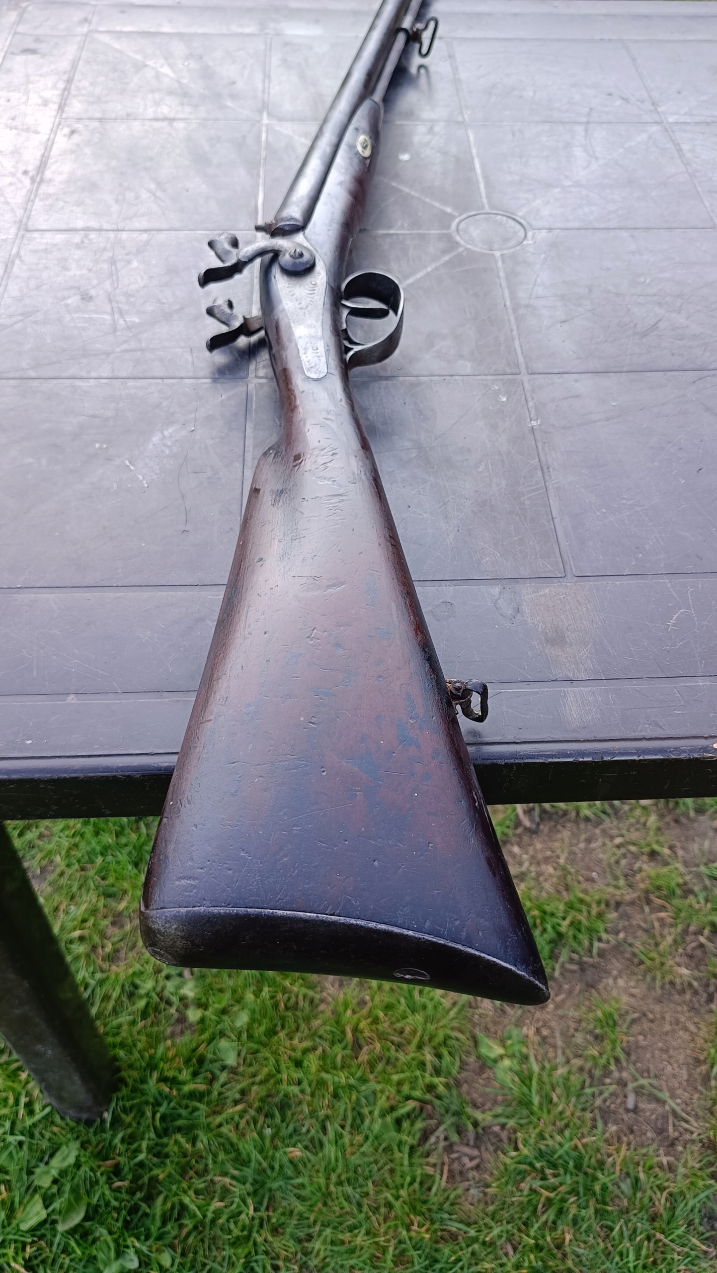 завантажений з фронту. Можна вистрілити сухий постріл, подвійне напруження. Замки прямо до іншого такту. Пряма бочка в хорошому стані, невеликі ями. Дерево в хорошому стані. Камін в порядку, інший, який потрібно замінити. Один кран має невелику тріщину, видно на фотографії та невелику слабкість.