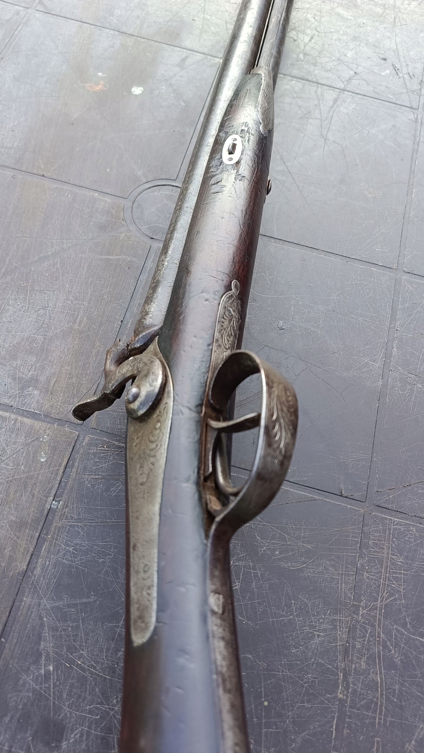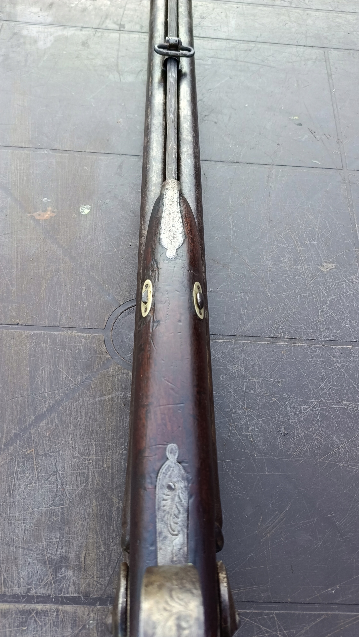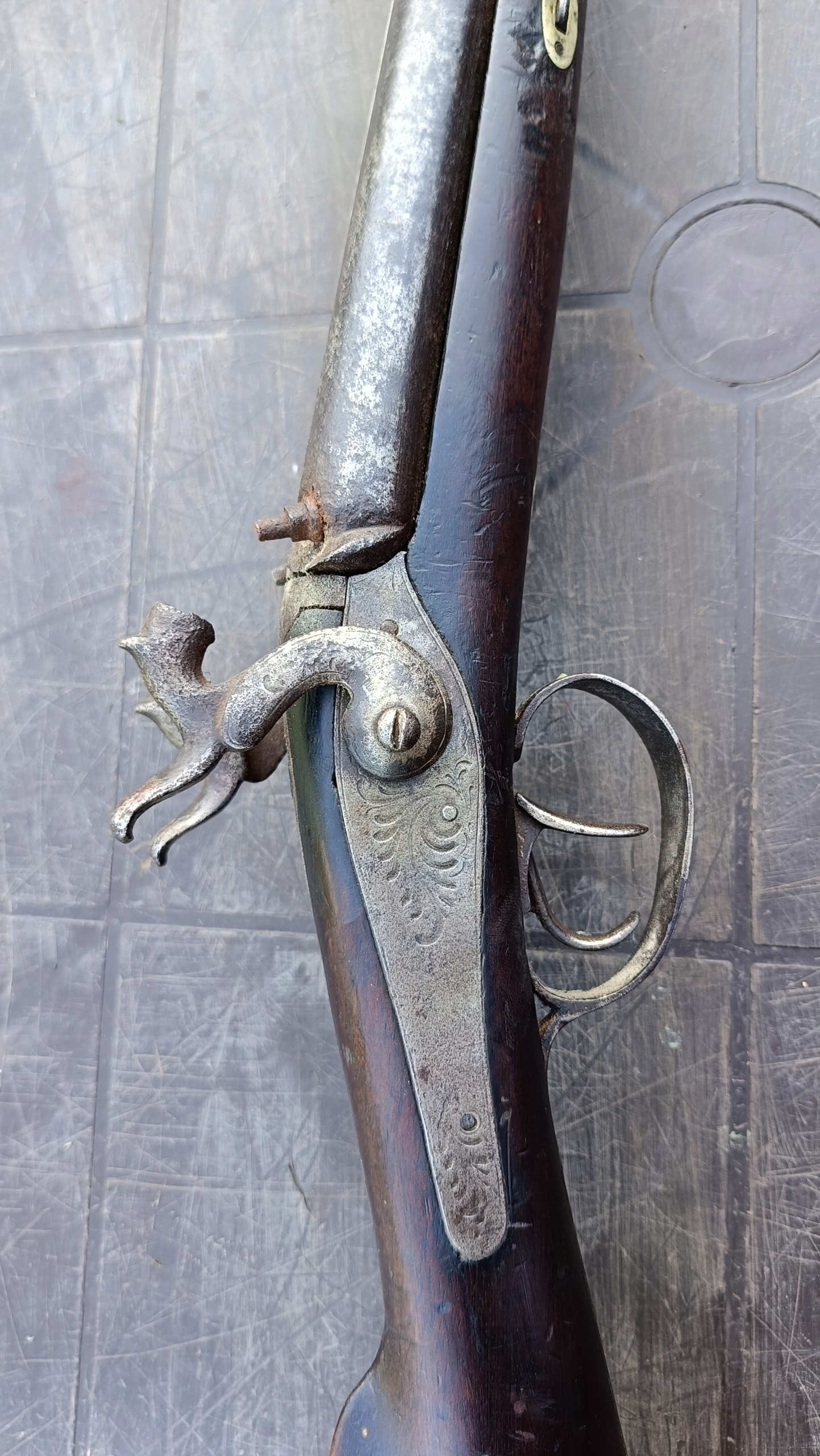 завантажений з фронту. Можна вистрілити сухий постріл, подвійне напруження. Замки прямо до іншого такту. Пряма бочка в хорошому стані, невеликі ями. Дерево в хорошому стані. Камін в порядку, інший, який потрібно замінити. Один кран має невелику тріщину, видно на фотографії та невелику слабкість.