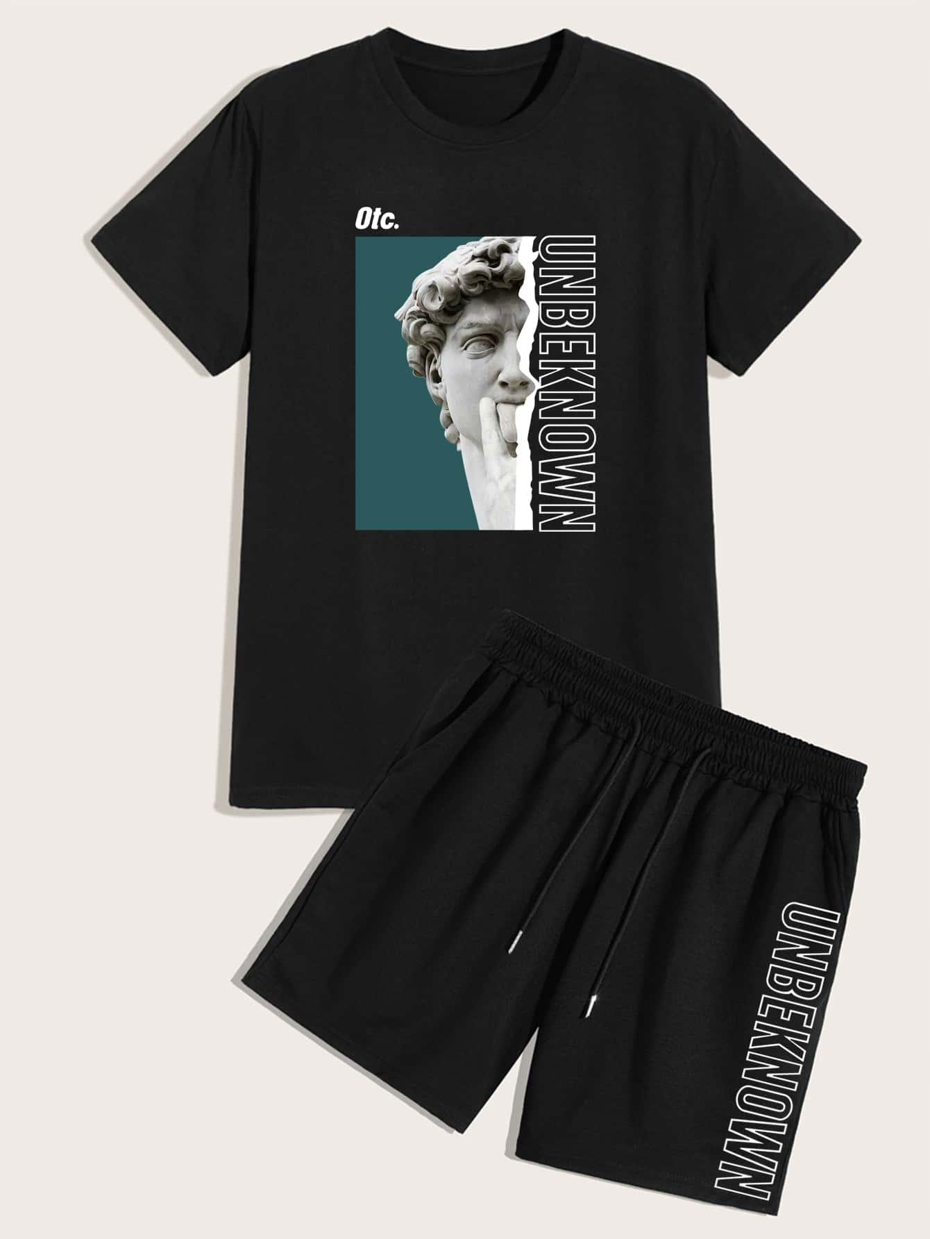Чорний двоскладний набір футболки друкує поті шорти Shein L