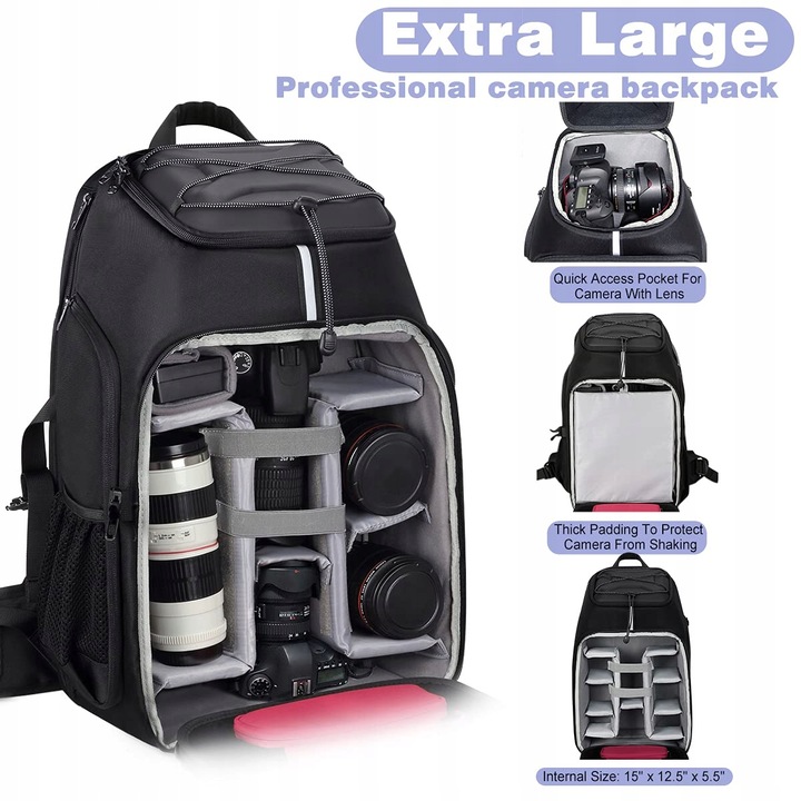 Багато місць для зберігання – багато невеликих кишень для фотообладнання, з обох боків є сітчаста кишеня для пляшки з водою або штатива. Одностороння кишеня для інструментів і аксесуарів для фотографування або дрона. Додаткова організаційна підкладка для пропелерів для вашої безпеки. З відділенням для ноутбука 43,2 см (17 дюймів) і планшета 25,4 см (10 дюймів).