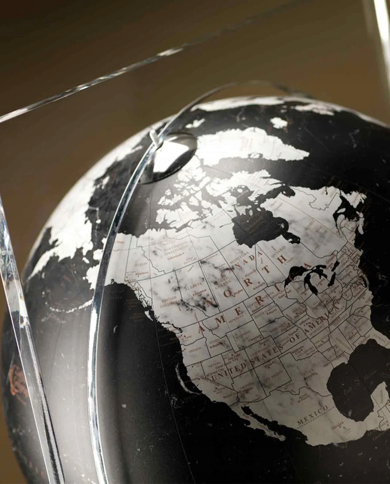 Глобус Artico має діаметр 40 см і покритий найновішою картографією. Чорна версія має мармурову карту з чорними морями та білими землями, яка елегантно підкреслює навколишні інтер’єри.
