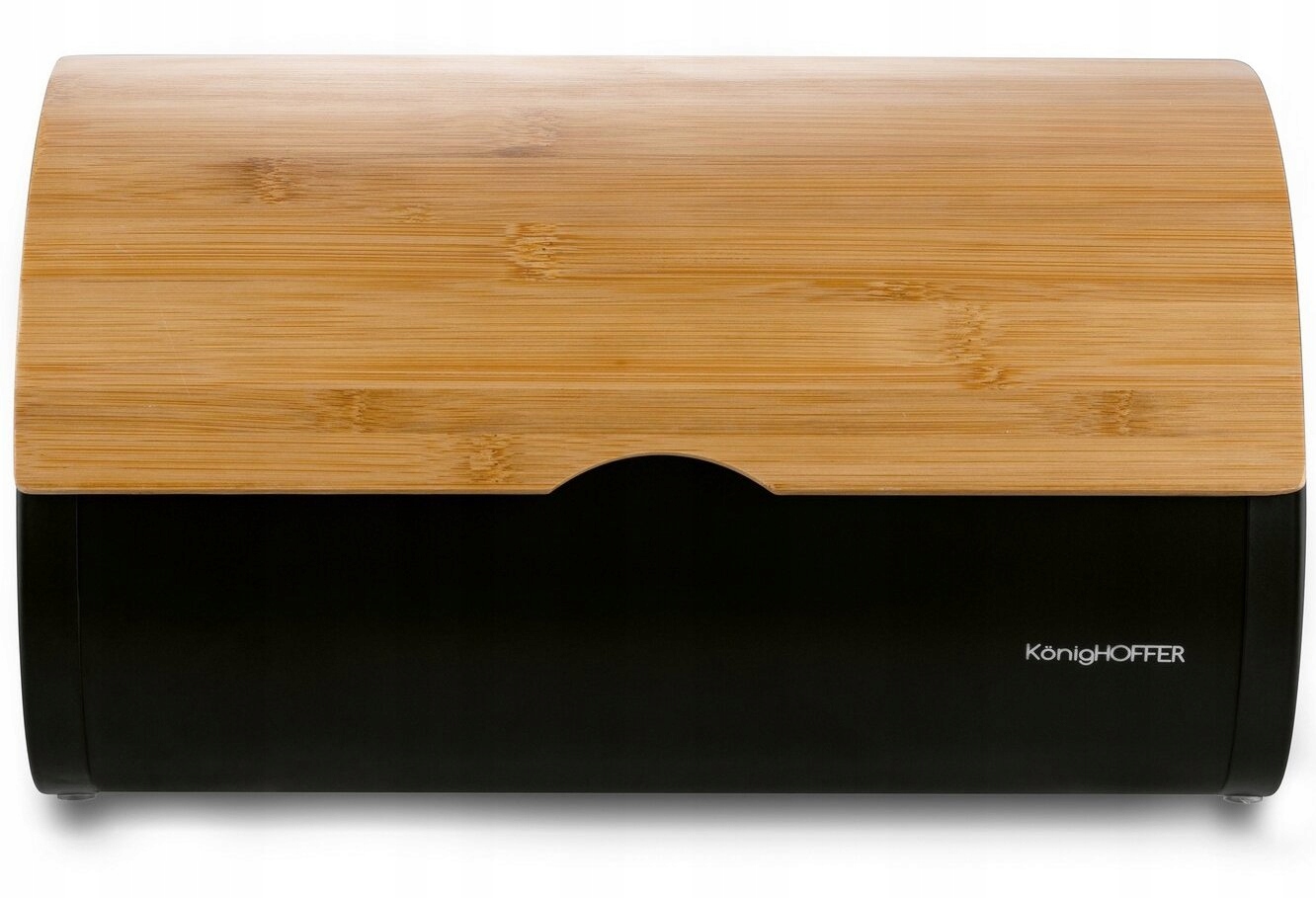Чорна металева хлібниця Konighoffer Volano допомагає продовжити свіжість хліба та дозволяє їсти смачний хліб щоранку, не ходячи щодня в магазин. Завдяки унікальному дизайну стане стильним елементом кухонного обладнання. Гладкі поверхні легко підтримувати в чистоті. Модель закривається на петлі. Кришка добре захищає вміст від бруду та світла. У ньому можна розмістити хліб і булочки для всієї родини. Це пропозиція для тих, хто цінує свіжість, хрусткість і аромат свіжого хліба і шукає міцну, компактну хлібницю. Його можна стабільно розмістити на кухонній стільниці, оскільки він має нековзкі гумові ніжки. Метал з порошковим покриттям (вуглецева сталь) і бамбук дуже міцні. Вони також були використані для створення 3 контейнерів для кави, чаю та цукру, доданих до набору. Завдяки їм ви також можете захистити вміст кухонних банок від випадкового розливання. Набір рекомендований Ewa Wachowicz. Як амбасадор бренду Konighoffer, вона тепло та з усмішкою рекомендує його для домашнього використання. Разом з ним ви отримаєте свій рецепт для дому. Це один із найкращих варіантів у цій категорії!