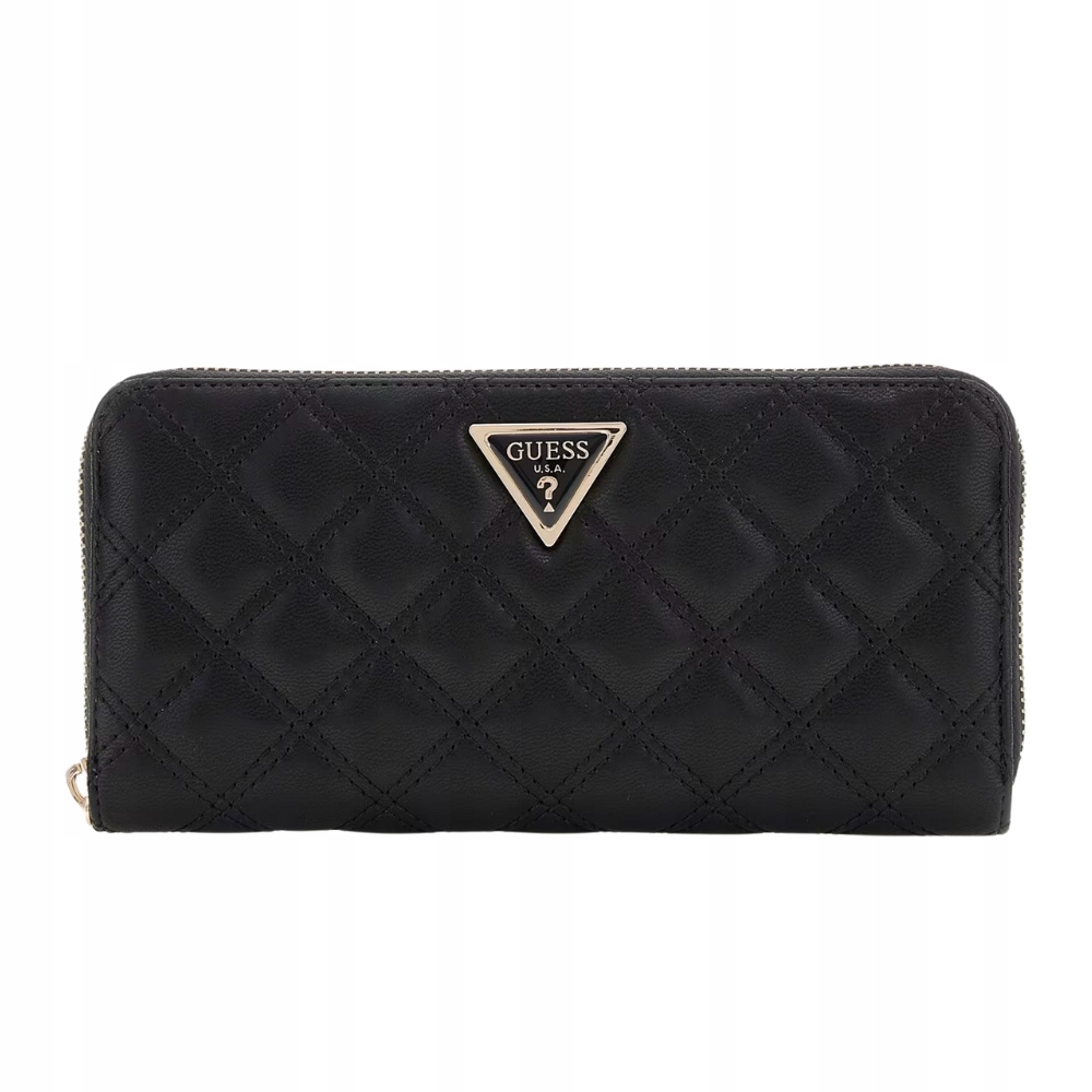 Чорний жіночий гаманець з екологічної шкіри Guess. Закривається на блискавку, внутрішня кишеня для монет на блискавці, два відділення, 12 слотів для карток, дві накладні кишені та додаткова кишеня на блискавці ззаду.