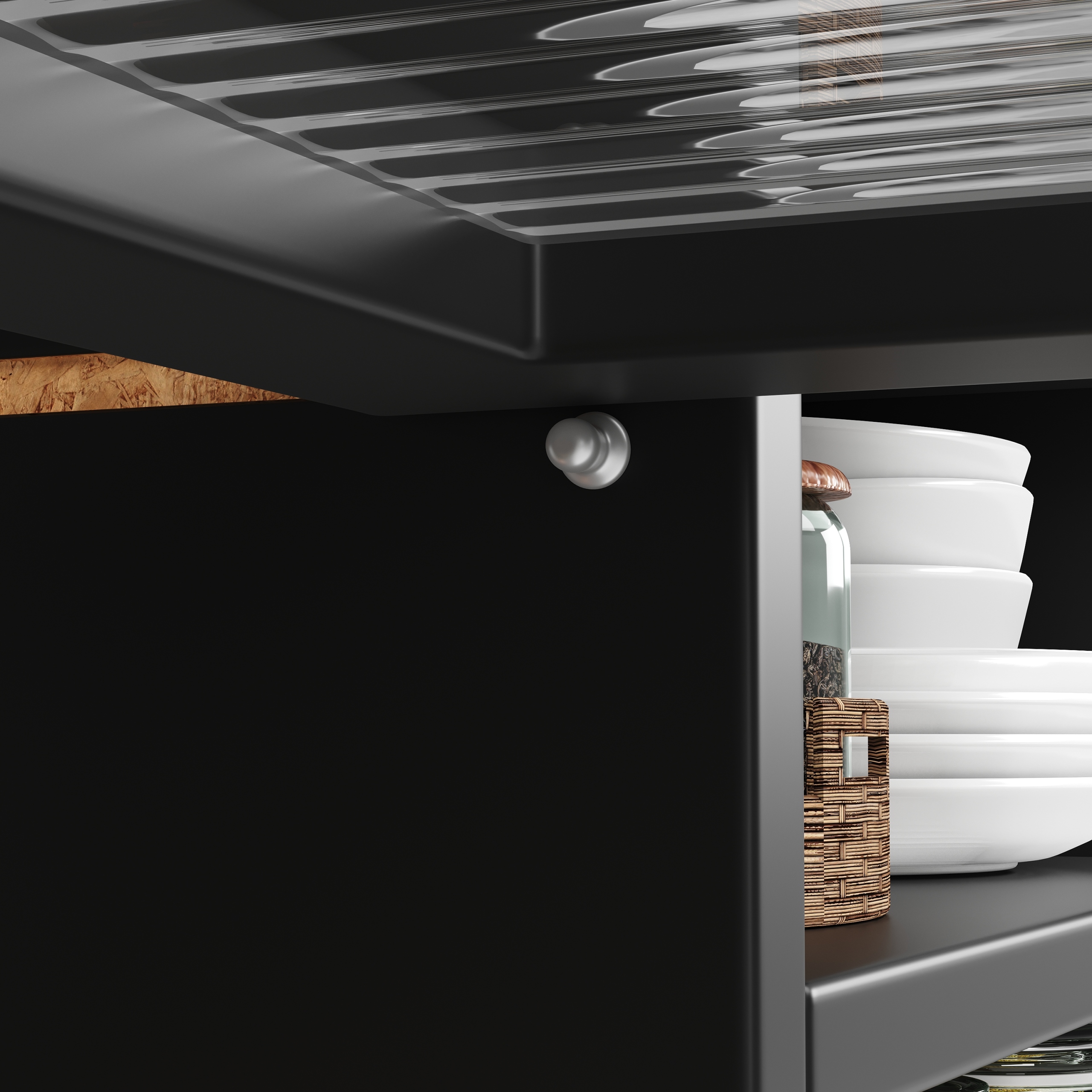 - Прозора структура розділу вгорі дозволяє бачити об'єкти на перший погляд і швидко знайти те, що вам потрібно. У той же час, чорний фон та прозорі розділи створюють різкий контраст, додатково підкреслюючи вишукані та красу предметів.