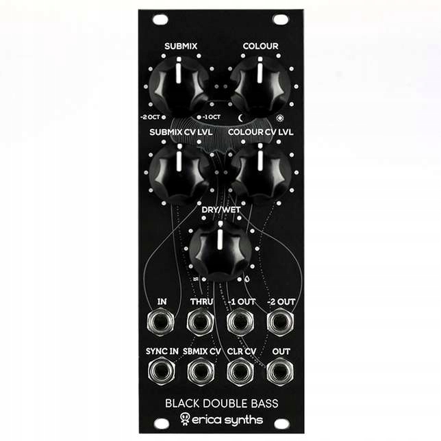 Erica Synths Black Double Bass — це унікальний модуль, який поєднує два транзисторних субосцилятора (-1 і -2 октави) і фільтр нижніх частот. Він не видає звук сам по собі, але перетворить будь-який VCO або біпер на масивний басовий звук із CV-контролем над октавним міксом і частотою зрізу. Вхід синхронізації, який скидає субосцилятори при вхідному імпульсі, забезпечує ще більшу універсальність звукового оформлення. Модуль також може забезпечувати агресивні спотворення, коли використовується з ударними звуками, як-от бас-барабани.
