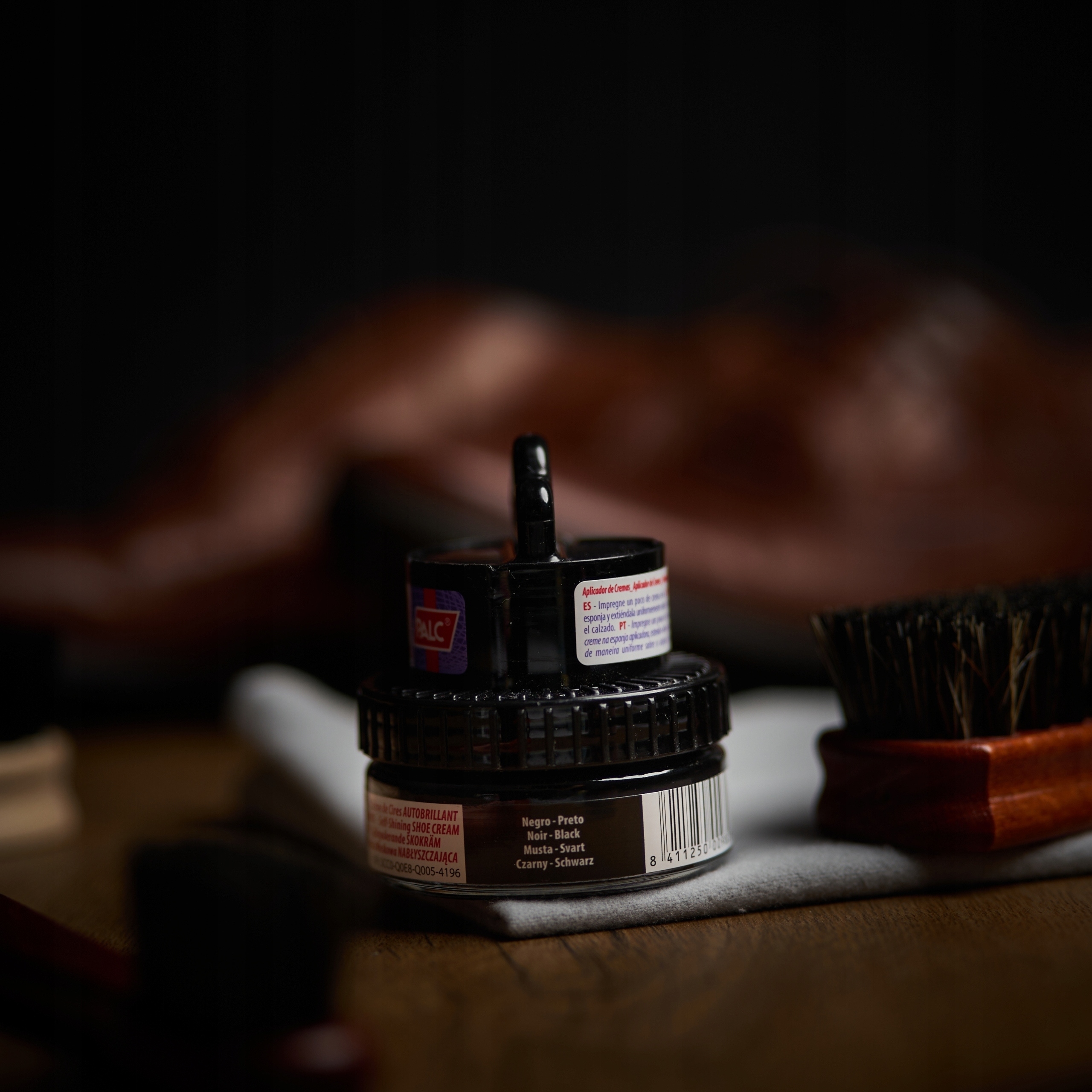1️⃣ Нанесіть невелику кількість поліролю або воску на взуття та розподіліть його чистою частиною тканини.
