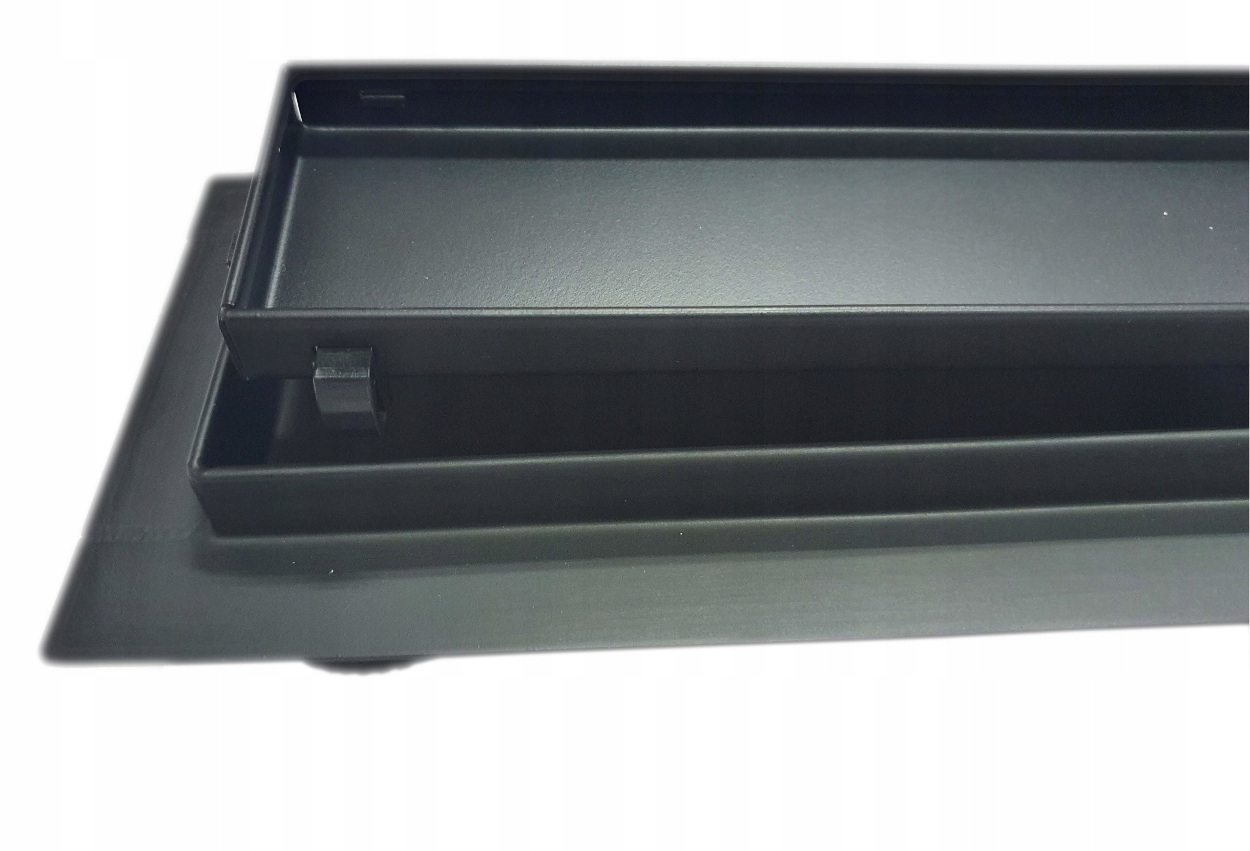 Чорний, комплектний лінійний душовий злив 60 см x 7 см + двостороння решітка. Решітка приклеюється з одного боку до будь-якої плитки після перевертання, повна сталь