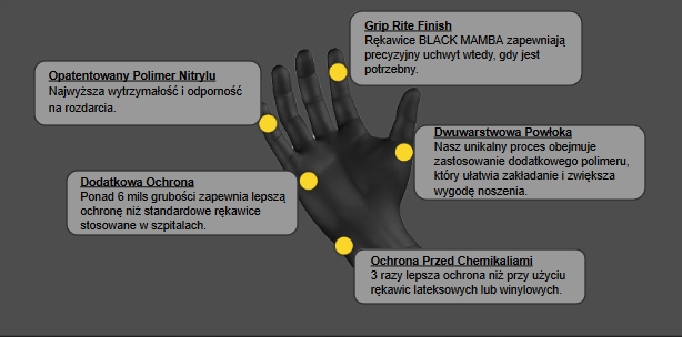 Виготовлені із запатентованого нітрилового полімеру (Nitrex®), BLACK MAMBA — це дуже міцні нітрилові рукавички, без пудри, які забезпечують стійкість до хімічних речовин і перфорацію в 3 рази вищу, ніж латексні або вінілові рукавички такої ж товщини.