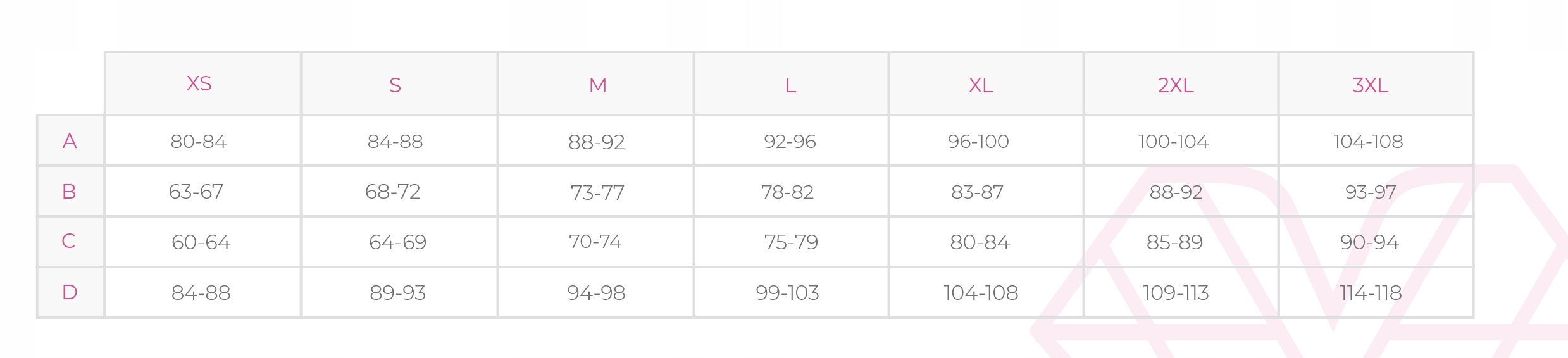 Size table: A: circumference bust (cm) b: circumference under the bust (cm) c: circumference waist (cm) D: окружність стегна (см)