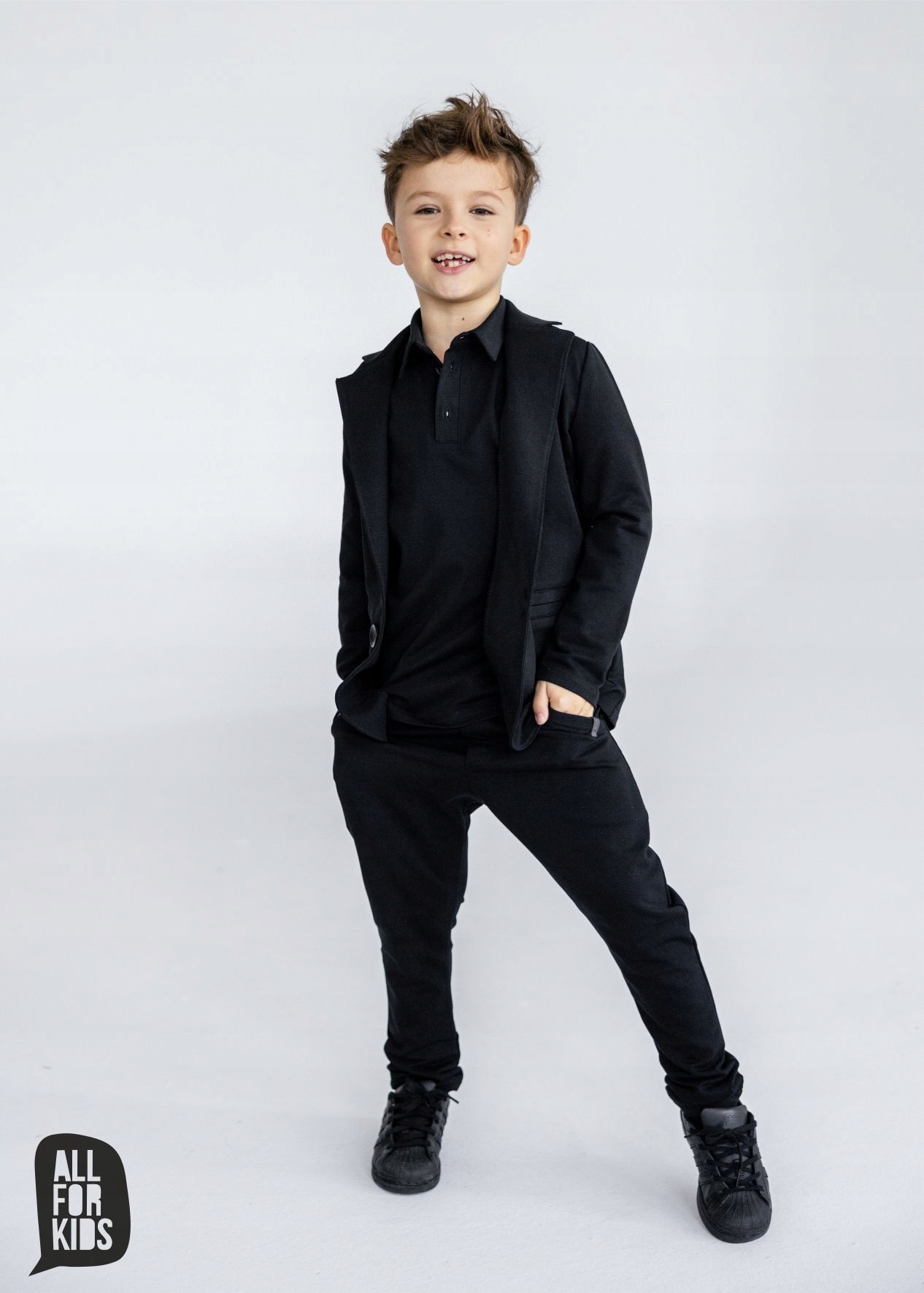 Чорна куртка для шанувальників спортивної елегантності. Модна куртка для хлопчиків була створена в Польщі брендом All For Kids з Preate Tabric, що робить приємним контактом зі шкірою та зручним для носіння. Бренд