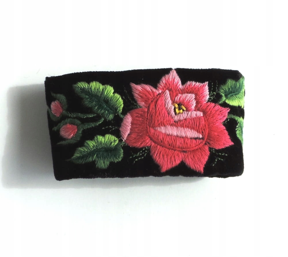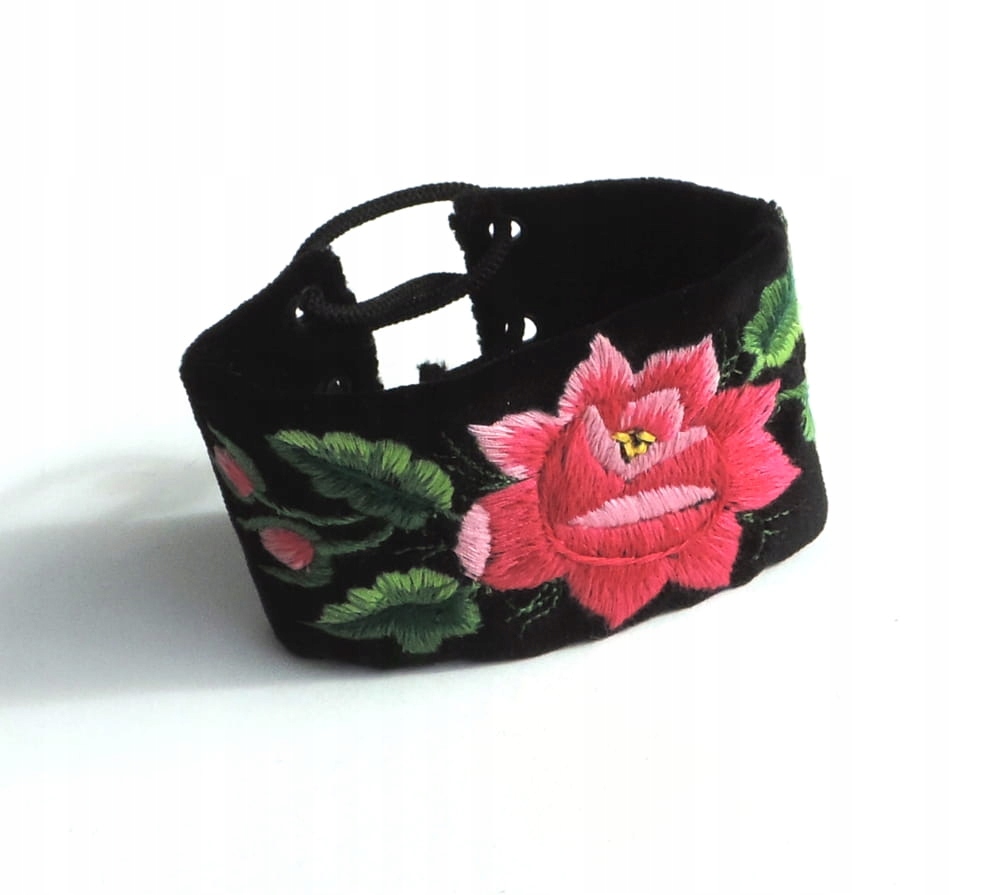Чорний народний браслет - вишивка łowicz Pink Rose - Axamit Hand