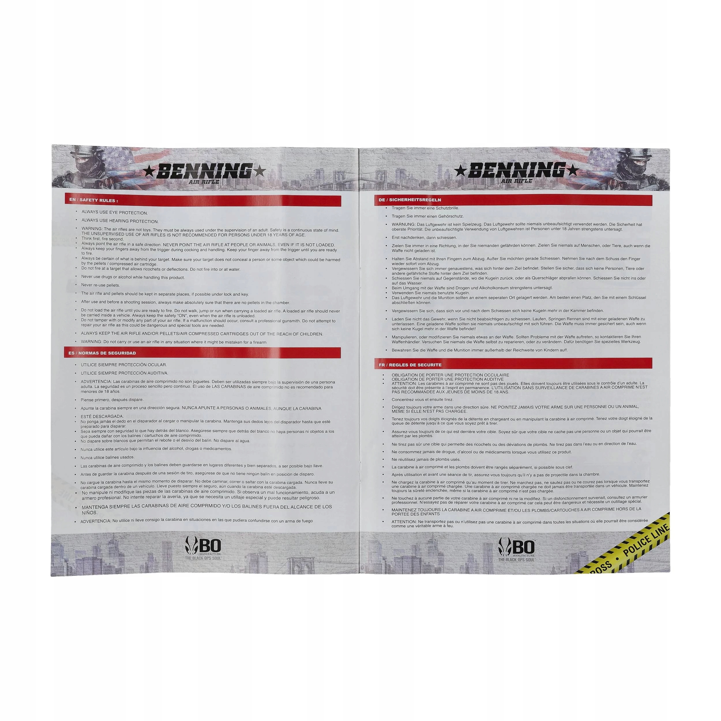 Чорний ОП Беннінг в 4,5 мм калібру - пневматичний вітряк у вигляді гвинтівки. Він характеризується сучасним стилем на основі полімерної, легкої скелета та монтажної залізничної системи. Вітряк використовував колбу з висотою бекону щоки і висувною стопою. У бочці є товща, що живуть полімерна буферна зона, запобігаючи пошкодженню та корозії. Ця модель - це вітряк з високою якістю та точністю, присвячена кожному, хто хоче вдосконалити свої навички зйомки та навчитися стріляти з точного та спорту.