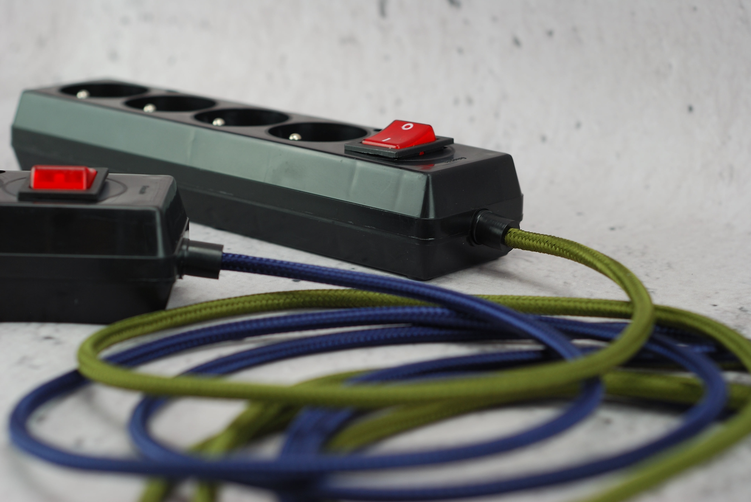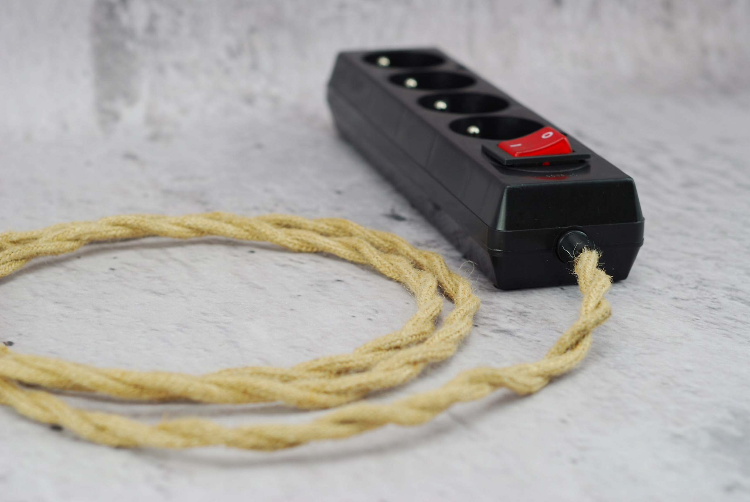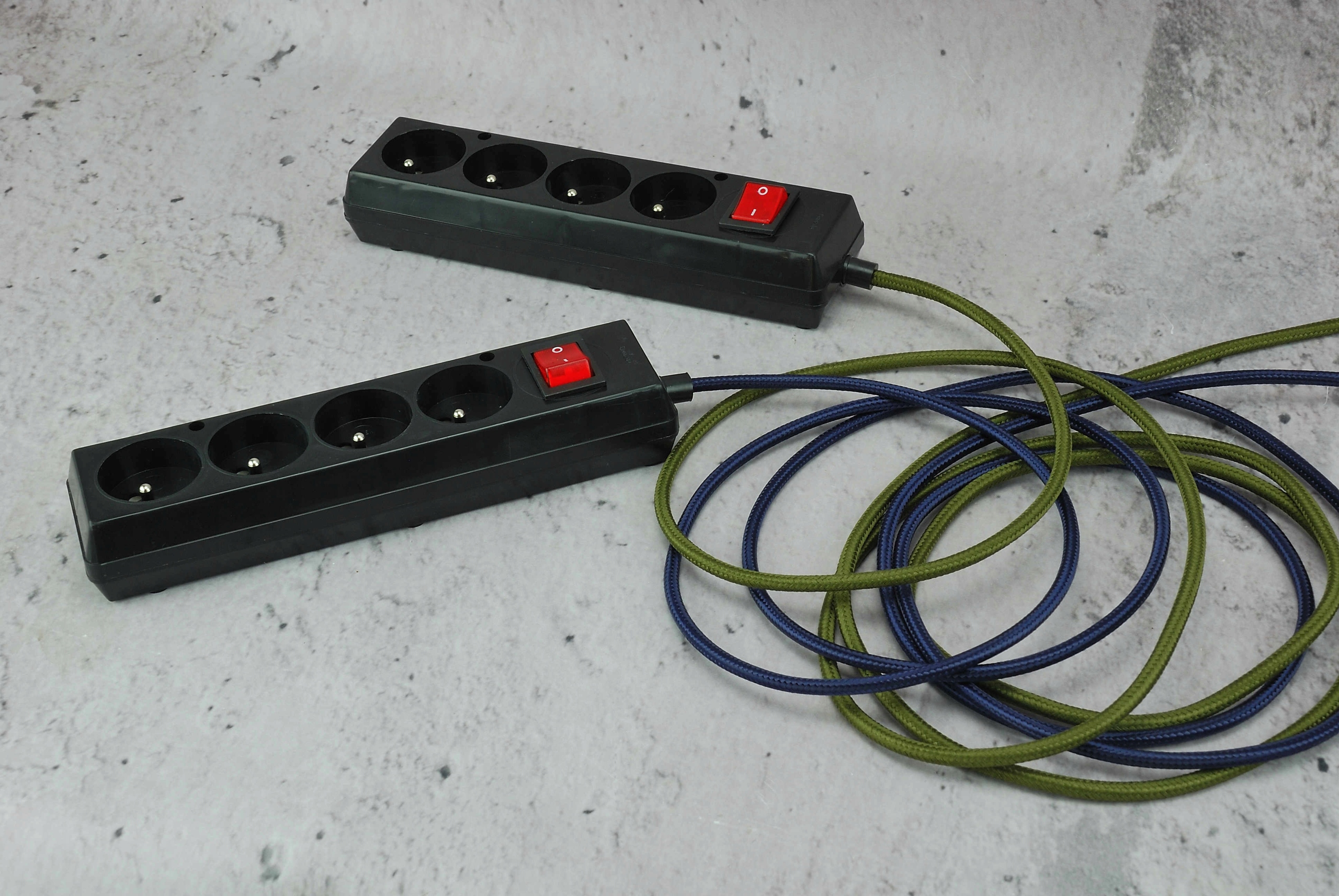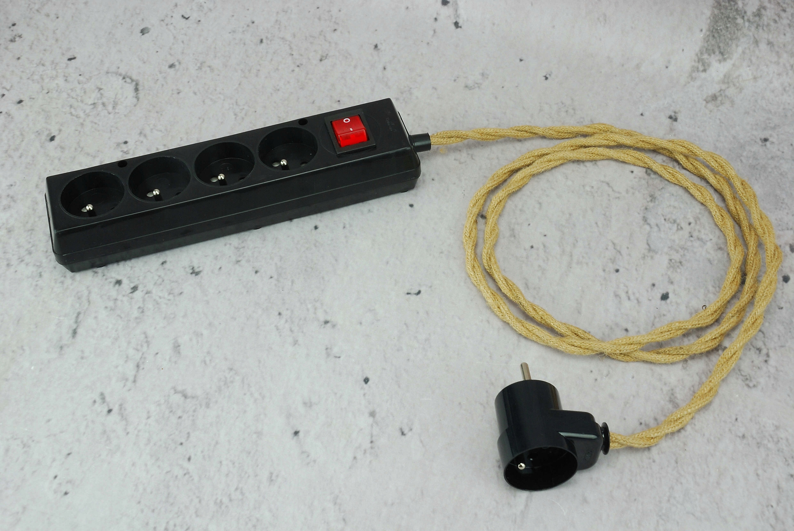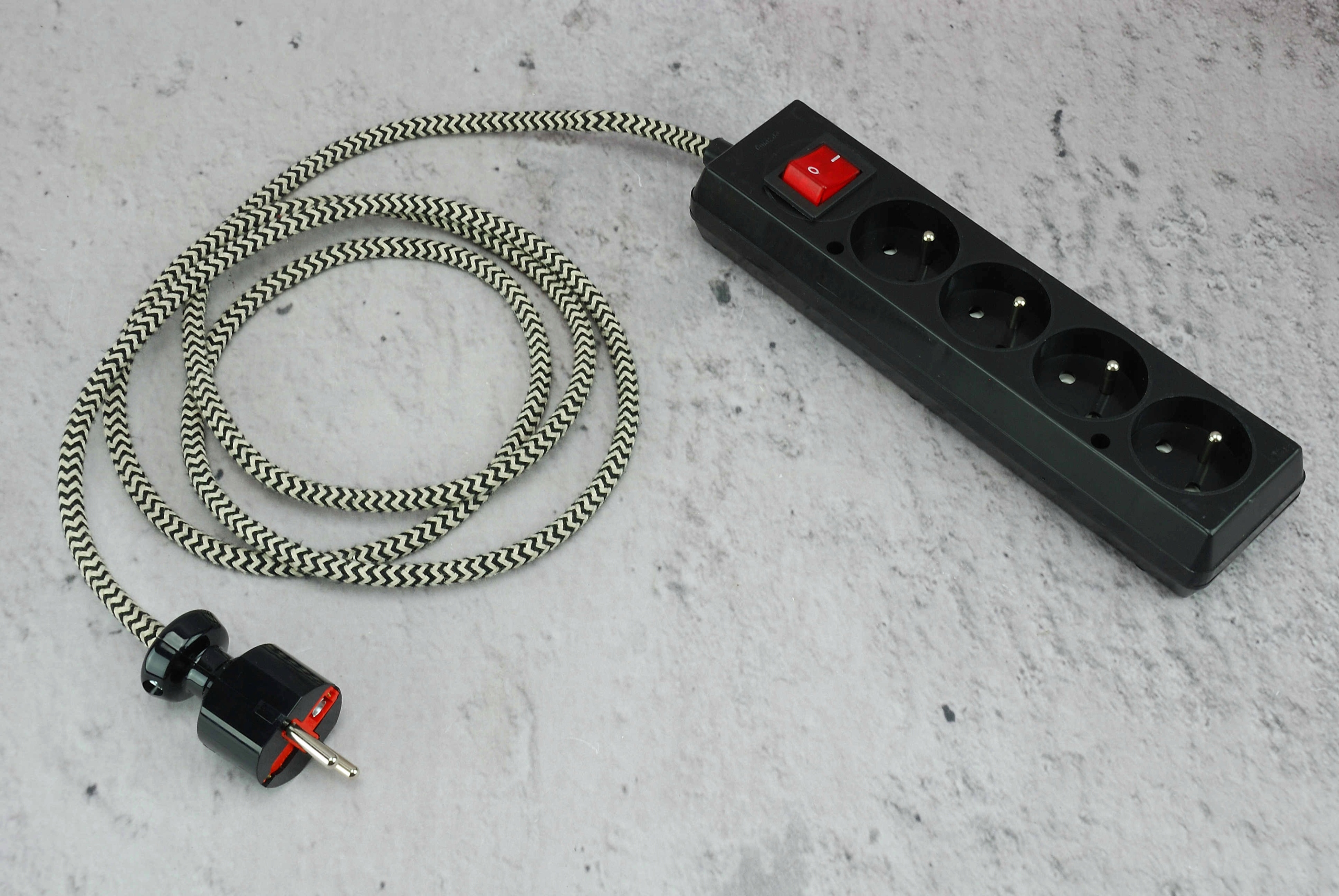 чорний подовжувач із чотирма розетками для кабелю в ретро-оплітці