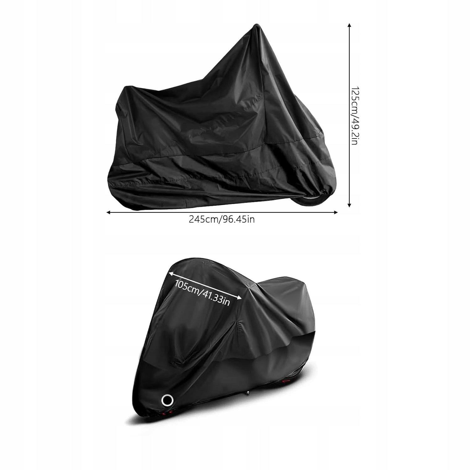 1. Універсальний розмір: 245 x 105 x 125 сантиметрів, підходить для більшості мотоциклів усіх розмірів. Високоякісний матеріал: виготовлений з твердого поліефірного волокна 190T, може захистити мотоцикл від вітру, пилу, дощу, снігу та ультрафіолетового пошкодження