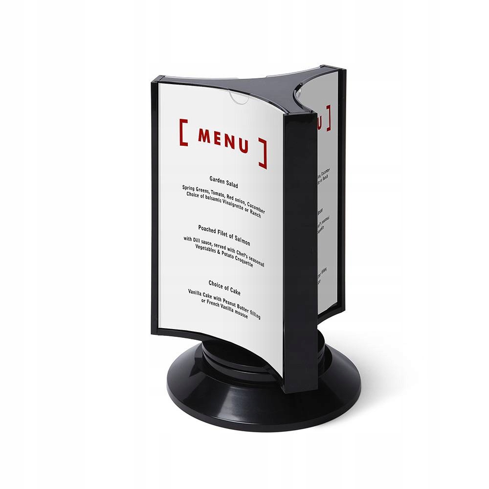 Тристороння поворотна підставка для меню. Завдяки трьом кишеням ви можете надати набагато більше інформації, наприклад: обіднє меню або спеціальну пропозицію. Дуже легкий доступ до кишені дозволяє швидко обмінюватися вмістом.