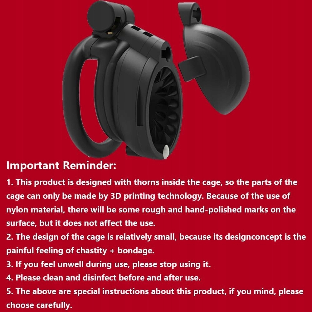 Особливості: внутрішня клітка для цнотливості з шипами, найкращий вибір для катування чоловічої цнотливості. Звернувшись всередину себе, відмовтеся від порнографії. Потім, коли він отримує ерекцію, його найчутливіша плоть жалить, і ви відчуваєте біль. (Не рекомендовано для початківців)