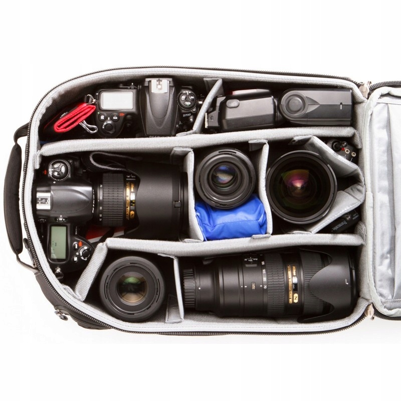 Рюкзак аеропорту з аеропорту з проміжків професійної цифрової дзеркальної камери, 4-6 стандартних масштабів, iPad та 15-дюймового ноутбука. Додатковий простір, наданий цією сумкою, дозволяє взяти 400 мм об'єктив F / 2,8, підключений до корпусу камери, або відключений 500 мм f / 4. Ваше обладнання безпечно розміщується у підкладених перегородках, які можна вільно налаштувати. Комп'ютер безпечно прихований в окремому відсіку, закритому до замку.