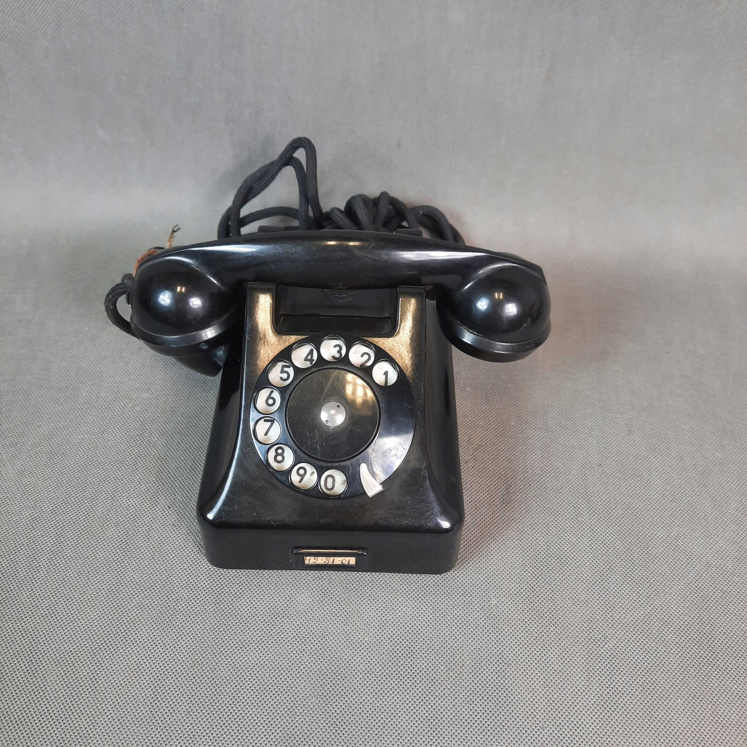 Чорний стаціонарний телефон RWT, має поворотний диск для набору номерів, часто з бакеліту, стан видно на фото