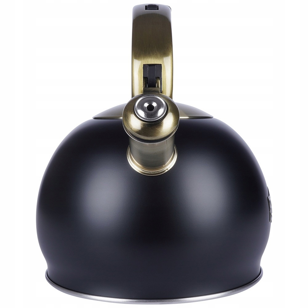 Чайник з автоматичним свистком. Виготовлений з чорної нержавіючої сталі з золотими елементами. Для використання на всіх типах плит.