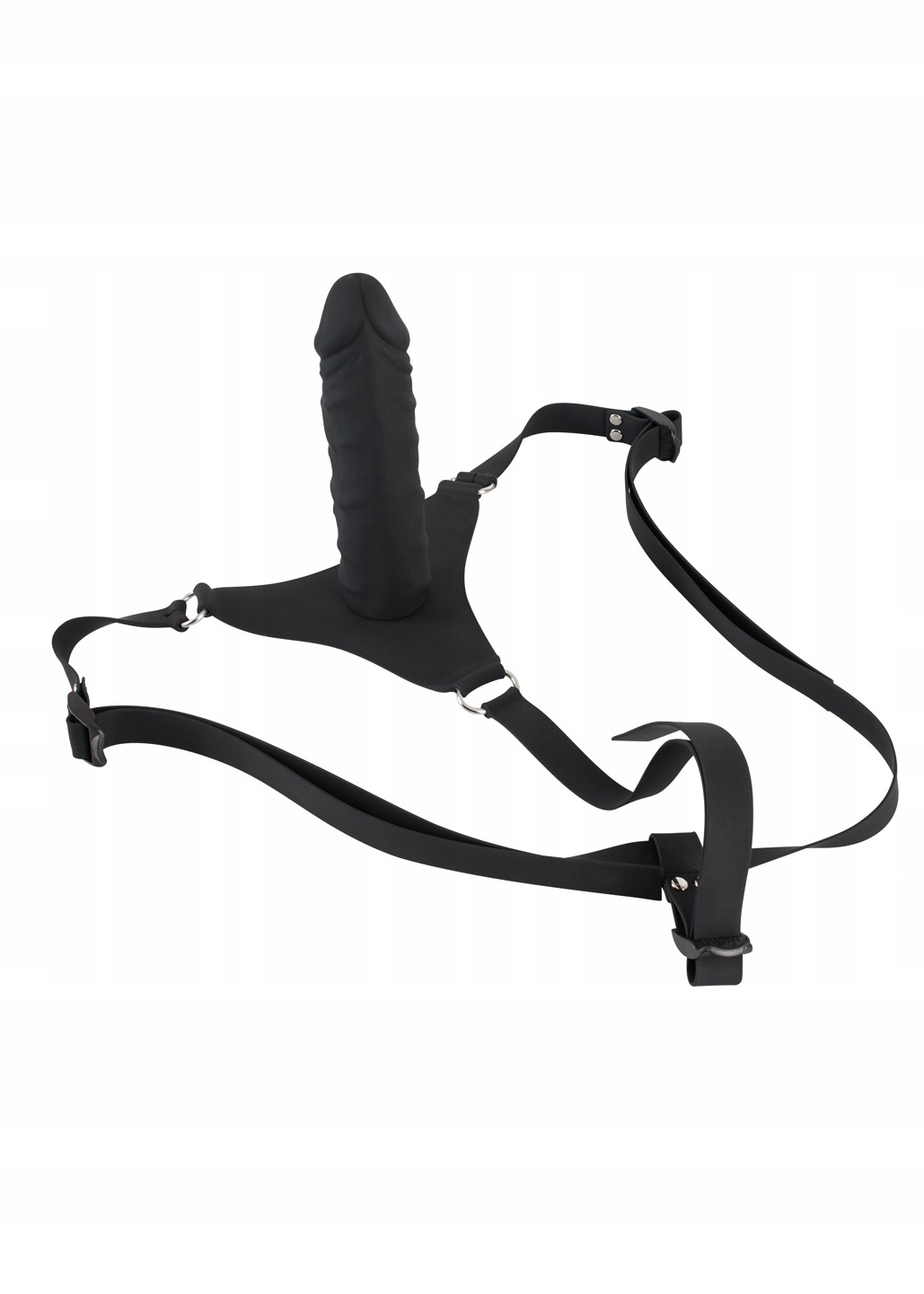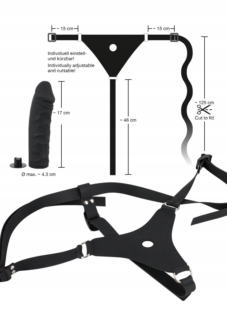 Чорний ремінь з ременем, який можна регулювати та вкорочувати. Короткі ремінці зліва і справа від фалоімітатора. Ремінці мають застібки-пряжки. З великим міцним фалоімітатором з видимими головками та венами. Довжина фалоімітатора 17 см, Ø 4,3 см. Матеріал: силікон, метал, ABS