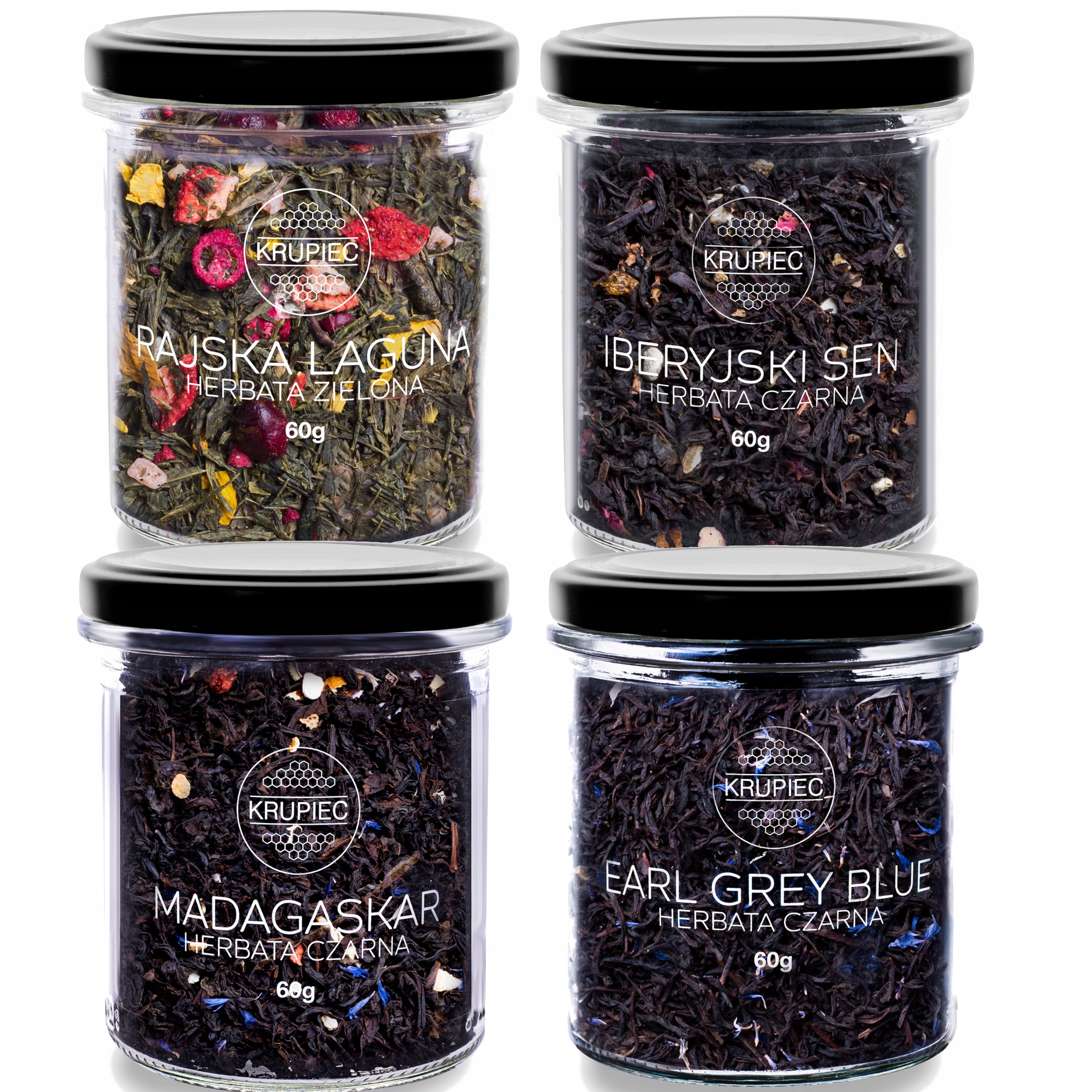 - Чаї торгової марки Krupiec упаковані в елегантні баночки з чорними кришками