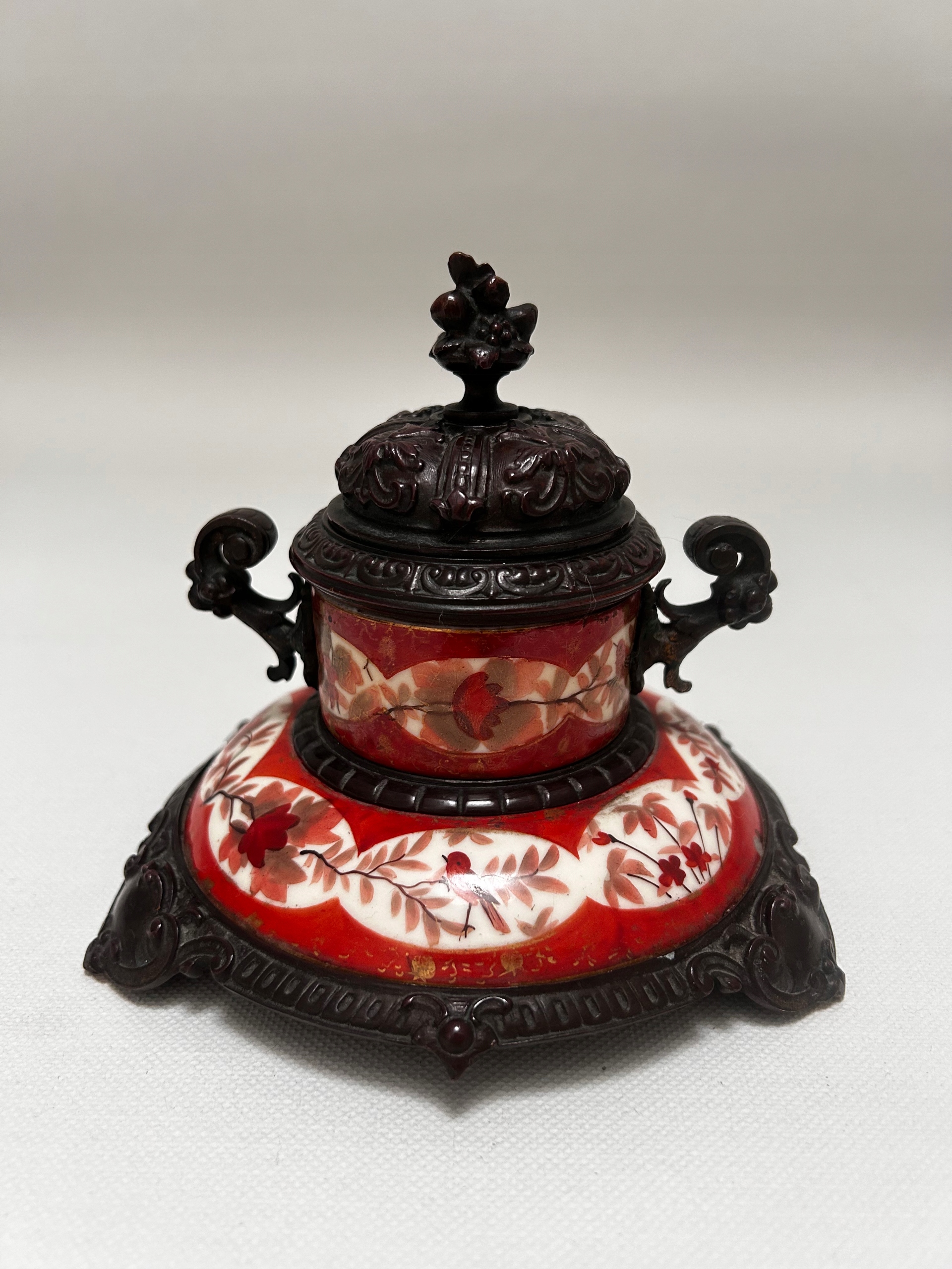 Чорнильниця з бронзи, прикрашена червоно-білими малюнками птахів, гілочок і квітів. Багато декорована кришка, ручки та основа.
