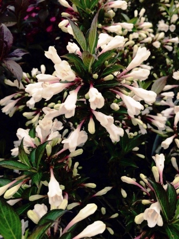 Карликовий, компактний кущ з надзвичайним контрастом між темним листям і світлими квітами. Пагони фіолетові, прямостоячі, з дуже короткими міжвузлями. Висота всього 0,3-0,4 м, ширина 0,6-0,8 м. Листки овальної форми із загостреними кінцями, в молодості темно-зелені, у розвитку пурпурно-червоні. Квітки дзвонові з напівзрощеною чашечкою, циліндричні, 5-складні, білі з пурпуровою трубкою, що становить основу квітки, VI. Квітки зібрані в невеликі волоті, ростуть в пазухах листків на дуже коротких бічних пагонах, уздовж торішніх гілок. Сонячне або злегка затінене місце. Переносить всі вологі та родючі садові ґрунти, від кислих до слаболужних. Сорт відносно морозостійкий, але в суворі зими вимерзає. Рекомендується для висаджування в садах, парках і на житлових масивах, на клумбах у поєднанні з іншими низькими чагарниками та багаторічними рослинами. Придатний для вирощування в контейнерах, але потребує зимового захисту.